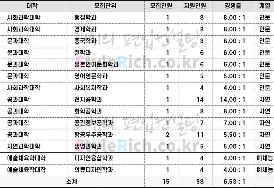 인문 경쟁률 TOP3 학과: 사학과, 문화콘텐츠문화경영학과, 행정학과
