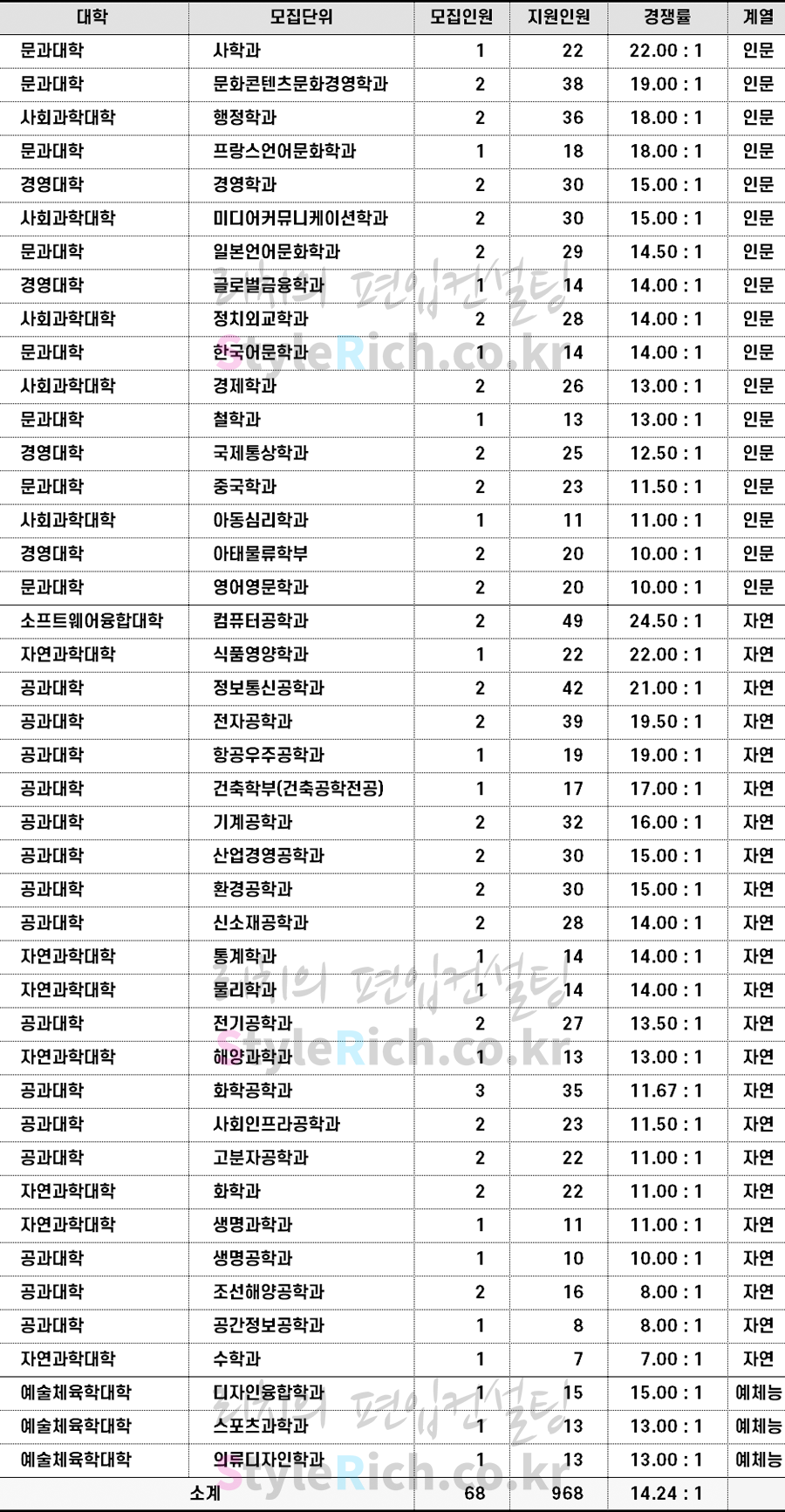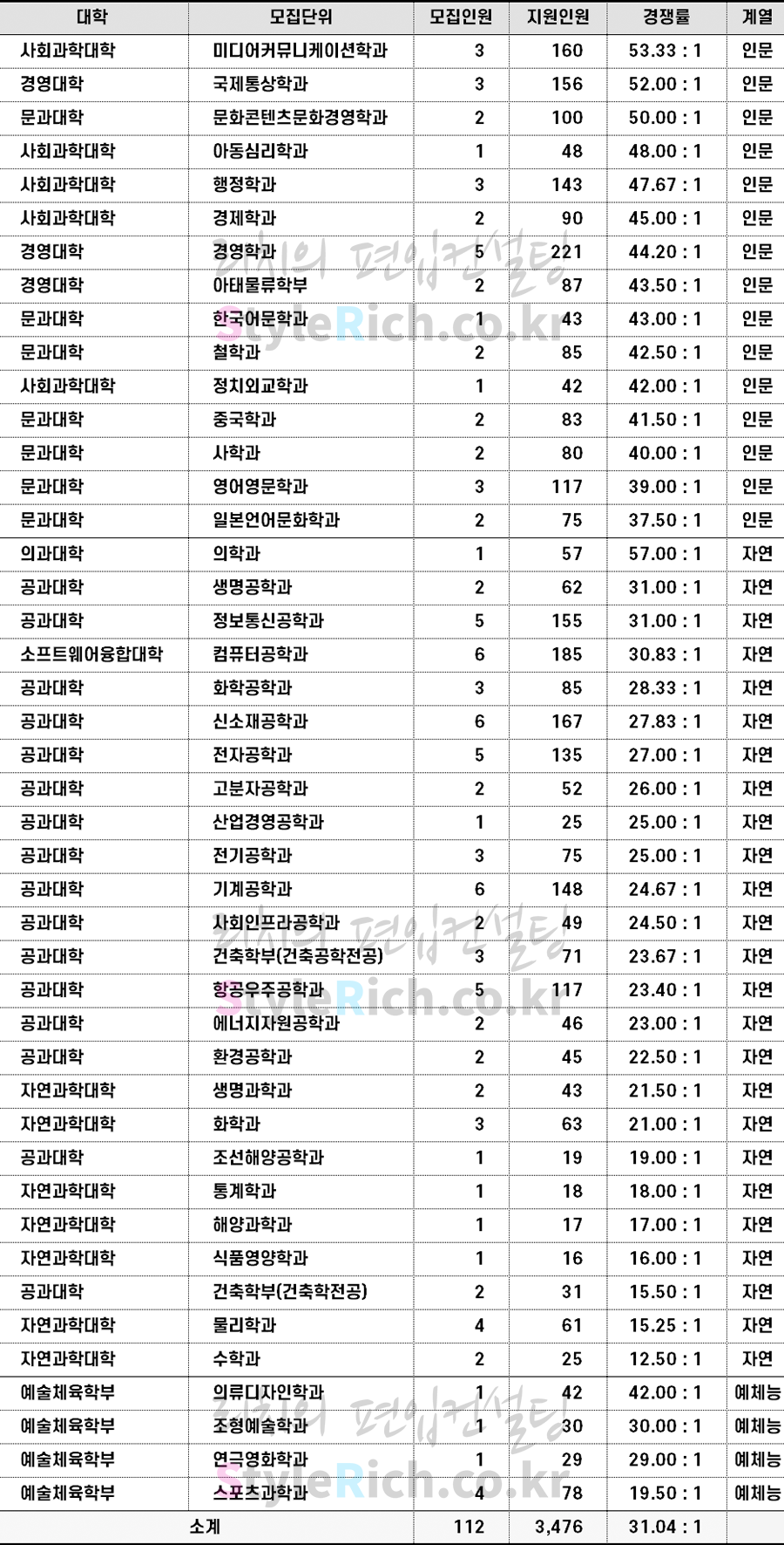 인문 경쟁률 TOP3 학과: 미디어커뮤니케이션학과, 국제통상학과, 문화콘텐츠문화경영학과
