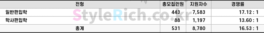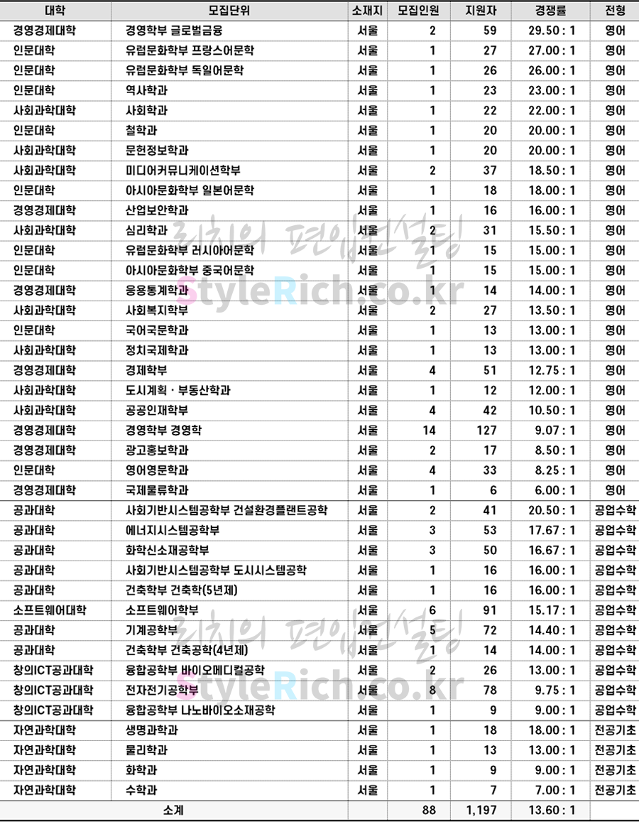 영어전형 경쟁률 TOP3 학과: 경영학부 글로벌금융, 유럽문화학부 프랑스어문학, 유럽문화학부 독일어문학
