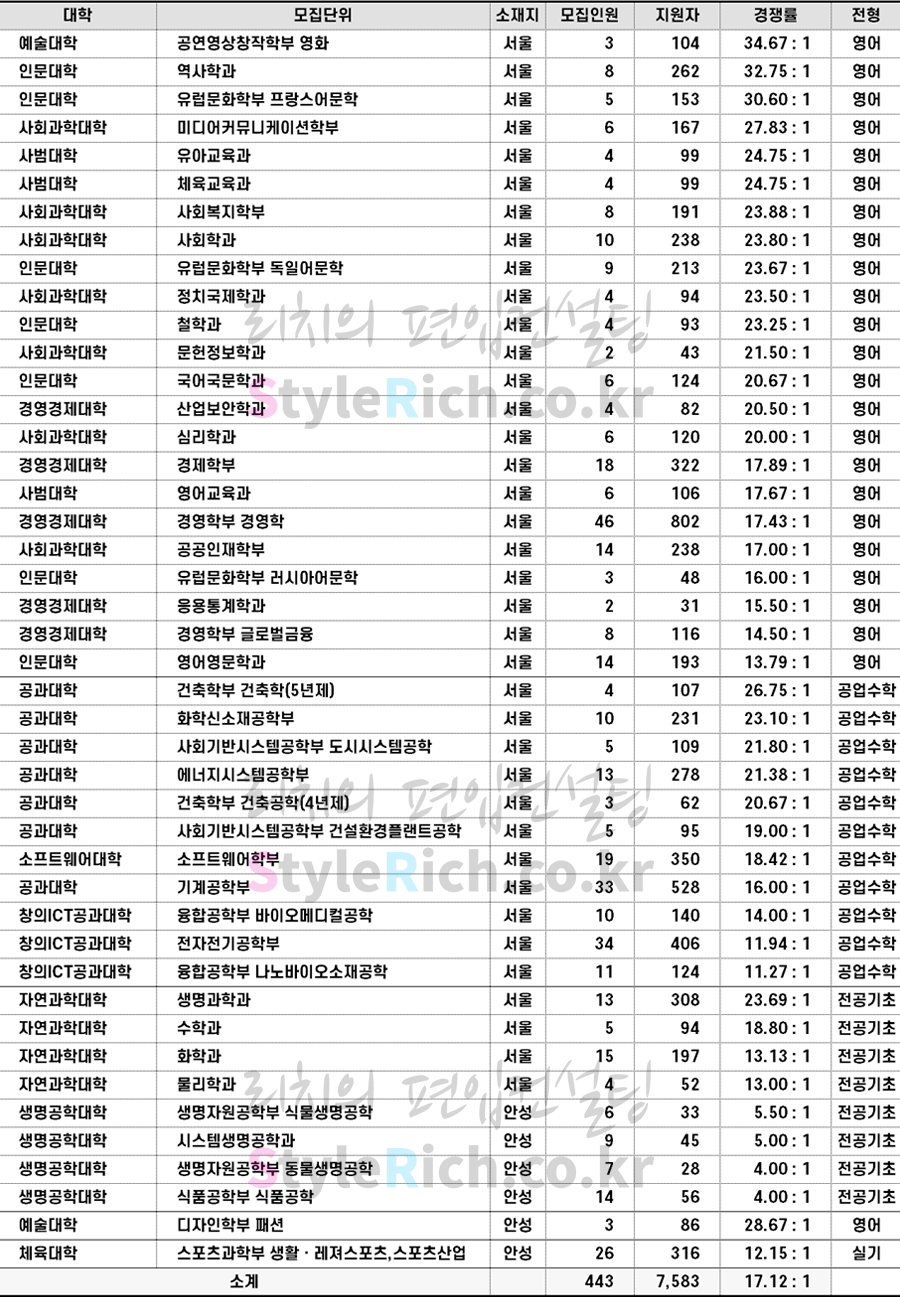 영어전형 경쟁률 TOP3 학과: 공연영상창작학부 영화, 역사학과, 유럽문화학부 프랑스어문학