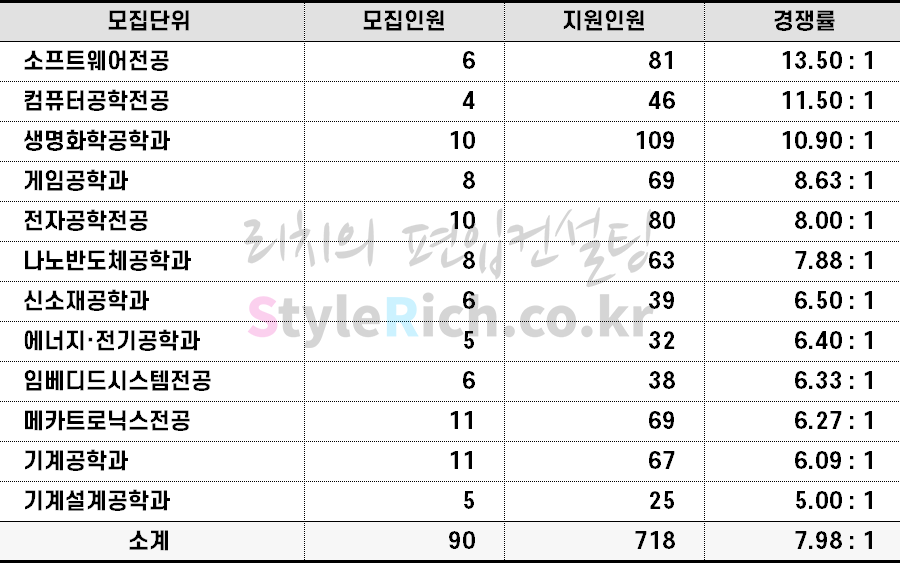 경쟁률 TOP3 학과: 소프트웨어전공, 컴퓨터공학전공, 생명화학공학과