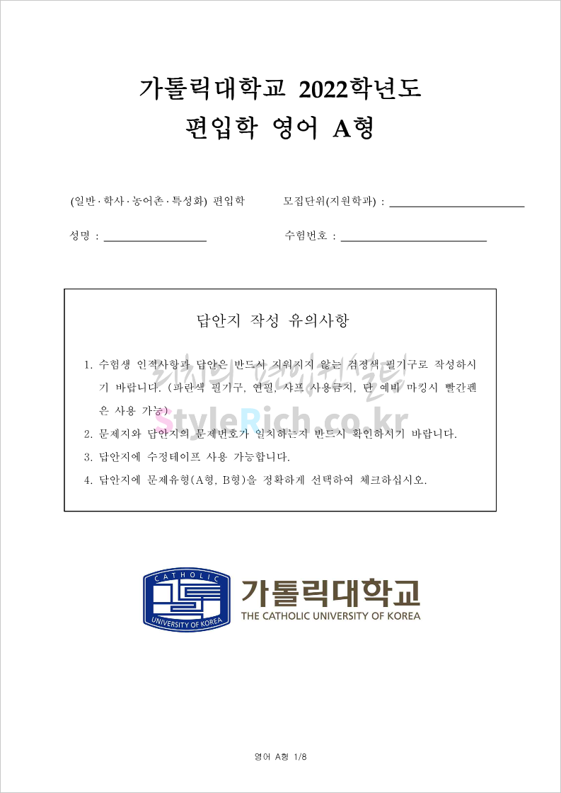 가톨릭대 편입 2022학년도 기출문제가 궁굼하다면?