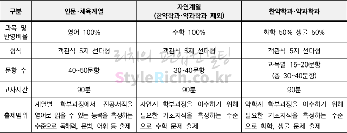 2022학년도 경희대 편입 인문·체육계열 영어 필답고사는 40문항/90분, 객관식 5지선다형, 총점 100점 만점에 문항 당 배점은 1점, 2.7점, 2.3점, 5점으로 다르고, 자연계열 수학 필답고사는 30문항/90분, 객관식 5지선다형, 총점 100점 만점에 문항당 배점은 2점, 3.3점, 4.5점, 5점으로 다르며, 한약학과·약과학과 화학, 생물 필답고사는 총 30문항(화학 15문항, 생물 15문항), 객관식 5지선다형, 총점 100점 만점에 문항 당 배점은 2점, 3점, 5점으로 다릅니다.