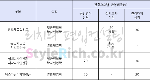 2022학년도 덕성여대 편입 일반편입과 학사편입의 생활체육학전공 전형방법은 실기고사 70%, 전적대학 성적 30%, 일반편입의 동양화전공, 서양화전공 전형방법은 실기고사 100%, 일반편입과 학사편입의 실내디자인전공, 시각디자인전공 전형방법은 공인영어 70%, 전적대학 성적 30%, 일반편입의 텍스타일디자인전공 전형방법은 공인영어 70%, 전적대학 성적 30%입니다.