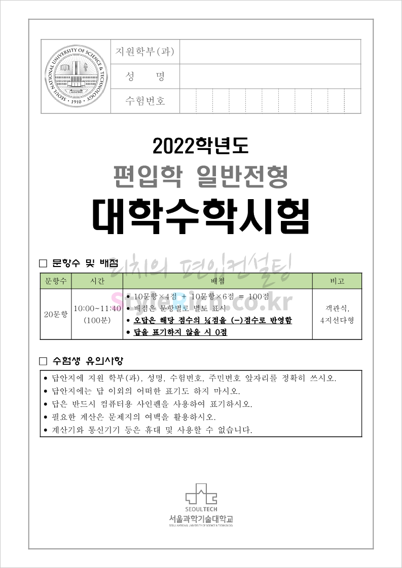 * 2023학년도 서울과학기술대 편입 대학수학시험 출제 및 채점기준은 객관식 5지선다형, 오답은 해당 점수의 1/5을 (-)점수로 반영하는 것으로 변경됩니다.