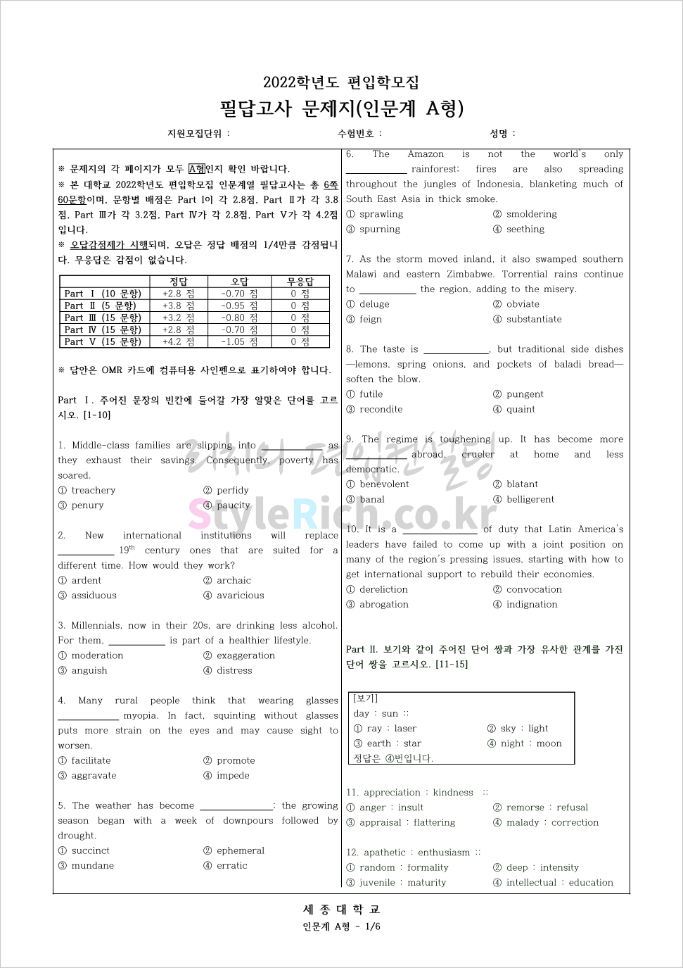 2022학년도 세종대 편입 영어 필답고사는 60문항/100분, 객관식 4지선다형, 총점 200점 만점에 문항 당 배점은 1~10번 2.8점, 11~15번 3.8점, 16~30번 3.2점, 31~45번 2.8점, 46~60번 4.2점으로 다릅니다. 수학 필답고사는 25문항/100분, 객관식 4지선다형, 총점 200점 만점에 1~4번 7.1점, 5~8번 7.4점, 9~12번 7.7점, 13~16번 8.1점, 17~20번 8.5점, 21~23번 8.8점, 24~25번 9.2점으로 다릅니다.