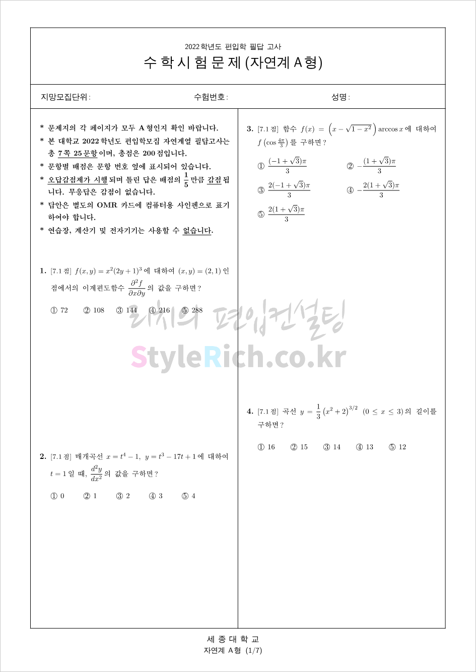 2022학년도 세종대 편입 기출문제를 살펴보겠습니다.