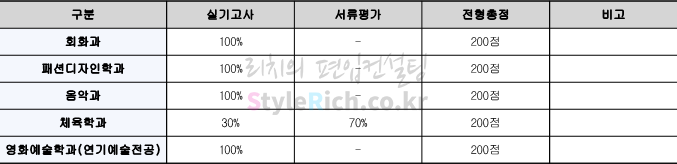 2022학년도 세종대 편입 회화과, 패션디자인학과, 음악과, 영화예술학과(연기예술전공) 전형방법은 실기고사 100%이고, 체육학과 전형방법은 실기고사 30%, 서류평가 70%입니다.