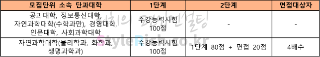 2022학년도 아주대 학사편입의 공과대학, 정보통신대학, 자연과학대학(수학과만), 경영대학, 인문대학, 사회과학대학 전형방법은 1단계 수강능력시험 100점이고, 자연과학대학(물리학과, 화학과, 생명과학과) 전형방법은 1단계 수강능력시험 100점, 2단계 1단계 80점, 면접 20점입니다.