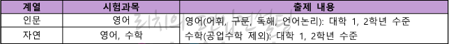 출제내용은 영어 수강능력시험은 어휘, 구문, 독해, 언어논리로 대학 1,2학년 수준이고, 수학 수강능력시험은 대학 1,2학년 수준으로 공업수학은 제외됩니다.