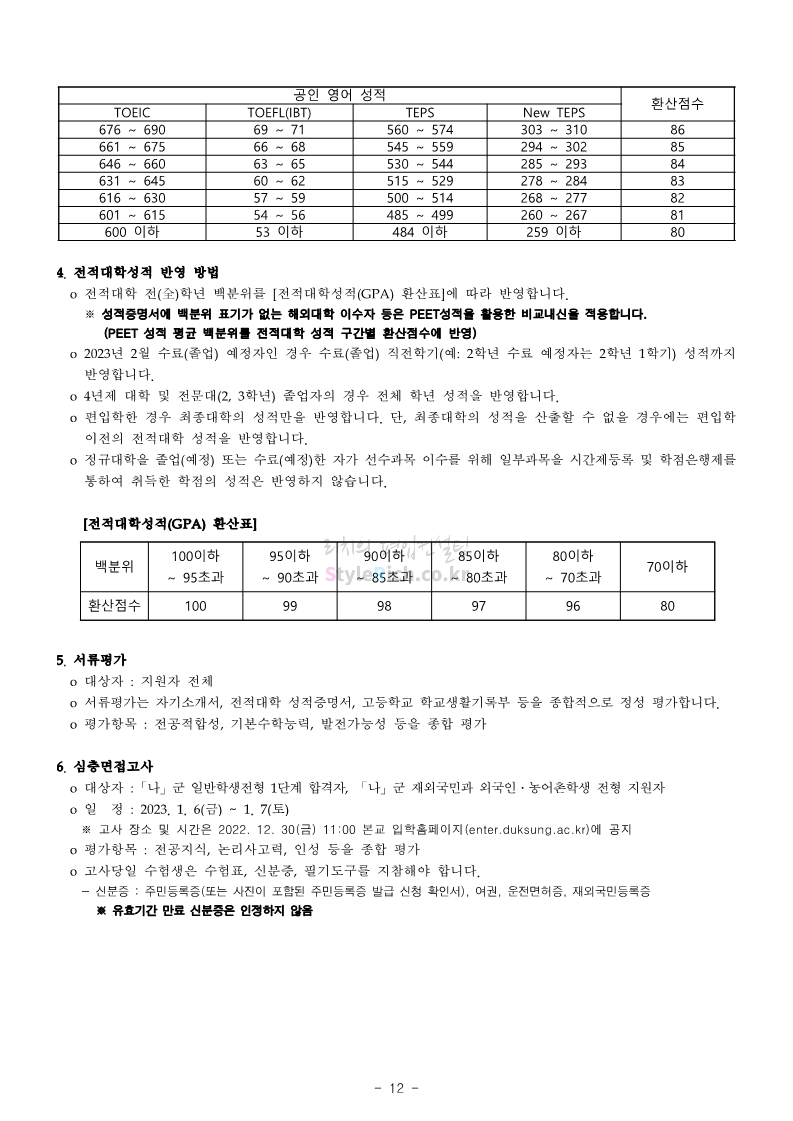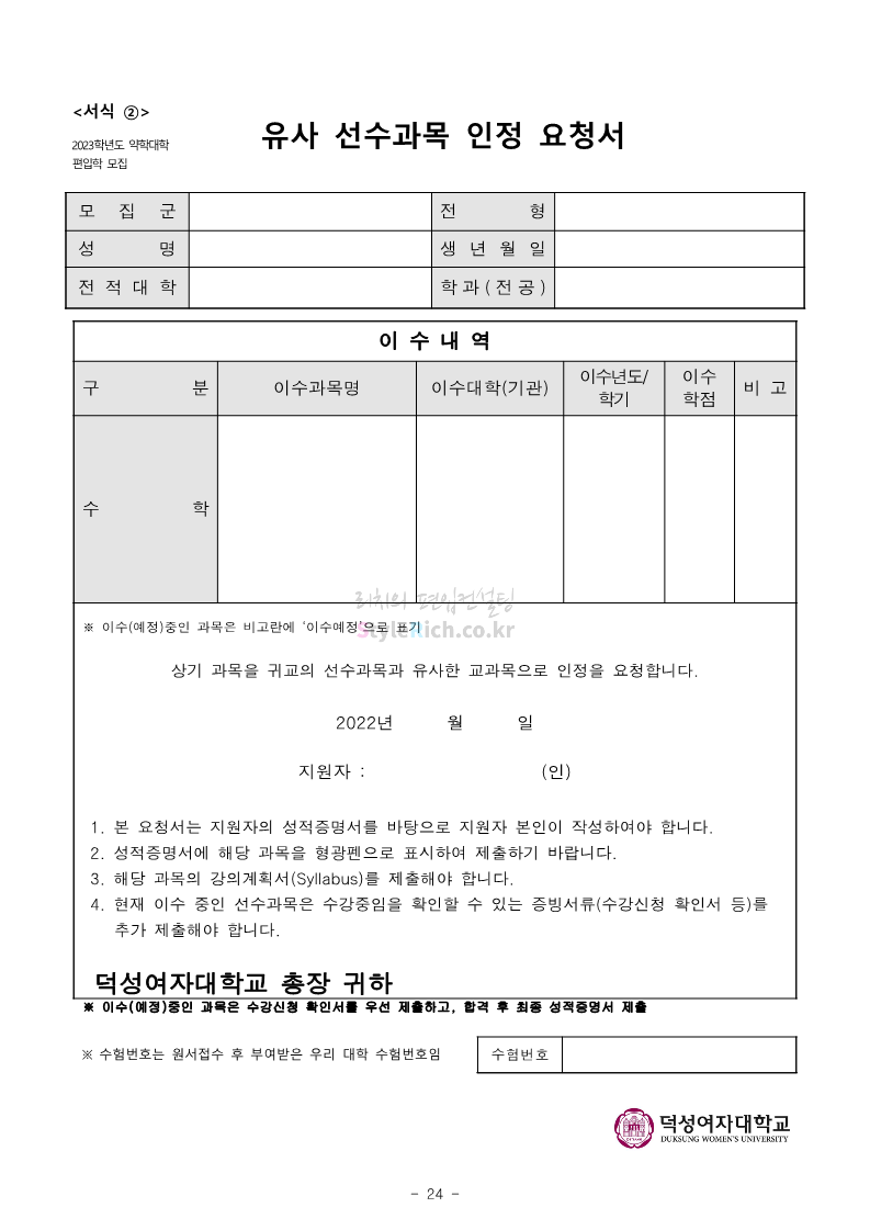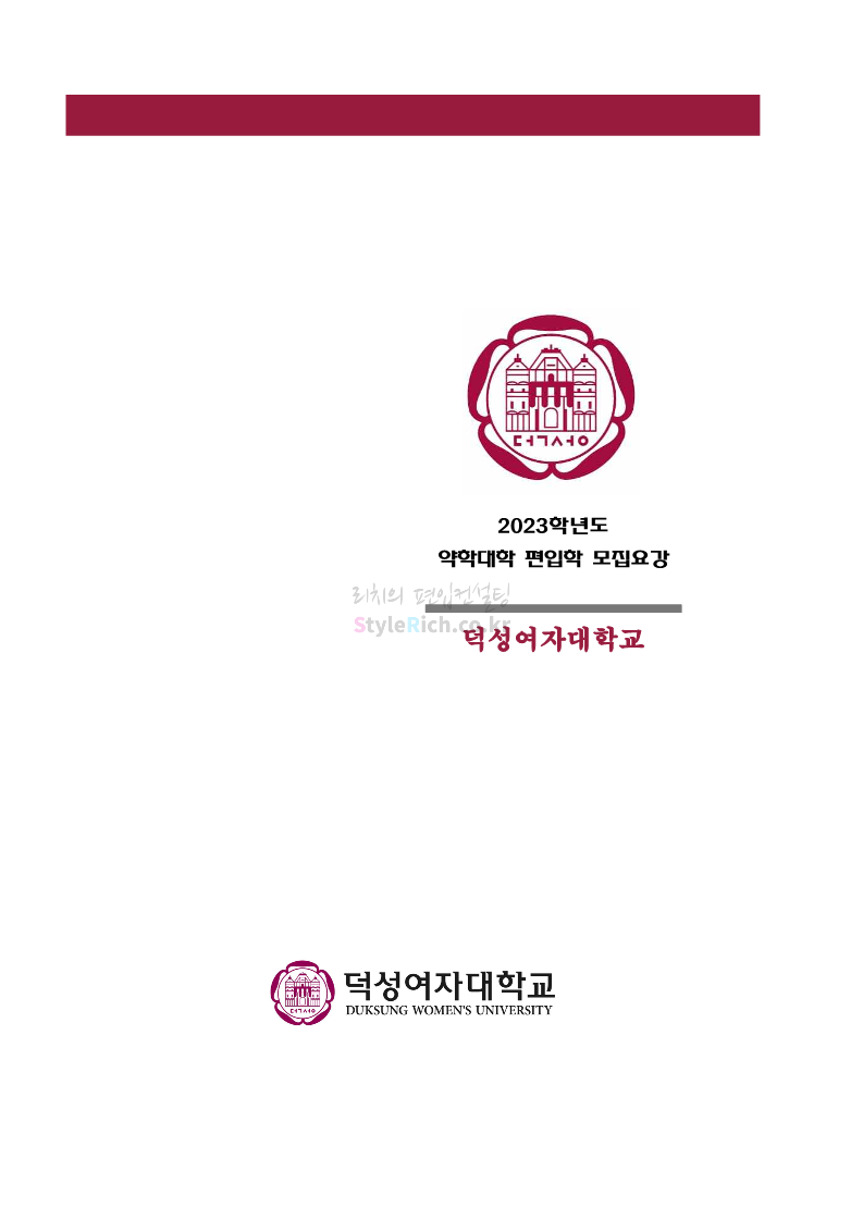 덕성여대 약대편입 2023학년도 모집요강 간편하게 보자! 2022.09.10 13:02 약대편입 모집요강/2023학년도 약대 모집요강 2023학년도 덕성여대 약대편입 모집요강(2022.08.05 기준)을 간편하게 확인하세요. * 최종 모집요강 발표 이후에도 내용의 일부가 변경될 수 있으니 지원 전 반드시 덕성여대 입학처의 모집요강을 확인 바랍니다. 2023학년도 덕성여대 약대편입 모집요강 다운받기 <출처: 덕성여대> 2022학년도 덕성여자대학교 홍보동영상 공유하기 게시글 관리 리치의 편입컨설팅 저작자표시 비영리 변경금지 (새창열림) '약대편입 모집요강 > 2023학년도 약대 모집요강' 카테고리의 다른 글 동덕여대 약대편입 2023학년도 모집요강 간편하게 보자! (0) 2022.09.10 동국대 약대편입 2023학년도 모집요강 간편하게 보자! (0) 2022.09.10 단국대(천안) 약대편입 2023학년도 모집요강 간편하게 보자! (0) 2022.09.10 고려대(세종) 약대편입 2023학년도 모집요강 간편하게 보자! (0) 2022.09.10 경희대 약대편입 2023학년도 모집요강 간편하게 보자! (0) 2022.09.10 댓글 공유하기 다른 글 댓글 이 글 공유하기 구독하기 구독하기 카카오톡 카카오톡 라인 라인 트위터 트위터 Facebook Facebook 카카오스토리 카카오스토리 밴드 밴드 네이버 블로그 네이버 블로그 Pocket Pocket Evernote Evernote 다른 글 동덕여대 약대편입 2023학년도 모집요강 간편하게 보자! 동덕여대 약대편입 2023학년도 모집요강 간편하게 보자! 2022.09.10 동국대 약대편입 2023학년도 모집요강 간편하게 보자! 동국대 약대편입 2023학년도 모집요강 간편하게 보자! 2022.09.10 단국대(천안) 약대편입 2023학년도 모집요강 간편하게 보자! 단국대(천안) 약대편입 2023학년도 모집요강 간편하게 보자! 2022.09.10 고려대(세종) 약대편입 2023학년도 모집요강 간편하게 보자! 고려대(세종) 약대편입 2023학년도 모집요강 간편하게 보자! 2022.09.10 다른 글 더 둘러보기
