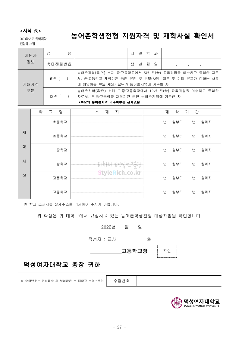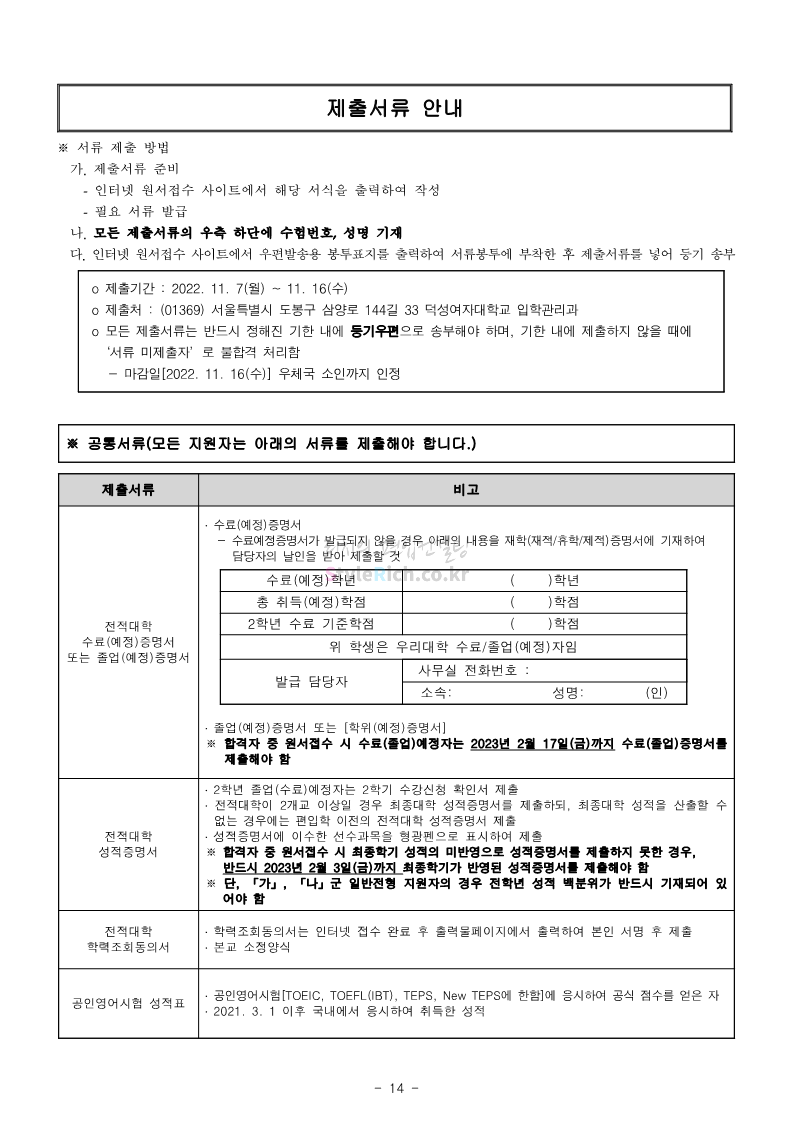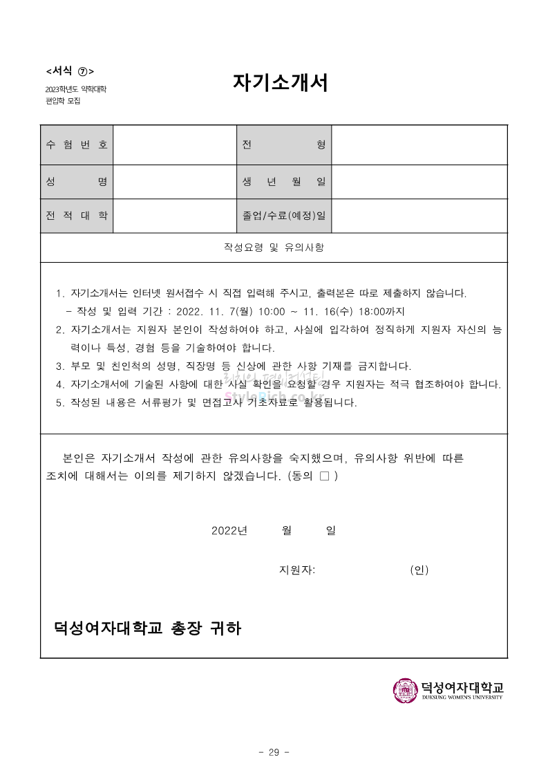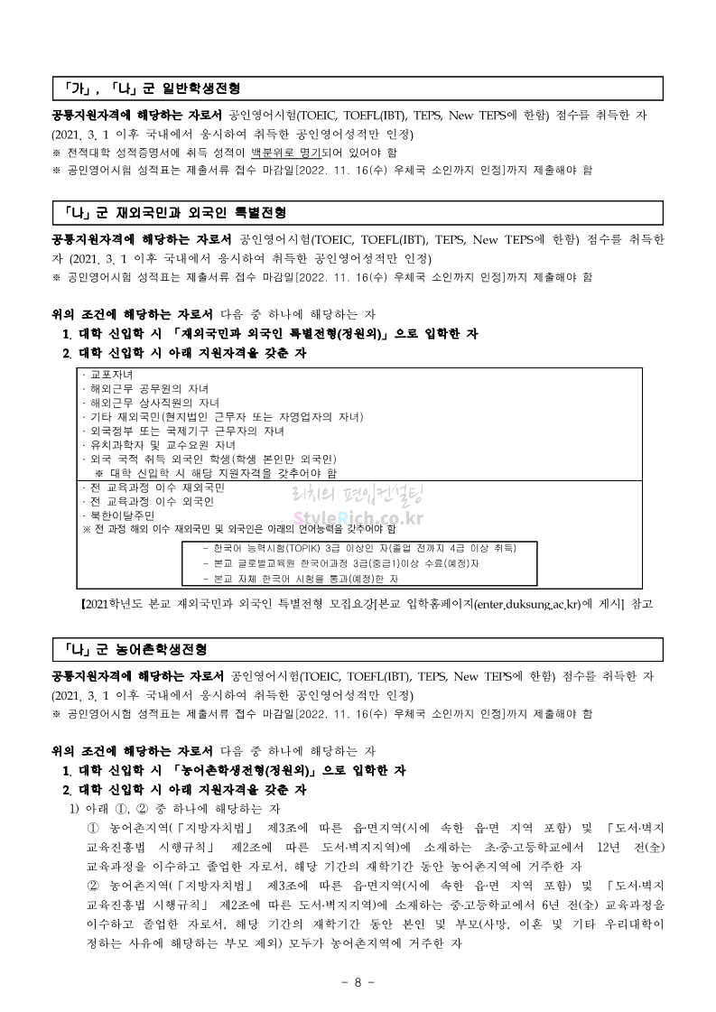 덕성여대 약대편입 2023학년도 모집요강 간편하게 보자! 2022.09.10 13:02 약대편입 모집요강/2023학년도 약대 모집요강 2023학년도 덕성여대 약대편입 모집요강(2022.08.05 기준)을 간편하게 확인하세요. * 최종 모집요강 발표 이후에도 내용의 일부가 변경될 수 있으니 지원 전 반드시 덕성여대 입학처의 모집요강을 확인 바랍니다. 2023학년도 덕성여대 약대편입 모집요강 다운받기 <출처: 덕성여대> 2022학년도 덕성여자대학교 홍보동영상 공유하기 게시글 관리 리치의 편입컨설팅 저작자표시 비영리 변경금지 (새창열림) '약대편입 모집요강 > 2023학년도 약대 모집요강' 카테고리의 다른 글 동덕여대 약대편입 2023학년도 모집요강 간편하게 보자! (0) 2022.09.10 동국대 약대편입 2023학년도 모집요강 간편하게 보자! (0) 2022.09.10 단국대(천안) 약대편입 2023학년도 모집요강 간편하게 보자! (0) 2022.09.10 고려대(세종) 약대편입 2023학년도 모집요강 간편하게 보자! (0) 2022.09.10 경희대 약대편입 2023학년도 모집요강 간편하게 보자! (0) 2022.09.10 댓글 공유하기 다른 글 댓글 이 글 공유하기 구독하기 구독하기 카카오톡 카카오톡 라인 라인 트위터 트위터 Facebook Facebook 카카오스토리 카카오스토리 밴드 밴드 네이버 블로그 네이버 블로그 Pocket Pocket Evernote Evernote 다른 글 동덕여대 약대편입 2023학년도 모집요강 간편하게 보자! 동덕여대 약대편입 2023학년도 모집요강 간편하게 보자! 2022.09.10 동국대 약대편입 2023학년도 모집요강 간편하게 보자! 동국대 약대편입 2023학년도 모집요강 간편하게 보자! 2022.09.10 단국대(천안) 약대편입 2023학년도 모집요강 간편하게 보자! 단국대(천안) 약대편입 2023학년도 모집요강 간편하게 보자! 2022.09.10 고려대(세종) 약대편입 2023학년도 모집요강 간편하게 보자! 고려대(세종) 약대편입 2023학년도 모집요강 간편하게 보자! 2022.09.10 다른 글 더 둘러보기