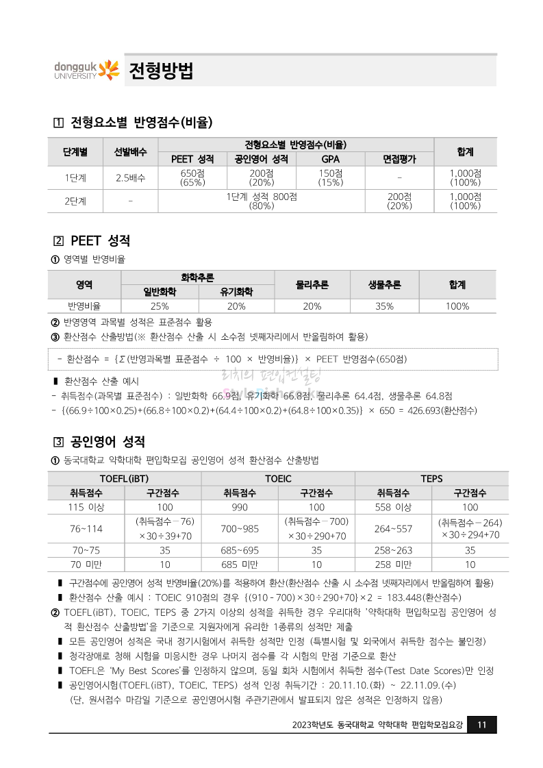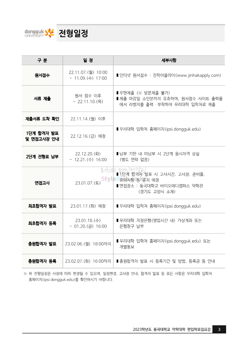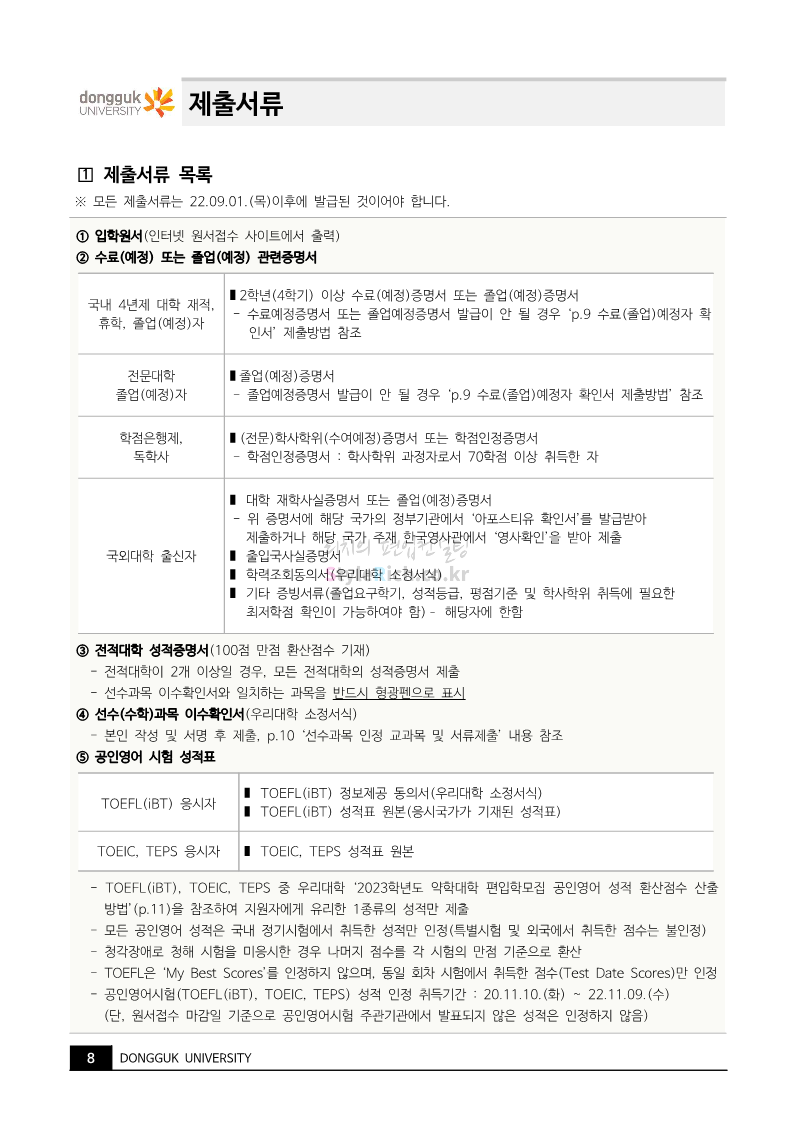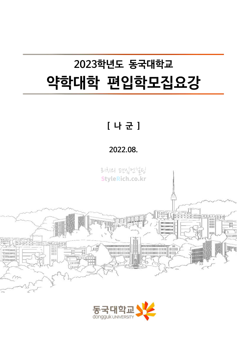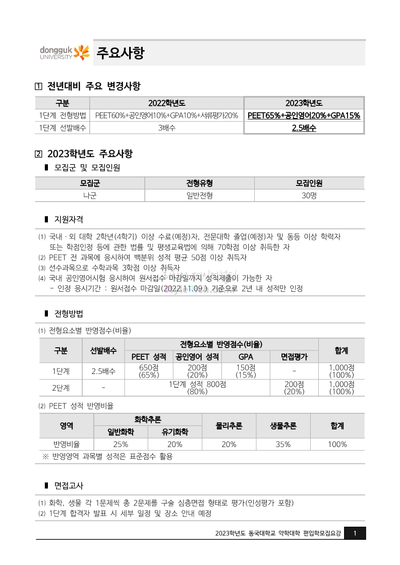 동국대 약대편입 2023학년도 모집요강 간편하게 보자! 2022.09.10 15:01 약대편입 모집요강/2023학년도 약대 모집요강 2023학년도 동국대 약대편입 모집요강(2022.08.03 기준)을 간편하게 확인하세요. * 최종 모집요강 발표 이후에도 내용의 일부가 변경될 수 있으니 지원 전 반드시 동국대 입학처의 모집요강을 확인 바랍니다. 2023학년도 동국대 약대편입 모집요강 다운받기 <출처: 동국대> [동슐랭 EP.2] 동국대 노포 맛집 - 홍탁집 리뷰 공유하기 게시글 관리 리치의 편입컨설팅 저작자표시 비영리 변경금지 (새창열림) '약대편입 모집요강 > 2023학년도 약대 모집요강' 카테고리의 다른 글 부산대 약대편입 2023학년도 모집요강 간편하게 보자! (0) 2022.09.10 동덕여대 약대편입 2023학년도 모집요강 간편하게 보자! (0) 2022.09.10 덕성여대 약대편입 2023학년도 모집요강 간편하게 보자! (0) 2022.09.10 단국대(천안) 약대편입 2023학년도 모집요강 간편하게 보자! (0) 2022.09.10 고려대(세종) 약대편입 2023학년도 모집요강 간편하게 보자! (0) 2022.09.10 댓글 공유하기 다른 글 댓글 이 글 공유하기 구독하기 구독하기 카카오톡 카카오톡 라인 라인 트위터 트위터 Facebook Facebook 카카오스토리 카카오스토리 밴드 밴드 네이버 블로그 네이버 블로그 Pocket Pocket Evernote Evernote 다른 글 부산대 약대편입 2023학년도 모집요강 간편하게 보자! 부산대 약대편입 2023학년도 모집요강 간편하게 보자! 2022.09.10 동덕여대 약대편입 2023학년도 모집요강 간편하게 보자! 동덕여대 약대편입 2023학년도 모집요강 간편하게 보자! 2022.09.10 덕성여대 약대편입 2023학년도 모집요강 간편하게 보자! 덕성여대 약대편입 2023학년도 모집요강 간편하게 보자! 2022.09.10 단국대(천안) 약대편입 2023학년도 모집요강 간편하게 보자! 단국대(천안) 약대편입 2023학년도 모집요강 간편하게 보자! 2022.09.10 다른 글 더 둘러보기