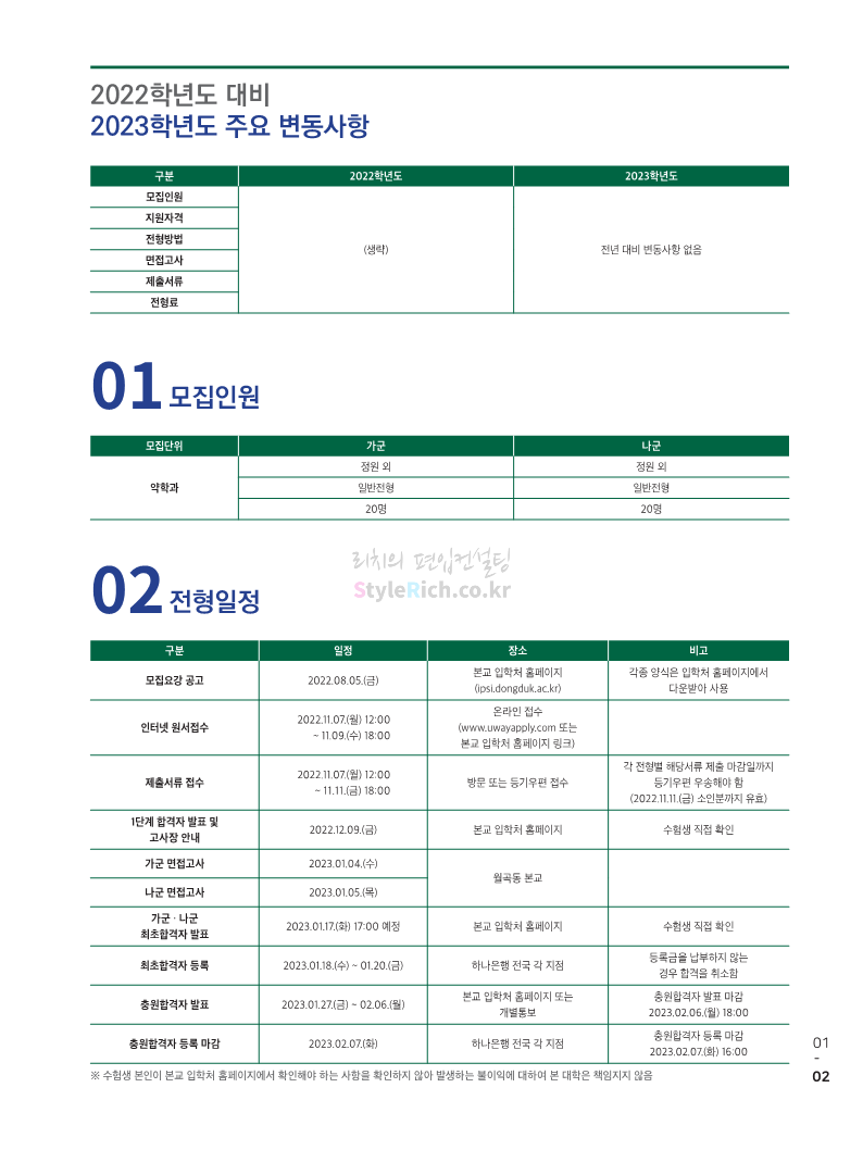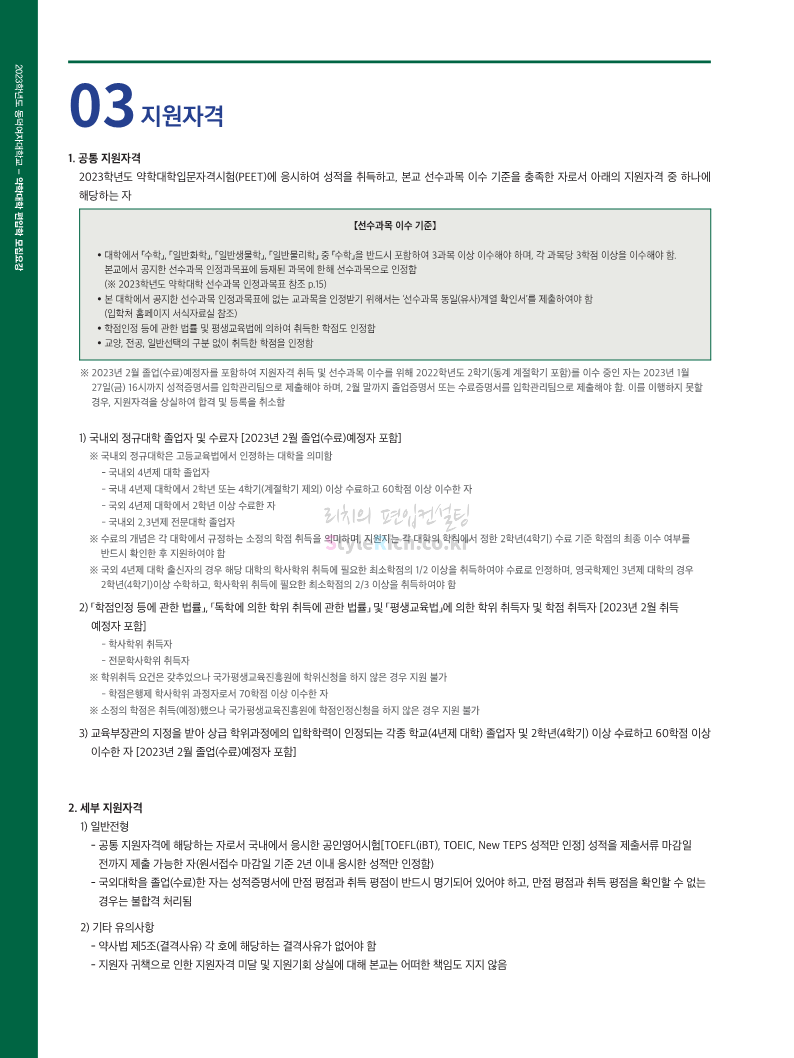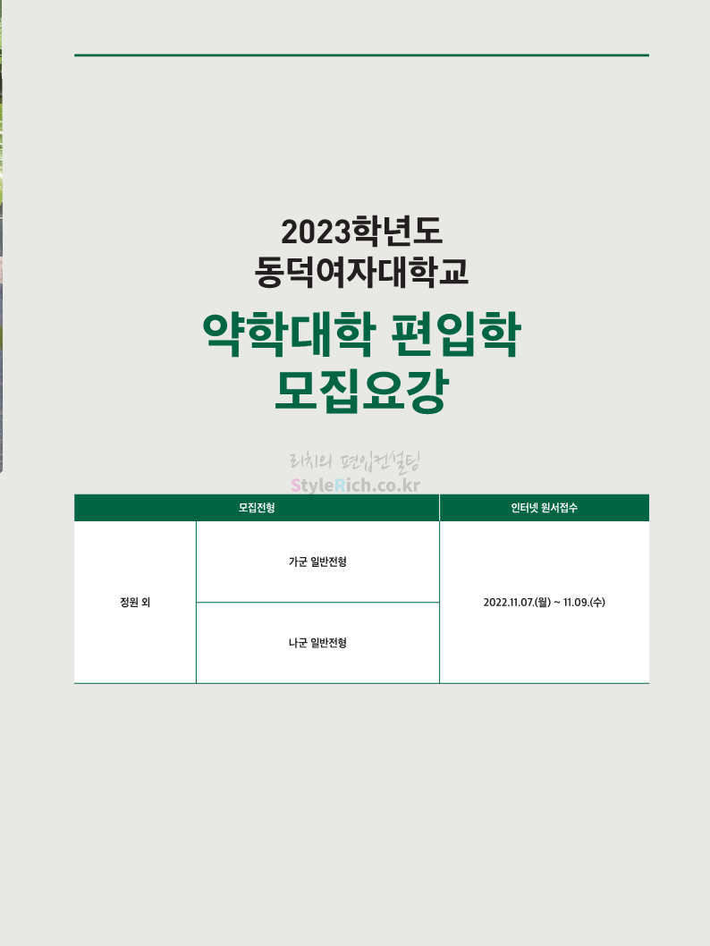 동덕여대 약대편입 2023학년도 모집요강 간편하게 보자! 2022.09.10 15:26 약대편입 모집요강/2023학년도 약대 모집요강 2023학년도 동덕여대 약대편입 모집요강(2022.08.05 기준)을 간편하게 확인하세요. * 최종 모집요강 발표 이후에도 내용의 일부가 변경될 수 있으니 지원 전 반드시 동덕여대 입학처의 모집요강을 확인 바랍니다. 2023학년도 동덕여대 약대편입 모집요강 다운받기 <출처: 동덕여대> [동덕LiFE] 동행서포터즈 V-LOG | 선취업후진학 콘서트 | 한양대학교 팀시나브로 공유하기 게시글 관리 리치의 편입컨설팅 저작자표시 비영리 변경금지 (새창열림) '약대편입 모집요강 > 2023학년도 약대 모집요강' 카테고리의 다른 글 삼육대 약대편입 2023학년도 모집요강 간편하게 보자! (0) 2022.09.10 부산대 약대편입 2023학년도 모집요강 간편하게 보자! (0) 2022.09.10 동국대 약대편입 2023학년도 모집요강 간편하게 보자! (0) 2022.09.10 덕성여대 약대편입 2023학년도 모집요강 간편하게 보자! (0) 2022.09.10 단국대(천안) 약대편입 2023학년도 모집요강 간편하게 보자! (0) 2022.09.10 댓글 공유하기 다른 글 댓글 이 글 공유하기 구독하기 구독하기 카카오톡 카카오톡 라인 라인 트위터 트위터 Facebook Facebook 카카오스토리 카카오스토리 밴드 밴드 네이버 블로그 네이버 블로그 Pocket Pocket Evernote Evernote 다른 글 삼육대 약대편입 2023학년도 모집요강 간편하게 보자! 삼육대 약대편입 2023학년도 모집요강 간편하게 보자! 2022.09.10 부산대 약대편입 2023학년도 모집요강 간편하게 보자! 부산대 약대편입 2023학년도 모집요강 간편하게 보자! 2022.09.10 동국대 약대편입 2023학년도 모집요강 간편하게 보자! 동국대 약대편입 2023학년도 모집요강 간편하게 보자! 2022.09.10 덕성여대 약대편입 2023학년도 모집요강 간편하게 보자! 덕성여대 약대편입 2023학년도 모집요강 간편하게 보자! 2022.09.10 다른 글 더 둘러보기