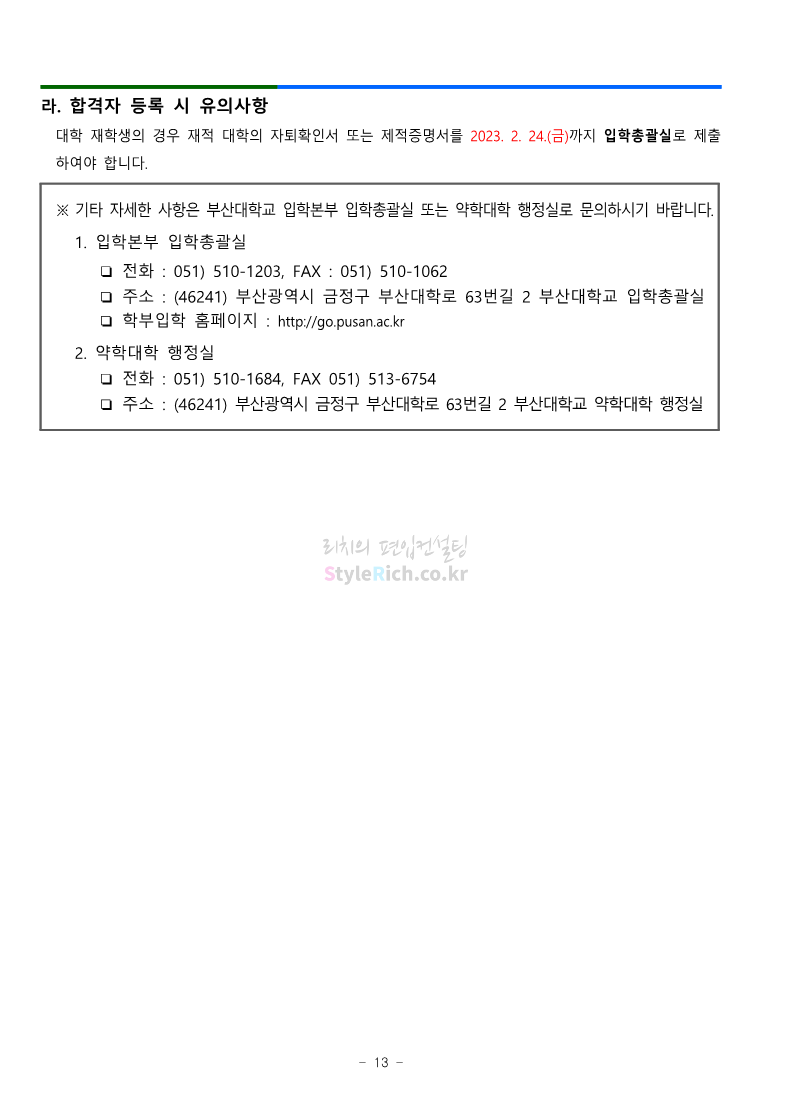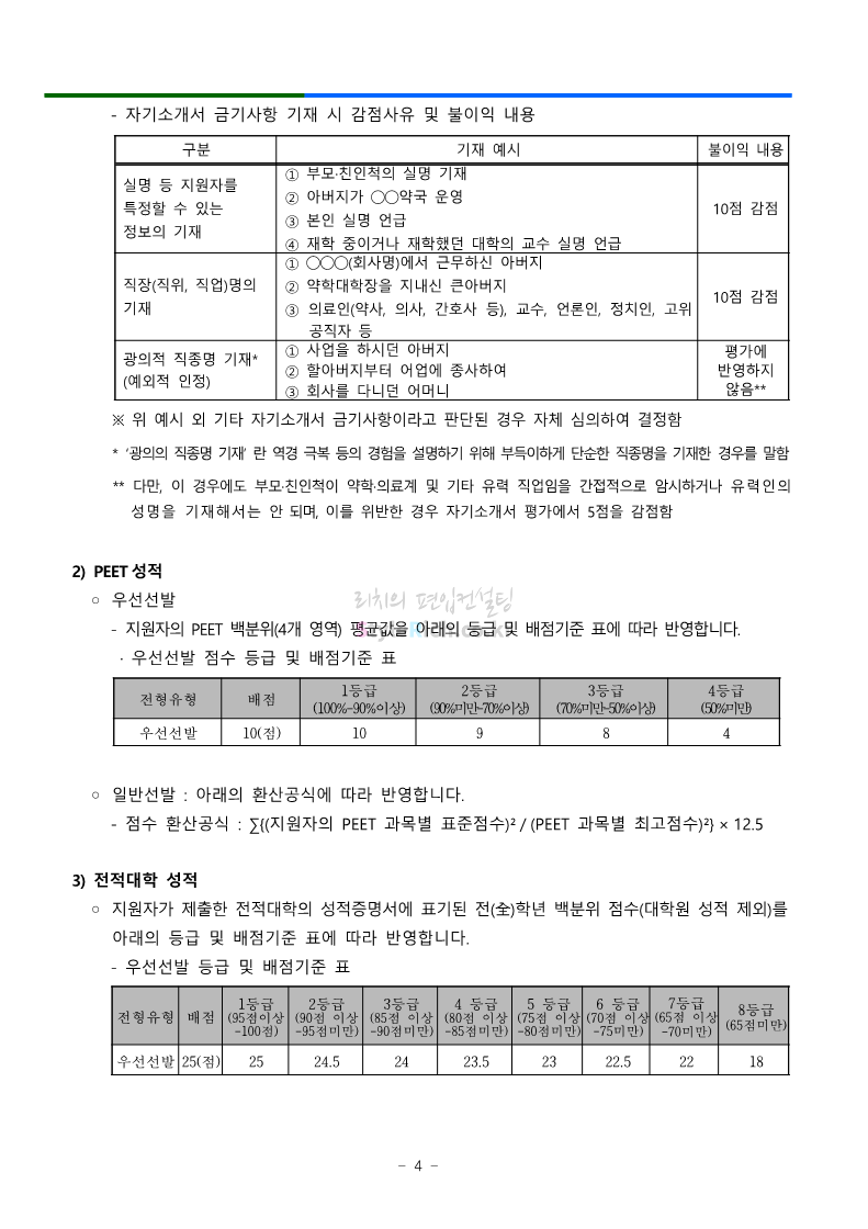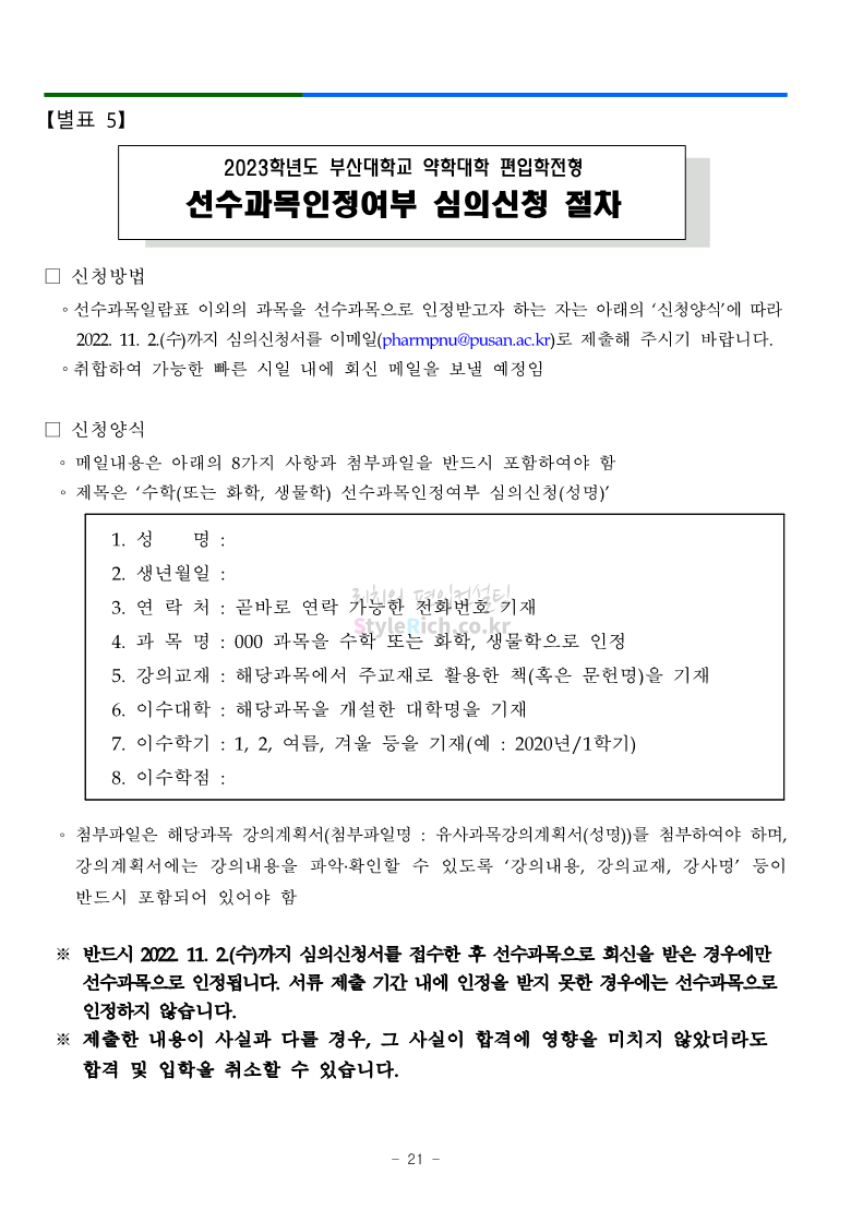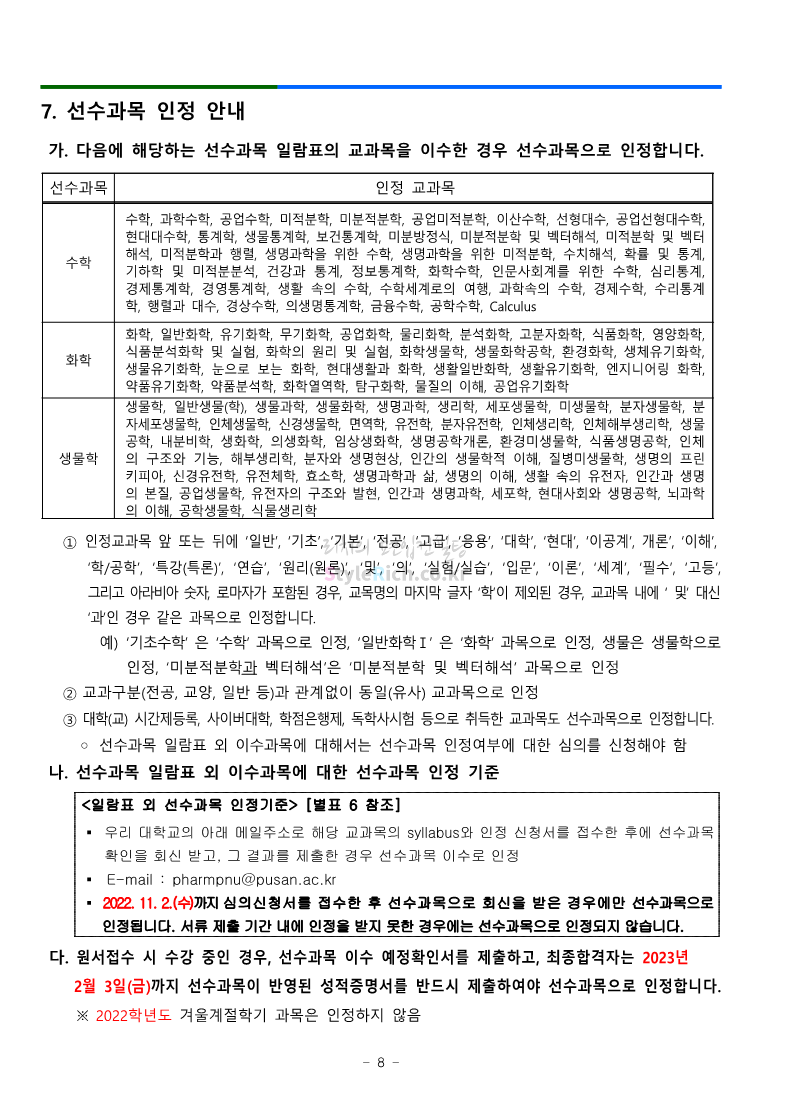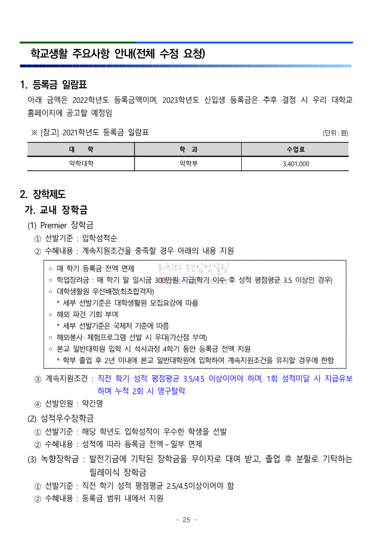 부산대 약대편입 2023학년도 모집요강 간편하게 보자! 2022.09.10 16:07 약대편입 모집요강/2023학년도 약대 모집요강 2023학년도 부산대 약대편입 모집요강(2022.07.28 기준)을 간편하게 확인하세요. ** 최종 모집요강 발표 이후에도 내용의 일부가 변경될 수 있으니 지원 전 반드시 부산대 입학처의 모집요강을 확인 바랍니다. 2023학년도 부산대 약대편입 모집요강 다운받기 <출처: 부산대> 부산대학교를 소개합니다. 홍보대사 푸름(PURM)과 함께 [2023 대학수시입학 MBC특별방송] 공유하기 게시글 관리 리치의 편입컨설팅 저작자표시 비영리 변경금지 (새창열림) '약대편입 모집요강 > 2023학년도 약대 모집요강' 카테고리의 다른 글 성균관대 약대편입 2023학년도 모집요강 간편하게 보자! (0) 2022.09.10 삼육대 약대편입 2023학년도 모집요강 간편하게 보자! (0) 2022.09.10 동덕여대 약대편입 2023학년도 모집요강 간편하게 보자! (0) 2022.09.10 동국대 약대편입 2023학년도 모집요강 간편하게 보자! (0) 2022.09.10 덕성여대 약대편입 2023학년도 모집요강 간편하게 보자! (0) 2022.09.10 댓글 공유하기 다른 글 댓글 이 글 공유하기 구독하기 구독하기 카카오톡 카카오톡 라인 라인 트위터 트위터 Facebook Facebook 카카오스토리 카카오스토리 밴드 밴드 네이버 블로그 네이버 블로그 Pocket Pocket Evernote Evernote 다른 글 성균관대 약대편입 2023학년도 모집요강 간편하게 보자! 성균관대 약대편입 2023학년도 모집요강 간편하게 보자! 2022.09.10 삼육대 약대편입 2023학년도 모집요강 간편하게 보자! 삼육대 약대편입 2023학년도 모집요강 간편하게 보자! 2022.09.10 동덕여대 약대편입 2023학년도 모집요강 간편하게 보자! 동덕여대 약대편입 2023학년도 모집요강 간편하게 보자! 2022.09.10 동국대 약대편입 2023학년도 모집요강 간편하게 보자! 동국대 약대편입 2023학년도 모집요강 간편하게 보자! 2022.09.10 다른 글 더 둘러보기