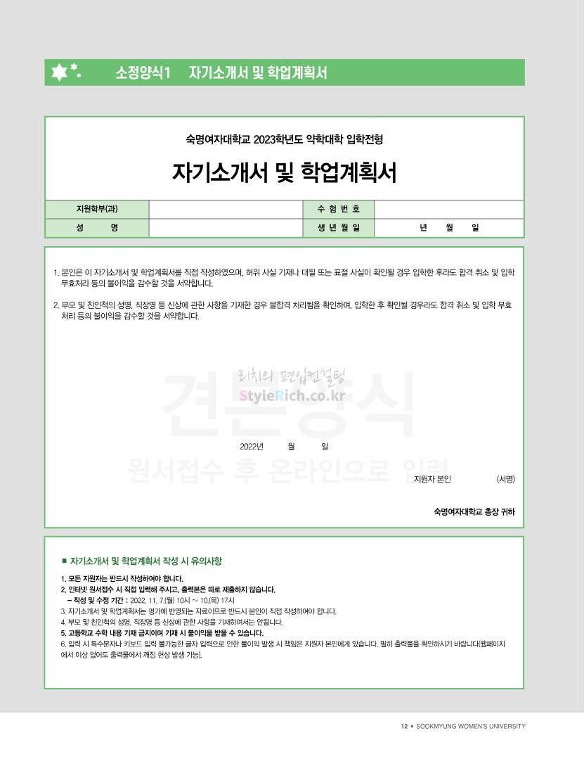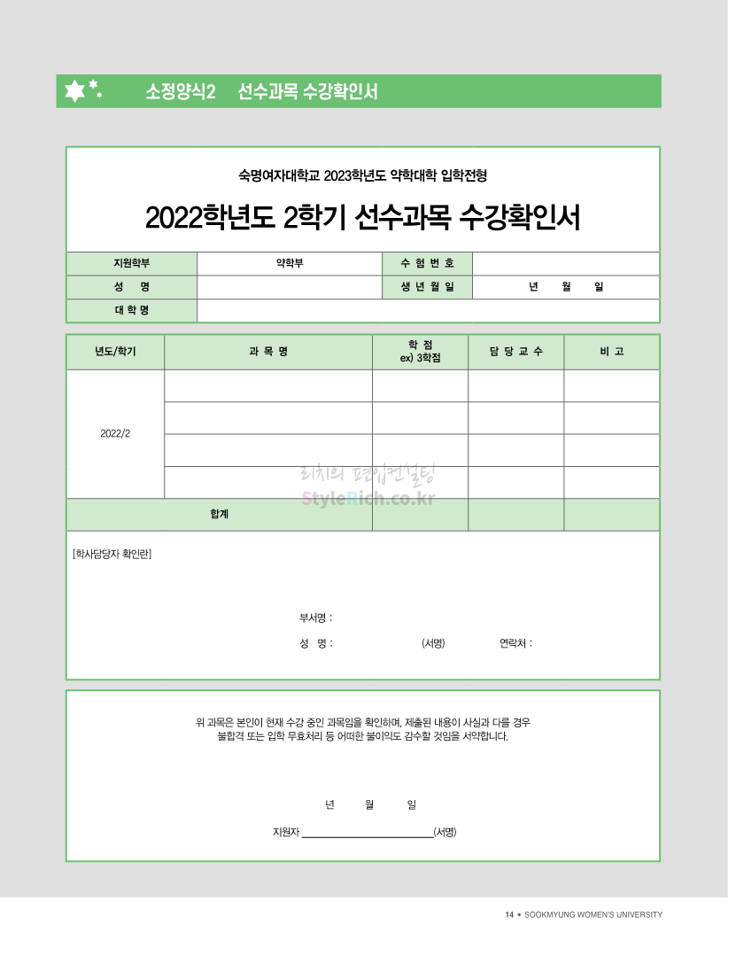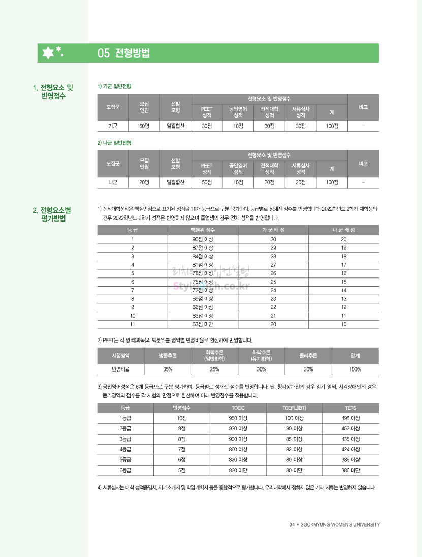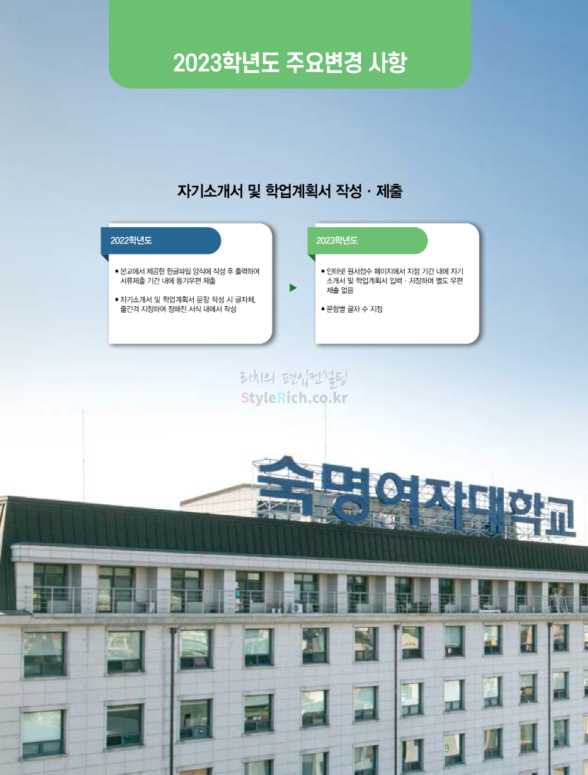 숙명여대 약대편입 2023학년도 모집요강 간편하게 보자! 2022.09.11 00:05 약대편입 모집요강/2023학년도 약대 모집요강 2023학년도 숙명여대 약대편입 모집요강(2022.08.05 기준)을 간편하게 확인하세요. * 최종 모집요강 발표 이후에도 내용의 일부가 변경될 수 있으니 지원 전 반드시 숙명여대 입학처의 모집요강을 확인 바랍니다. 2023학년도 숙명여대 약대편입 모집요강 다운받기 <출처: 숙명여대> [숙명여대] 월공강 VS 금공강, 더 좋은 시간표는?ㅣ숙대 수강신청, 시간표 꿀팁 대방출🍯 공유하기 게시글 관리 리치의 편입컨설팅 저작자표시 비영리 변경금지 (새창열림) '약대편입 모집요강 > 2023학년도 약대 모집요강' 카테고리의 다른 글 영남대 약대편입 2023학년도 모집요강 간편하게 보자! (0) 2022.09.11 아주대 약대편입 2023학년도 모집요강 간편하게 보자! (0) 2022.09.11 성균관대 약대편입 2023학년도 모집요강 간편하게 보자! (0) 2022.09.10 삼육대 약대편입 2023학년도 모집요강 간편하게 보자! (0) 2022.09.10 부산대 약대편입 2023학년도 모집요강 간편하게 보자! (0) 2022.09.10 댓글 공유하기 다른 글 댓글 이 글 공유하기 구독하기 구독하기 카카오톡 카카오톡 라인 라인 트위터 트위터 Facebook Facebook 카카오스토리 카카오스토리 밴드 밴드 네이버 블로그 네이버 블로그 Pocket Pocket Evernote Evernote 다른 글 영남대 약대편입 2023학년도 모집요강 간편하게 보자! 영남대 약대편입 2023학년도 모집요강 간편하게 보자! 2022.09.11 아주대 약대편입 2023학년도 모집요강 간편하게 보자! 아주대 약대편입 2023학년도 모집요강 간편하게 보자! 2022.09.11 성균관대 약대편입 2023학년도 모집요강 간편하게 보자! 성균관대 약대편입 2023학년도 모집요강 간편하게 보자! 2022.09.10 삼육대 약대편입 2023학년도 모집요강 간편하게 보자! 삼육대 약대편입 2023학년도 모집요강 간편하게 보자! 2022.09.10 다른 글 더 둘러보기