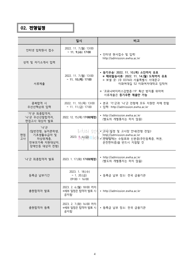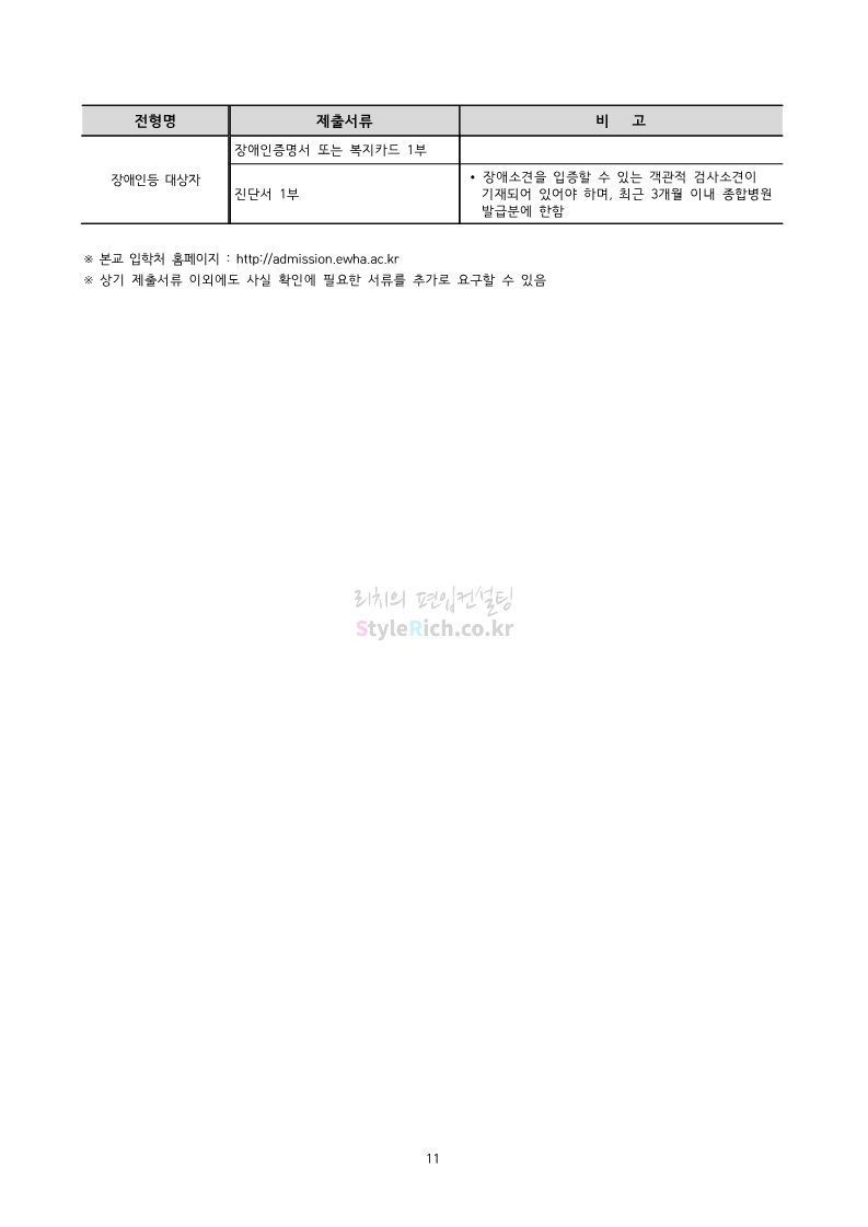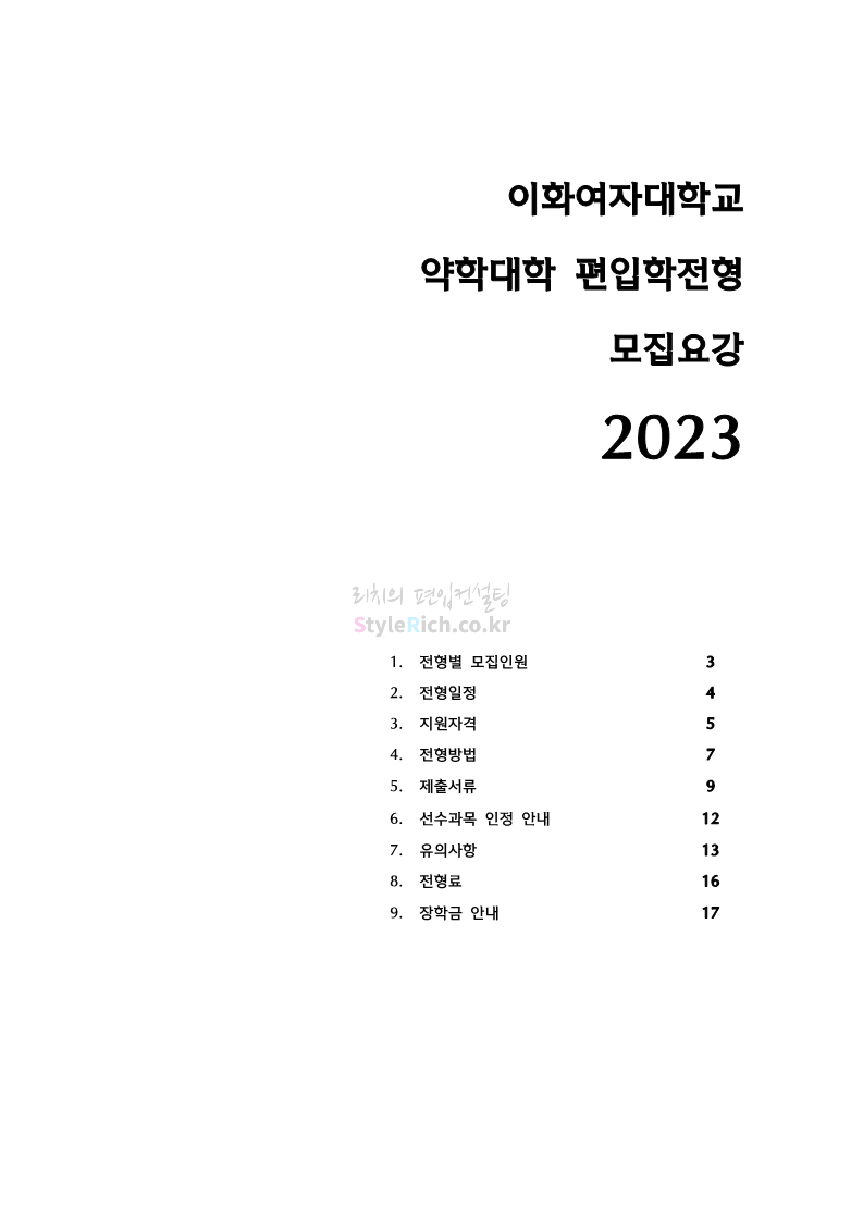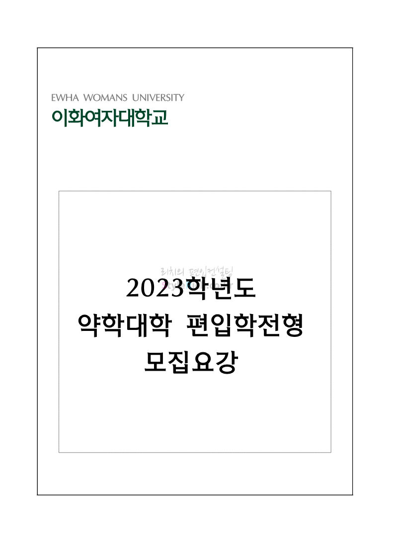 이화여대 약대편입 2023학년도 모집요강 간편하게 보자! 2022.09.11 12:01 약대편입 모집요강/2023학년도 약대 모집요강 2023학년도 이화여대 약대편입 모집요강(2022.08.05 기준)을 간편하게 확인하세요. * 최종 모집요강 발표 이후에도 내용의 일부가 변경될 수 있으니 지원 전 반드시 이화여대 입학처의 모집요강을 확인 바랍니다. 2023학년도 이화여대 약대편입 모집요강 다운받기 <출처: 이화여대> 나답게 이화답게 Video #1. Story Version 공유하기 게시글 관리 리치의 편입컨설팅 저작자표시 비영리 변경금지 (새창열림) '약대편입 모집요강 > 2023학년도 약대 모집요강' 카테고리의 다른 글 전북대 약대편입 2023학년도 모집요강 간편하게 보자! (0) 2022.09.11 전남대 약대편입 2023학년도 모집요강 간편하게 보자! (0) 2022.09.11 영남대 약대편입 2023학년도 모집요강 간편하게 보자! (0) 2022.09.11 아주대 약대편입 2023학년도 모집요강 간편하게 보자! (0) 2022.09.11 숙명여대 약대편입 2023학년도 모집요강 간편하게 보자! (0) 2022.09.11 댓글 공유하기 다른 글 댓글 이 글 공유하기 구독하기 구독하기 카카오톡 카카오톡 라인 라인 트위터 트위터 Facebook Facebook 카카오스토리 카카오스토리 밴드 밴드 네이버 블로그 네이버 블로그 Pocket Pocket Evernote Evernote 다른 글 전북대 약대편입 2023학년도 모집요강 간편하게 보자! 전북대 약대편입 2023학년도 모집요강 간편하게 보자! 2022.09.11 전남대 약대편입 2023학년도 모집요강 간편하게 보자! 전남대 약대편입 2023학년도 모집요강 간편하게 보자! 2022.09.11 영남대 약대편입 2023학년도 모집요강 간편하게 보자! 영남대 약대편입 2023학년도 모집요강 간편하게 보자! 2022.09.11 아주대 약대편입 2023학년도 모집요강 간편하게 보자! 아주대 약대편입 2023학년도 모집요강 간편하게 보자! 2022.09.11 다른 글 더 둘러보기