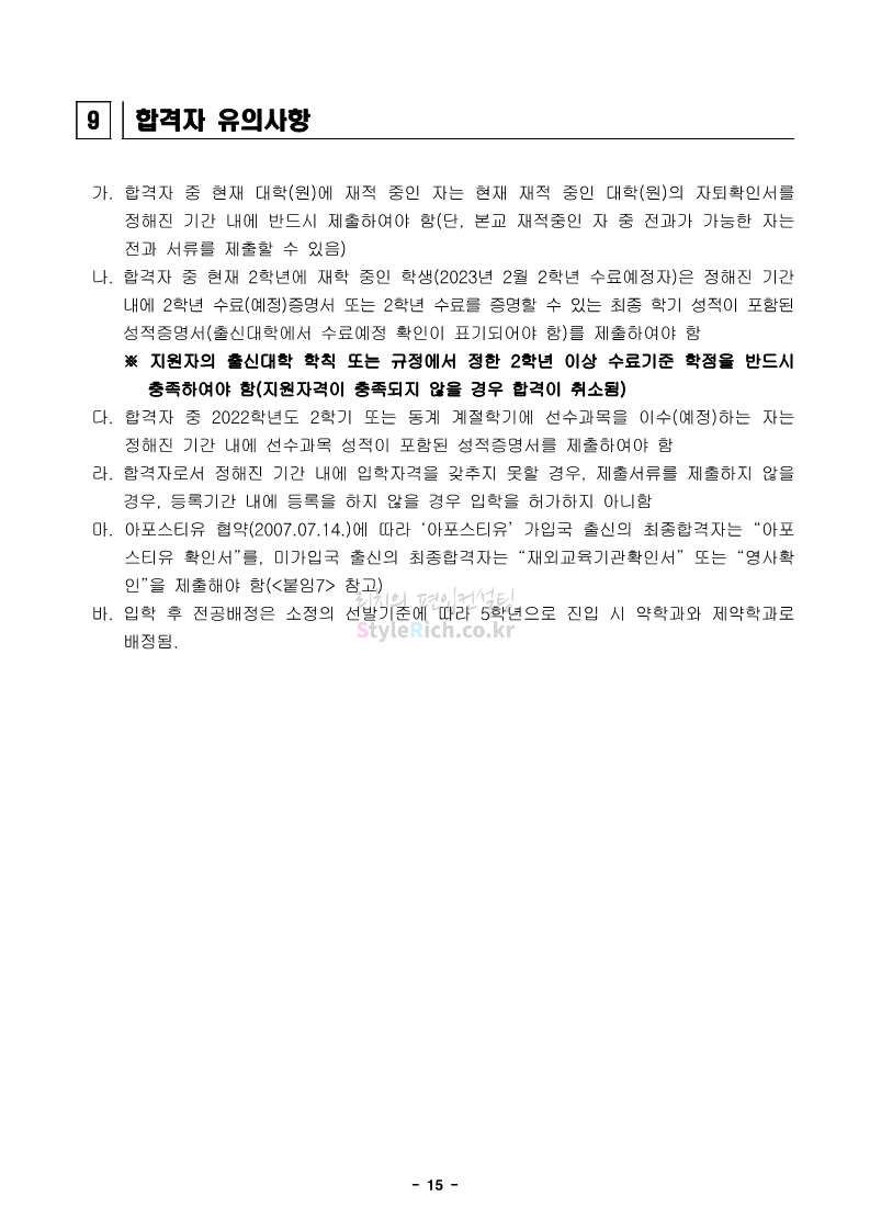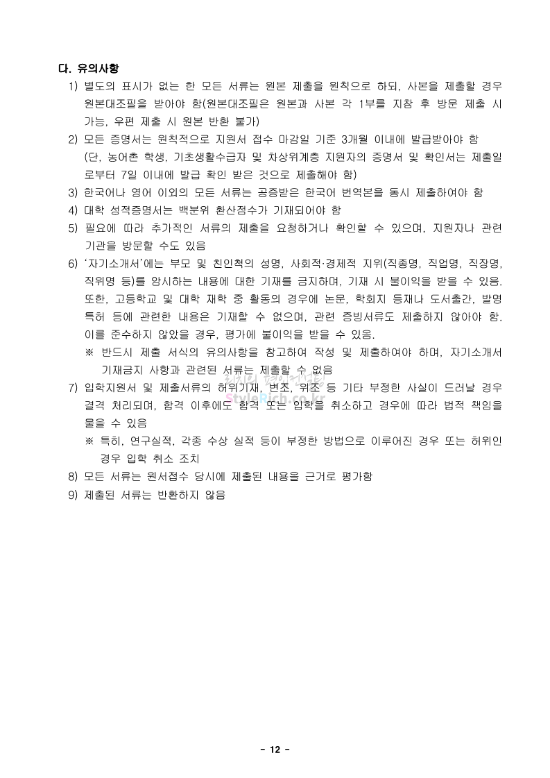 서울대 약대편입 2023학년도 모집요강 간편하게 보자! 2022.09.11 20:01 약대편입 모집요강/2023학년도 약대 모집요강 2023학년도 서울대 약대편입 모집요강(2022.07.29 기준)을 간편하게 확인하세요. * 최종 모집요강 발표 이후에도 내용의 일부가 변경될 수 있으니 지원 전 반드시 서울대 입학처의 모집요강을 확인 바랍니다. 2023학년도 서울대 약대편입 모집요강 다운받기 <출처: 서울대> 공유하기 게시글 관리 리치의 편입컨설팅 저작자표시 비영리 변경금지 (새창열림) '약대편입 모집요강 > 2023학년도 약대 모집요강' 카테고리의 다른 글 원광대 약대편입 2023학년도 모집요강 간편하게 보자! (0) 2022.09.11 인제대 약대편입 2023학년도 모집요강 간편하게 보자! (0) 2022.09.11 연세대 약대편입 2023학년도 모집요강 간편하게 보자! (0) 2022.09.11 한양대(ERICA) 약대편입 2023학년도 모집요강 간편하게 보자! (0) 2022.09.11 충북대 약대편입 2023학년도 모집요강 간편하게 보자! (0) 2022.09.11 댓글 공유하기 다른 글 댓글 이 글 공유하기 구독하기 구독하기 카카오톡 카카오톡 라인 라인 트위터 트위터 Facebook Facebook 카카오스토리 카카오스토리 밴드 밴드 네이버 블로그 네이버 블로그 Pocket Pocket Evernote Evernote 다른 글 원광대 약대편입 2023학년도 모집요강 간편하게 보자! 원광대 약대편입 2023학년도 모집요강 간편하게 보자! 2022.09.11 인제대 약대편입 2023학년도 모집요강 간편하게 보자! 인제대 약대편입 2023학년도 모집요강 간편하게 보자! 2022.09.11 연세대 약대편입 2023학년도 모집요강 간편하게 보자! 연세대 약대편입 2023학년도 모집요강 간편하게 보자! 2022.09.11 한양대(ERICA) 약대편입 2023학년도 모집요강 간편하게 보자! 한양대(ERICA) 약대편입 2023학년도 모집요강 간편하게 보자! 2022.09.11 다른 글 더 둘러보기