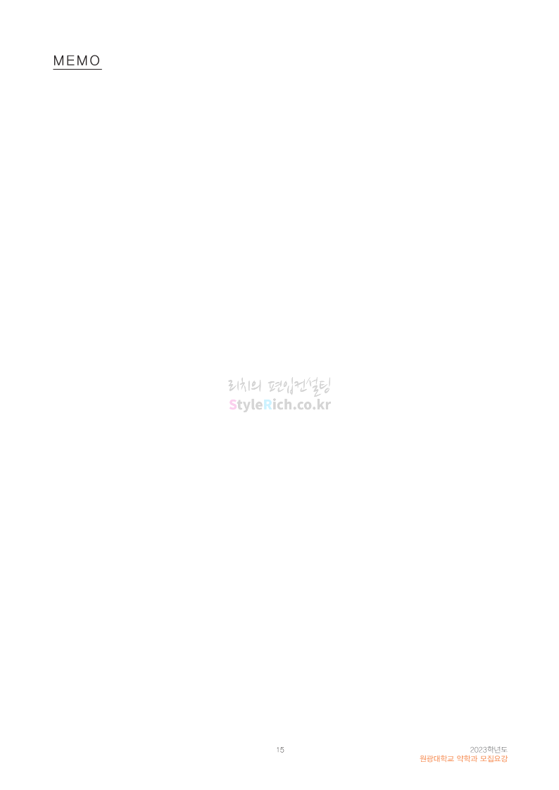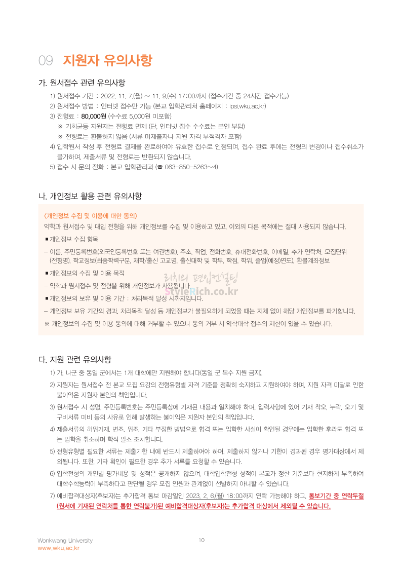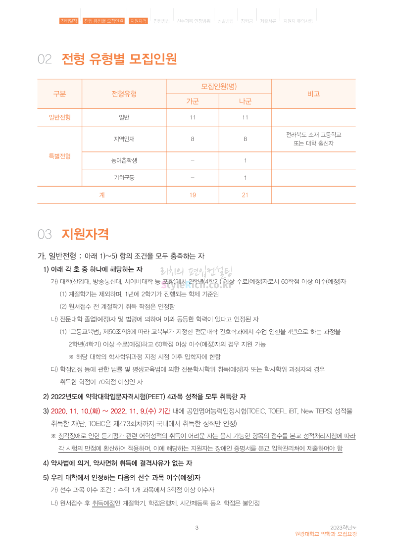 원광대 약대편입 2023학년도 모집요강 간편하게 보자! 2022.09.11 20:27 약대편입 모집요강/2023학년도 약대 모집요강 2023학년도 원광대 약대편입 모집요강(2022.08.12 기준)을 간편하게 확인하세요. * 최종 모집요강 발표 이후에도 내용의 일부가 변경될 수 있으니 지원 전 반드시 원광대 입학처의 모집요강을 확인 바랍니다. 2023학년도 원광대 약대편입 모집요강 다운받기 <출처: 원광대> 공유하기 게시글 관리 리치의 편입컨설팅 저작자표시 비영리 변경금지 (새창열림) '약대편입 모집요강 > 2023학년도 약대 모집요강' 카테고리의 다른 글 경상국립대 약대편입 2023학년도 모집요강 간편하게 보자! (0) 2022.09.11 대구가톨릭대 약대편입 2023학년도 모집요강 간편하게 보자! (0) 2022.09.11 인제대 약대편입 2023학년도 모집요강 간편하게 보자! (0) 2022.09.11 서울대 약대편입 2023학년도 모집요강 간편하게 보자! (0) 2022.09.11 연세대 약대편입 2023학년도 모집요강 간편하게 보자! (0) 2022.09.11 댓글 공유하기 다른 글 댓글 이 글 공유하기 구독하기 구독하기 카카오톡 카카오톡 라인 라인 트위터 트위터 Facebook Facebook 카카오스토리 카카오스토리 밴드 밴드 네이버 블로그 네이버 블로그 Pocket Pocket Evernote Evernote 다른 글 경상국립대 약대편입 2023학년도 모집요강 간편하게 보자! 경상국립대 약대편입 2023학년도 모집요강 간편하게 보자! 2022.09.11 대구가톨릭대 약대편입 2023학년도 모집요강 간편하게 보자! 대구가톨릭대 약대편입 2023학년도 모집요강 간편하게 보자! 2022.09.11 인제대 약대편입 2023학년도 모집요강 간편하게 보자! 인제대 약대편입 2023학년도 모집요강 간편하게 보자! 2022.09.11 서울대 약대편입 2023학년도 모집요강 간편하게 보자! 서울대 약대편입 2023학년도 모집요강 간편하게 보자! 2022.09.11 다른 글 더 둘러보기