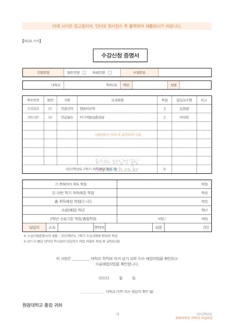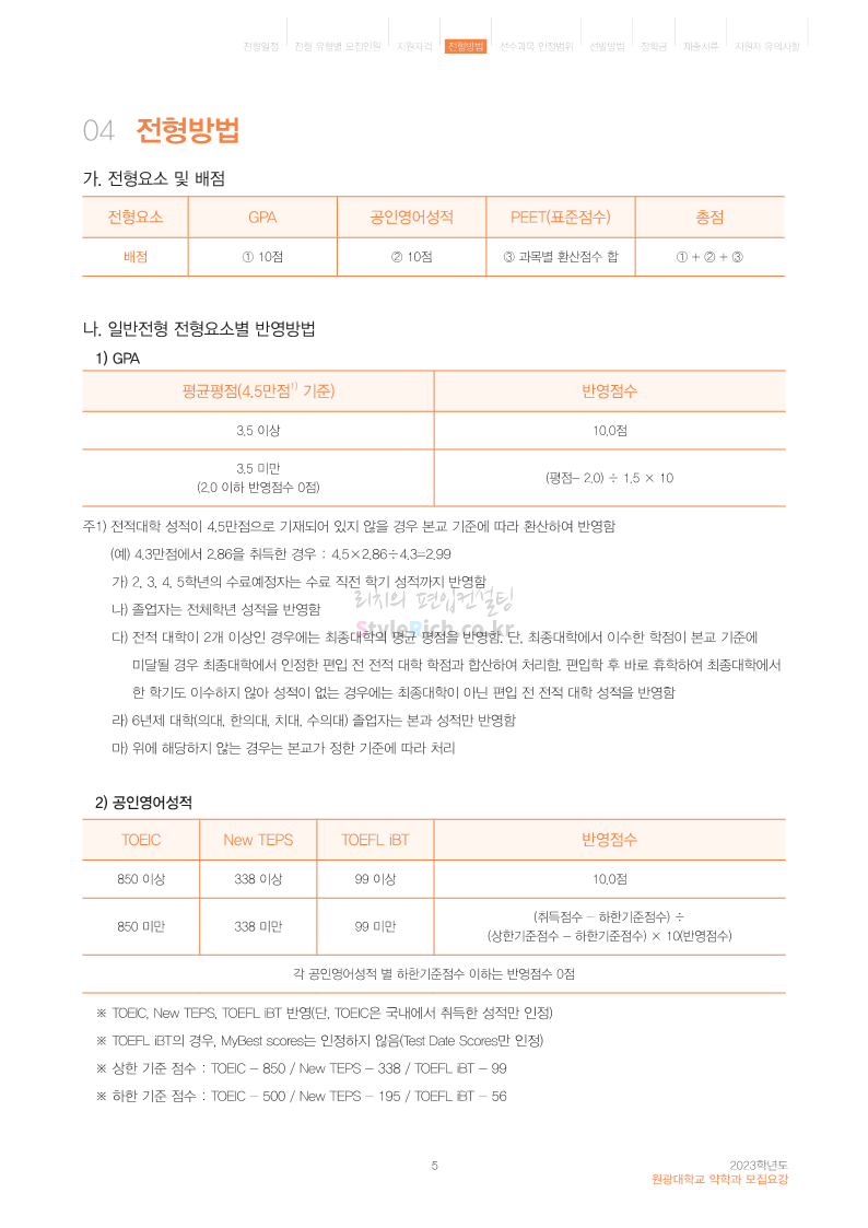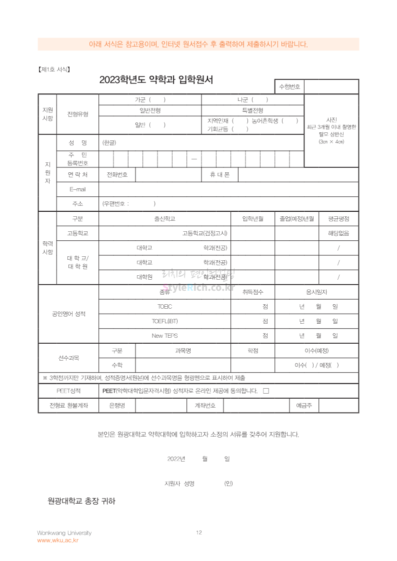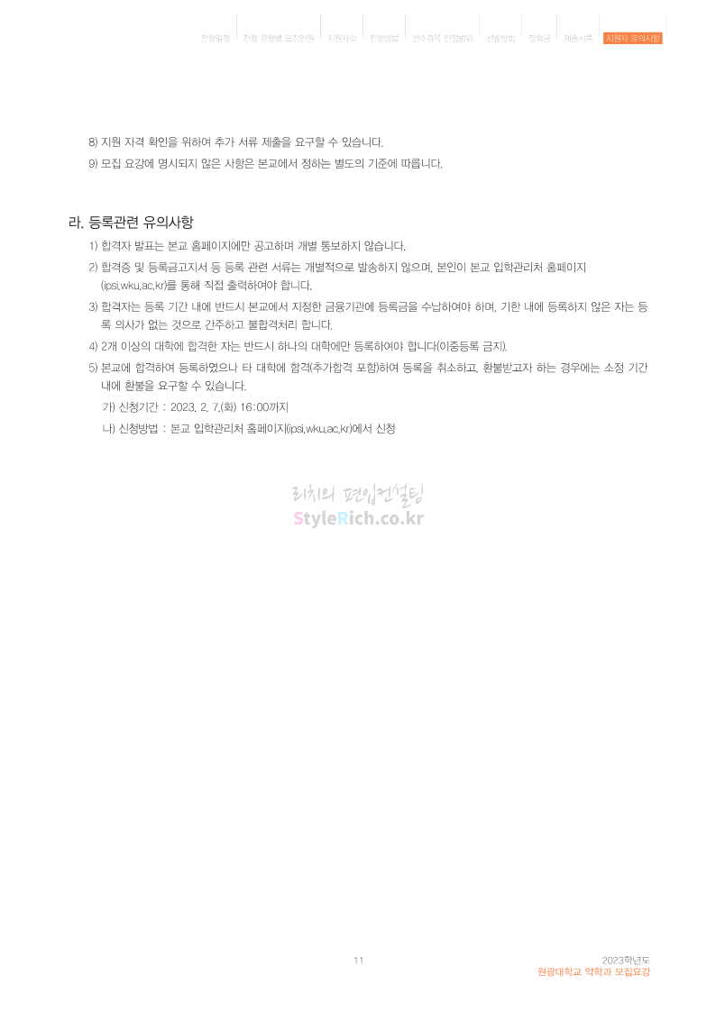 원광대 약대편입 2023학년도 모집요강 간편하게 보자! 2022.09.11 20:27 약대편입 모집요강/2023학년도 약대 모집요강 2023학년도 원광대 약대편입 모집요강(2022.08.12 기준)을 간편하게 확인하세요. * 최종 모집요강 발표 이후에도 내용의 일부가 변경될 수 있으니 지원 전 반드시 원광대 입학처의 모집요강을 확인 바랍니다. 2023학년도 원광대 약대편입 모집요강 다운받기 <출처: 원광대> 공유하기 게시글 관리 리치의 편입컨설팅 저작자표시 비영리 변경금지 (새창열림) '약대편입 모집요강 > 2023학년도 약대 모집요강' 카테고리의 다른 글 경상국립대 약대편입 2023학년도 모집요강 간편하게 보자! (0) 2022.09.11 대구가톨릭대 약대편입 2023학년도 모집요강 간편하게 보자! (0) 2022.09.11 인제대 약대편입 2023학년도 모집요강 간편하게 보자! (0) 2022.09.11 서울대 약대편입 2023학년도 모집요강 간편하게 보자! (0) 2022.09.11 연세대 약대편입 2023학년도 모집요강 간편하게 보자! (0) 2022.09.11 댓글 공유하기 다른 글 댓글 이 글 공유하기 구독하기 구독하기 카카오톡 카카오톡 라인 라인 트위터 트위터 Facebook Facebook 카카오스토리 카카오스토리 밴드 밴드 네이버 블로그 네이버 블로그 Pocket Pocket Evernote Evernote 다른 글 경상국립대 약대편입 2023학년도 모집요강 간편하게 보자! 경상국립대 약대편입 2023학년도 모집요강 간편하게 보자! 2022.09.11 대구가톨릭대 약대편입 2023학년도 모집요강 간편하게 보자! 대구가톨릭대 약대편입 2023학년도 모집요강 간편하게 보자! 2022.09.11 인제대 약대편입 2023학년도 모집요강 간편하게 보자! 인제대 약대편입 2023학년도 모집요강 간편하게 보자! 2022.09.11 서울대 약대편입 2023학년도 모집요강 간편하게 보자! 서울대 약대편입 2023학년도 모집요강 간편하게 보자! 2022.09.11 다른 글 더 둘러보기