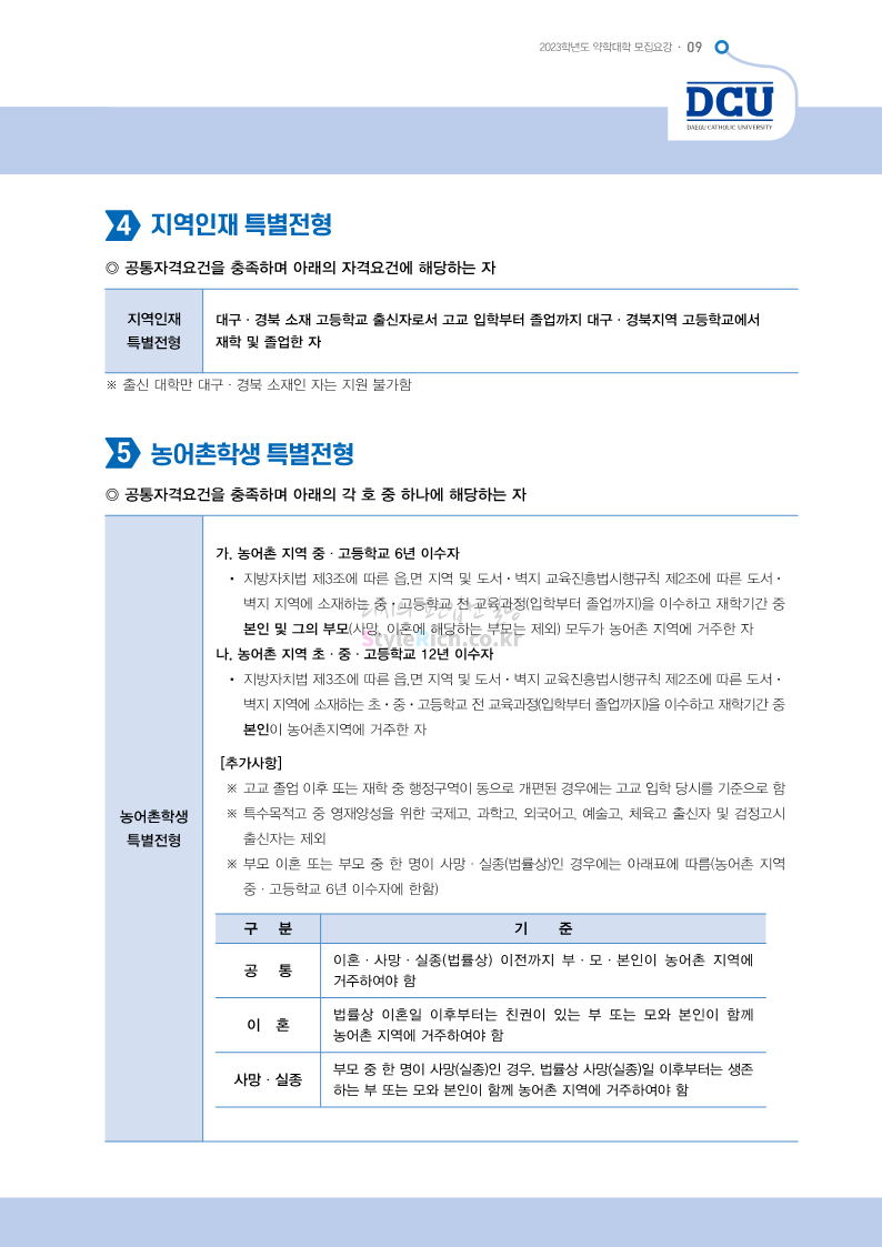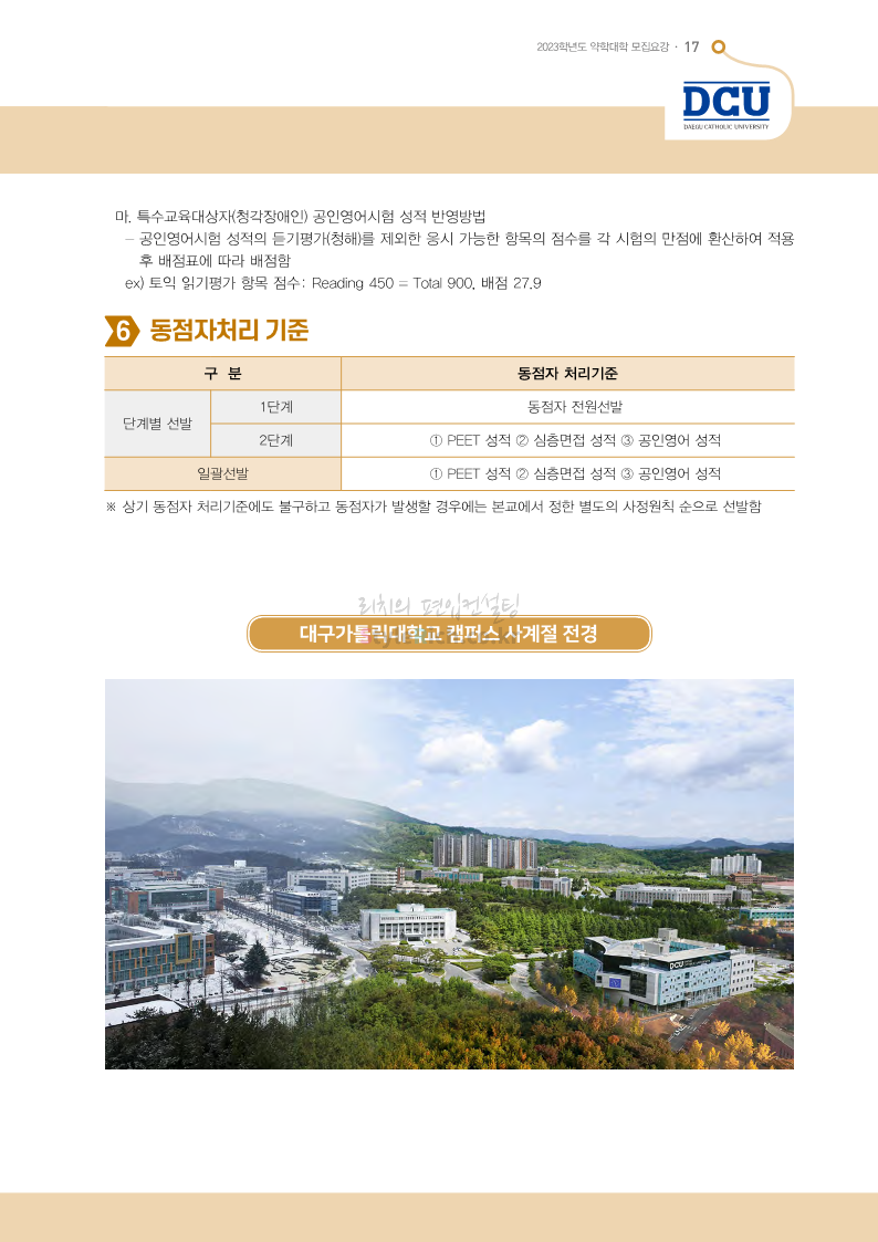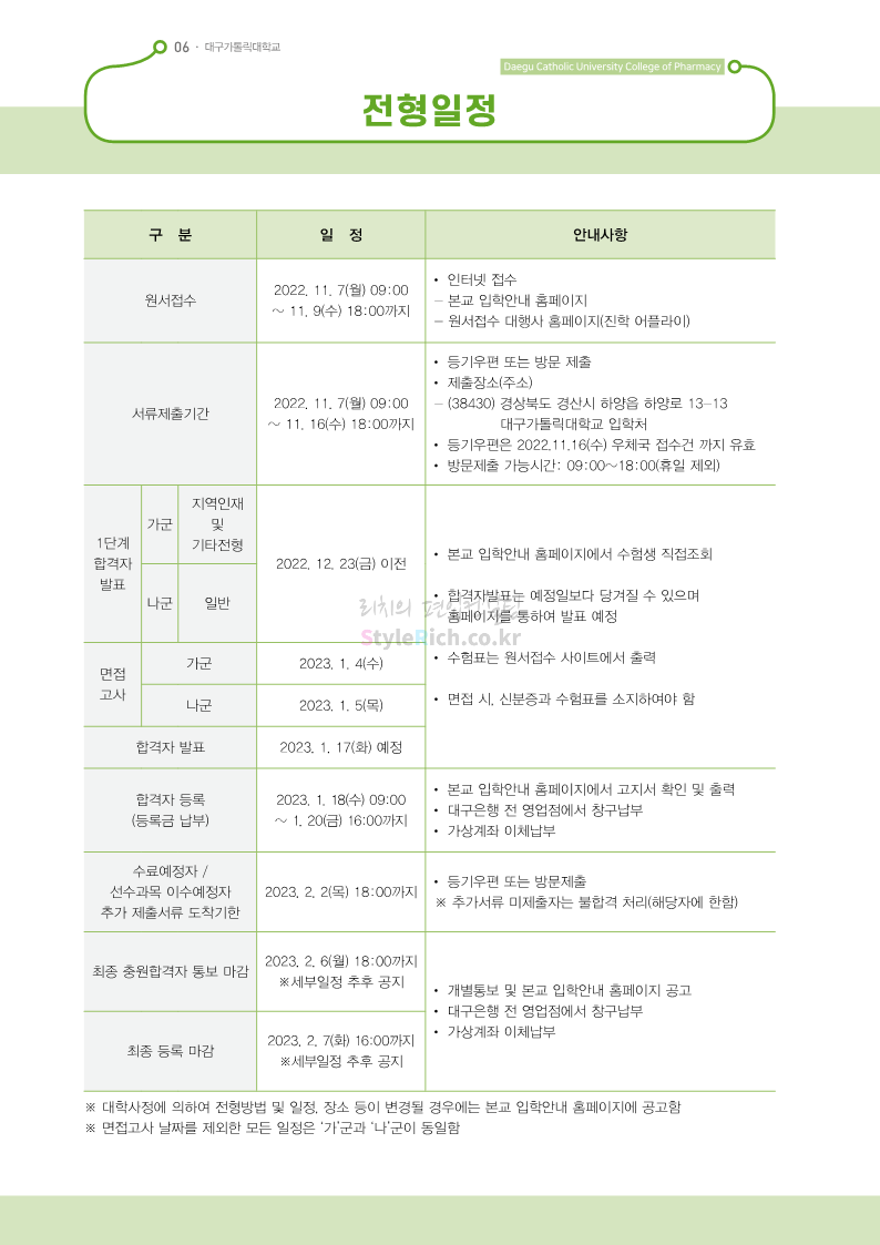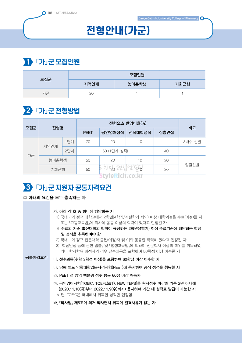 대구가톨릭대 약대편입 2023학년도 모집요강 간편하게 보자! 2022.09.11 20:42 약대편입 모집요강/2023학년도 약대 모집요강 2023학년도 대구가톨릭대 약대편입 모집요강(2022.08.29 기준)을 간편하게 확인하세요. * 최종 모집요강 발표 이후에도 내용의 일부가 변경될 수 있으니 지원 전 반드시 대구가톨릭대 입학처의 모집요강을 확인 바랍니다. 2023학년도 대구가톨릭대 약대편입 모집요강 다운받기 <출처: 대구가톨릭대> 공유하기 게시글 관리 리치의 편입컨설팅 저작자표시 비영리 변경금지 (새창열림) '약대편입 모집요강 > 2023학년도 약대 모집요강' 카테고리의 다른 글 우석대 약대편입 2023학년도 모집요강 간편하게 보자! (0) 2022.09.11 경상국립대 약대편입 2023학년도 모집요강 간편하게 보자! (0) 2022.09.11 원광대 약대편입 2023학년도 모집요강 간편하게 보자! (0) 2022.09.11 인제대 약대편입 2023학년도 모집요강 간편하게 보자! (0) 2022.09.11 서울대 약대편입 2023학년도 모집요강 간편하게 보자! (0) 2022.09.11 댓글 공유하기 다른 글 댓글 이 글 공유하기 구독하기 구독하기 카카오톡 카카오톡 라인 라인 트위터 트위터 Facebook Facebook 카카오스토리 카카오스토리 밴드 밴드 네이버 블로그 네이버 블로그 Pocket Pocket Evernote Evernote 다른 글 우석대 약대편입 2023학년도 모집요강 간편하게 보자! 우석대 약대편입 2023학년도 모집요강 간편하게 보자! 2022.09.11 경상국립대 약대편입 2023학년도 모집요강 간편하게 보자! 경상국립대 약대편입 2023학년도 모집요강 간편하게 보자! 2022.09.11 원광대 약대편입 2023학년도 모집요강 간편하게 보자! 원광대 약대편입 2023학년도 모집요강 간편하게 보자! 2022.09.11 인제대 약대편입 2023학년도 모집요강 간편하게 보자! 인제대 약대편입 2023학년도 모집요강 간편하게 보자! 2022.09.11 다른 글 더 둘러보기