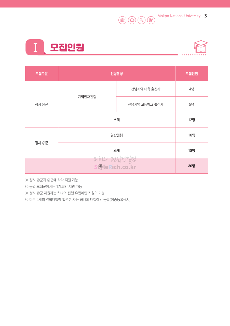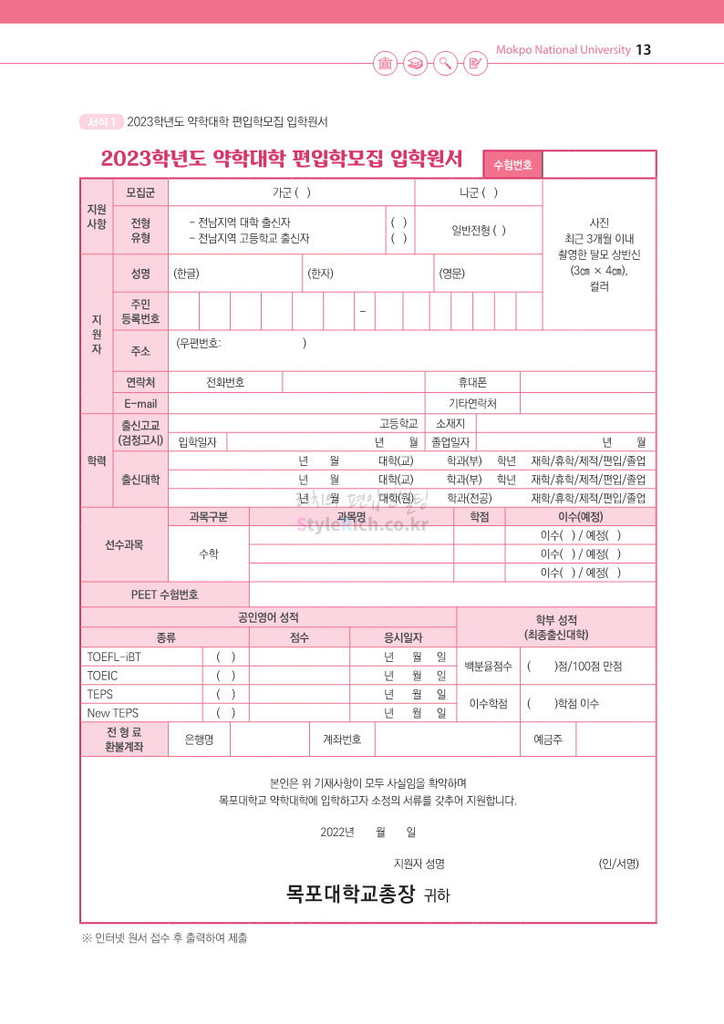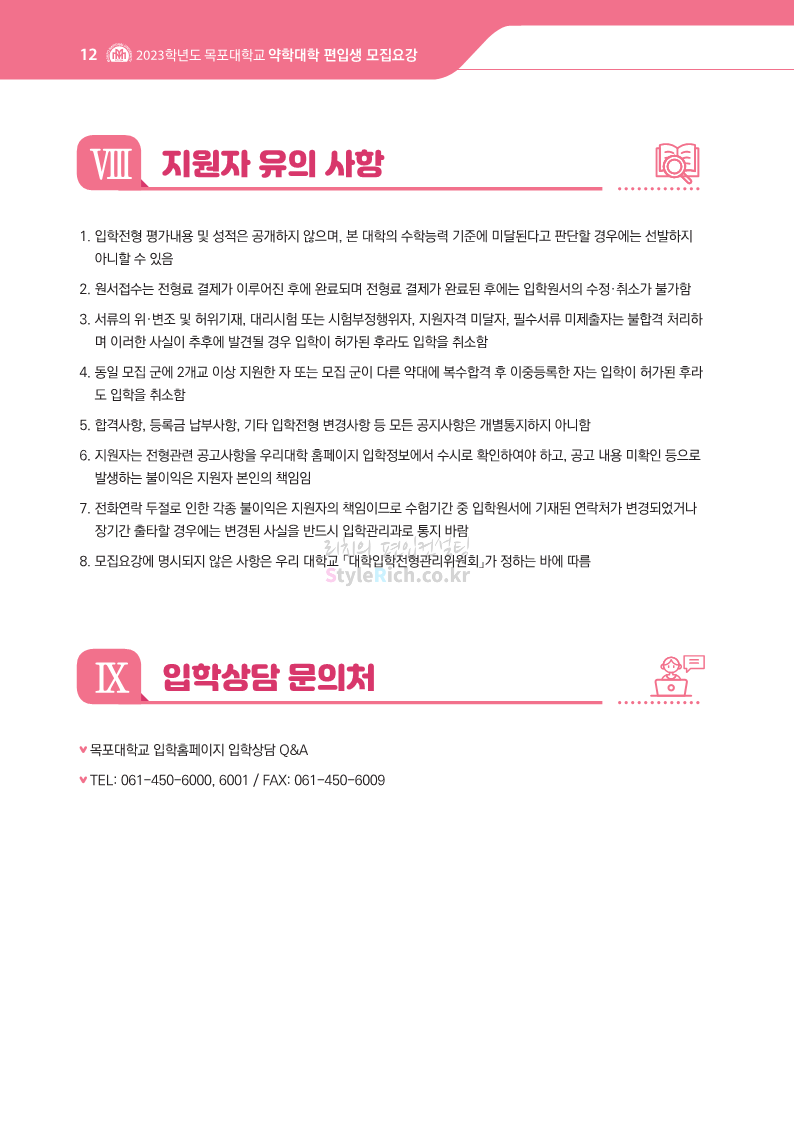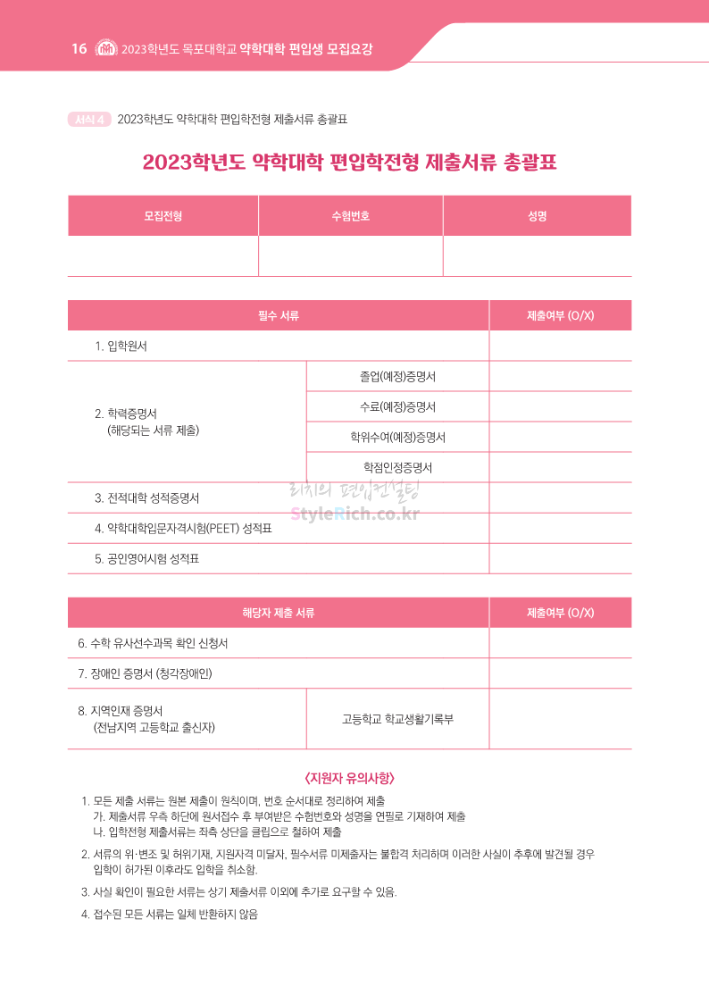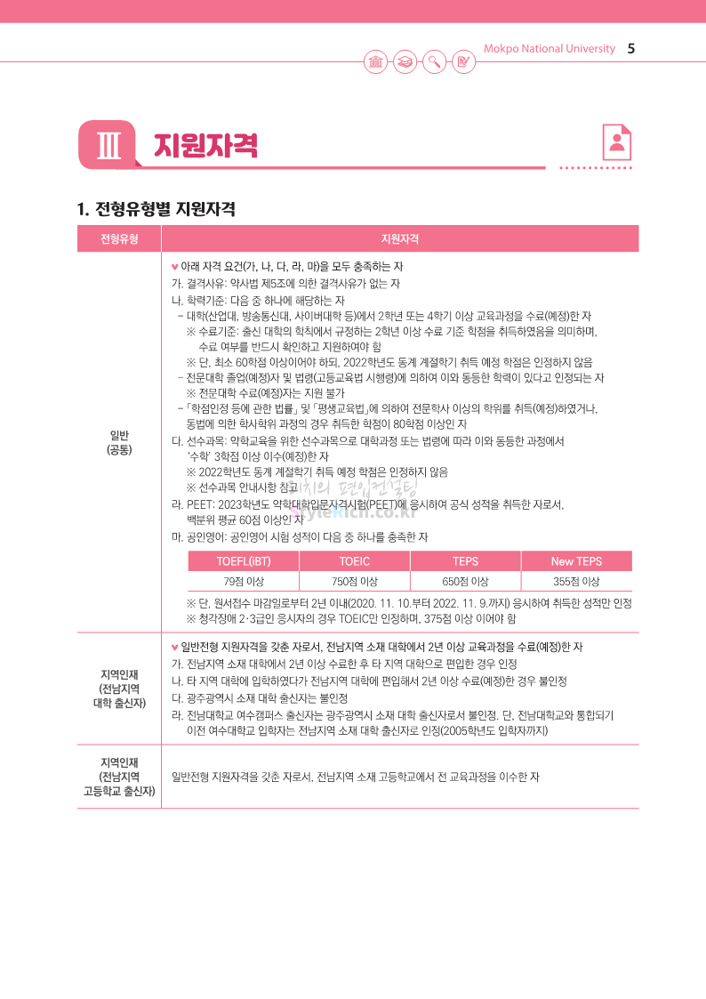 목포대 약대편입 2023학년도 모집요강 간편하게 보자! 2022.09.11 22:15 약대편입 모집요강/2023학년도 약대 모집요강 2023학년도 목포대 약대편입 모집요강(2022.08.05 기준)을 간편하게 확인하세요. * 최종 모집요강 발표 이후에도 내용의 일부가 변경될 수 있으니 지원 전 반드시 목포대 입학처의 모집요강을 확인 바랍니다. 2023학년도 목포대 약대편입 모집요강 다운받기 <출처: 목포대> 공유하기 게시글 관리 리치의 편입컨설팅 저작자표시 비영리 변경금지 (새창열림) '약대편입 모집요강 > 2023학년도 약대 모집요강' 카테고리의 다른 글 순천대 약대편입 2023학년도 모집요강 간편하게 보자! (0) 2022.09.11 차 의과학대 약대편입 2023학년도 모집요강 간편하게 보자! (0) 2022.09.11 경성대 약대편입 2023학년도 모집요강 간편하게 보자! (0) 2022.09.11 계명대 약대편입 2023학년도 모집요강 간편하게 보자! (0) 2022.09.11 조선대 약대편입 2023학년도 모집요강 간편하게 보자! (0) 2022.09.11 댓글 공유하기 다른 글 댓글 이 글 공유하기 구독하기 구독하기 카카오톡 카카오톡 라인 라인 트위터 트위터 Facebook Facebook 카카오스토리 카카오스토리 밴드 밴드 네이버 블로그 네이버 블로그 Pocket Pocket Evernote Evernote 다른 글 순천대 약대편입 2023학년도 모집요강 간편하게 보자! 순천대 약대편입 2023학년도 모집요강 간편하게 보자! 2022.09.11 차 의과학대 약대편입 2023학년도 모집요강 간편하게 보자! 차 의과학대 약대편입 2023학년도 모집요강 간편하게 보자! 2022.09.11 경성대 약대편입 2023학년도 모집요강 간편하게 보자! 경성대 약대편입 2023학년도 모집요강 간편하게 보자! 2022.09.11 계명대 약대편입 2023학년도 모집요강 간편하게 보자! 계명대 약대편입 2023학년도 모집요강 간편하게 보자! 2022.09.11 다른 글 더 둘러보기