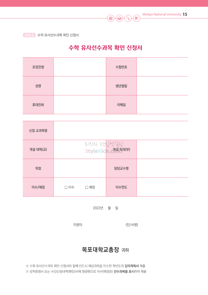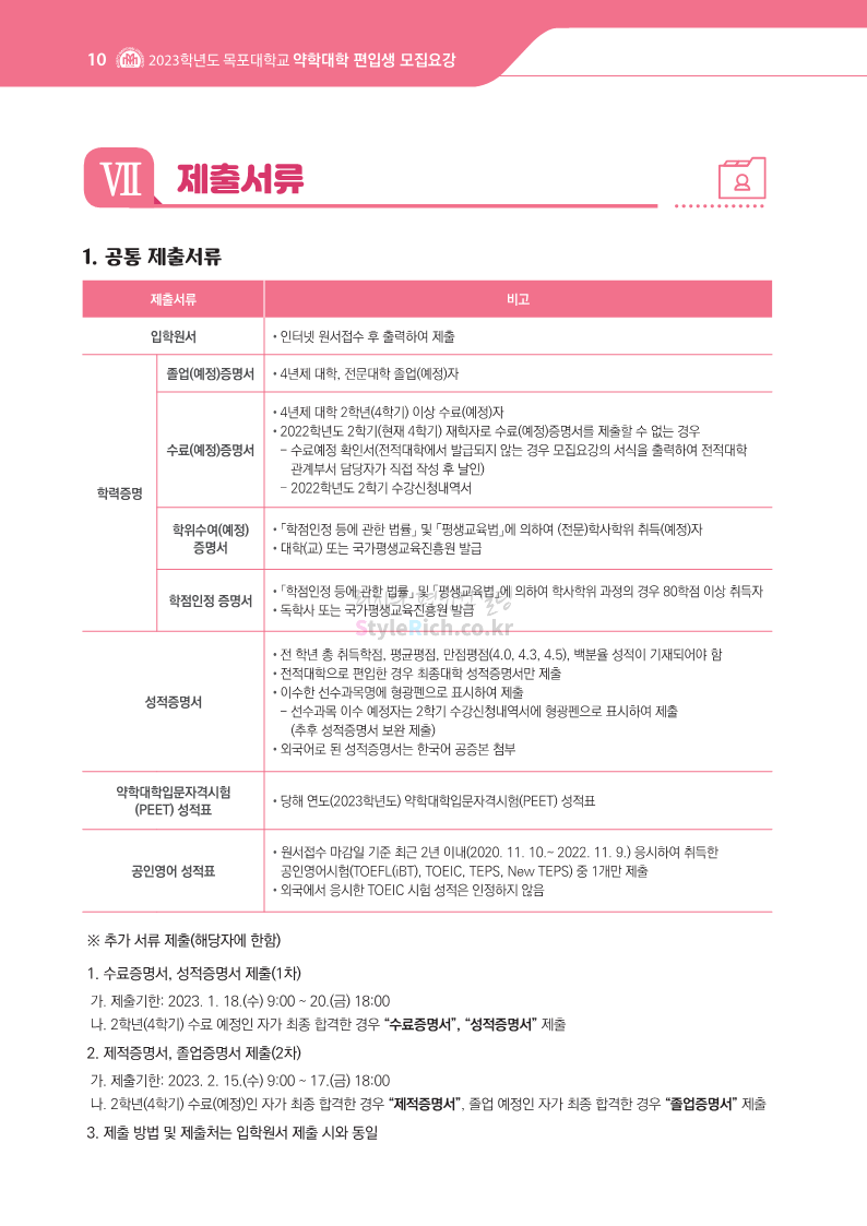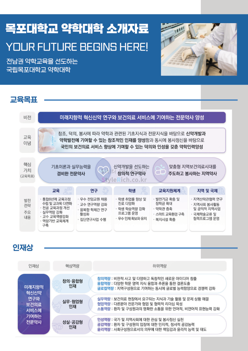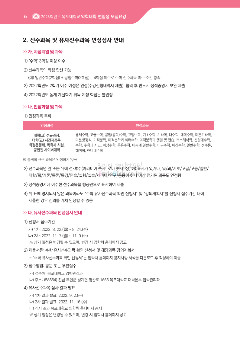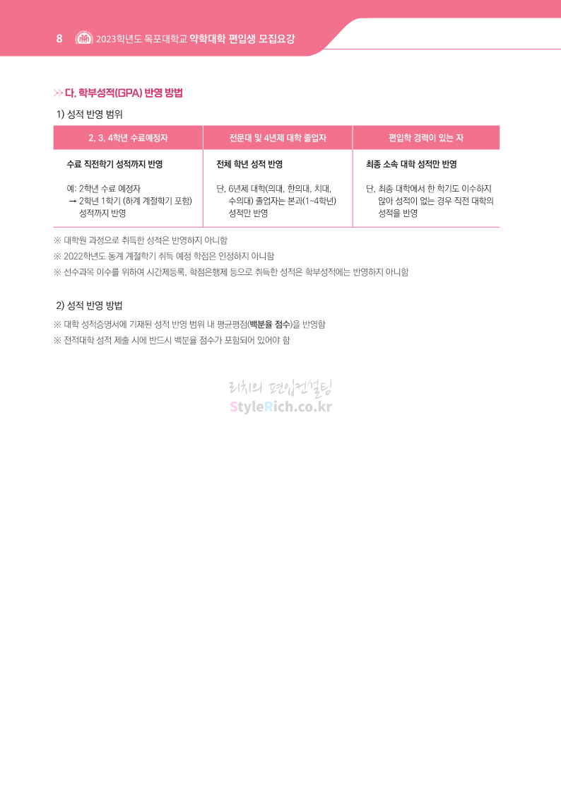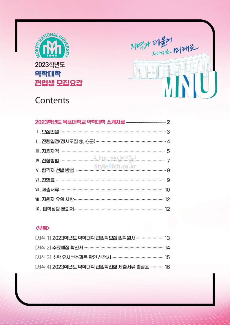 목포대 약대편입 2023학년도 모집요강 간편하게 보자! 2022.09.11 22:15 약대편입 모집요강/2023학년도 약대 모집요강 2023학년도 목포대 약대편입 모집요강(2022.08.05 기준)을 간편하게 확인하세요. * 최종 모집요강 발표 이후에도 내용의 일부가 변경될 수 있으니 지원 전 반드시 목포대 입학처의 모집요강을 확인 바랍니다. 2023학년도 목포대 약대편입 모집요강 다운받기 <출처: 목포대> 공유하기 게시글 관리 리치의 편입컨설팅 저작자표시 비영리 변경금지 (새창열림) '약대편입 모집요강 > 2023학년도 약대 모집요강' 카테고리의 다른 글 순천대 약대편입 2023학년도 모집요강 간편하게 보자! (0) 2022.09.11 차 의과학대 약대편입 2023학년도 모집요강 간편하게 보자! (0) 2022.09.11 경성대 약대편입 2023학년도 모집요강 간편하게 보자! (0) 2022.09.11 계명대 약대편입 2023학년도 모집요강 간편하게 보자! (0) 2022.09.11 조선대 약대편입 2023학년도 모집요강 간편하게 보자! (0) 2022.09.11 댓글 공유하기 다른 글 댓글 이 글 공유하기 구독하기 구독하기 카카오톡 카카오톡 라인 라인 트위터 트위터 Facebook Facebook 카카오스토리 카카오스토리 밴드 밴드 네이버 블로그 네이버 블로그 Pocket Pocket Evernote Evernote 다른 글 순천대 약대편입 2023학년도 모집요강 간편하게 보자! 순천대 약대편입 2023학년도 모집요강 간편하게 보자! 2022.09.11 차 의과학대 약대편입 2023학년도 모집요강 간편하게 보자! 차 의과학대 약대편입 2023학년도 모집요강 간편하게 보자! 2022.09.11 경성대 약대편입 2023학년도 모집요강 간편하게 보자! 경성대 약대편입 2023학년도 모집요강 간편하게 보자! 2022.09.11 계명대 약대편입 2023학년도 모집요강 간편하게 보자! 계명대 약대편입 2023학년도 모집요강 간편하게 보자! 2022.09.11 다른 글 더 둘러보기