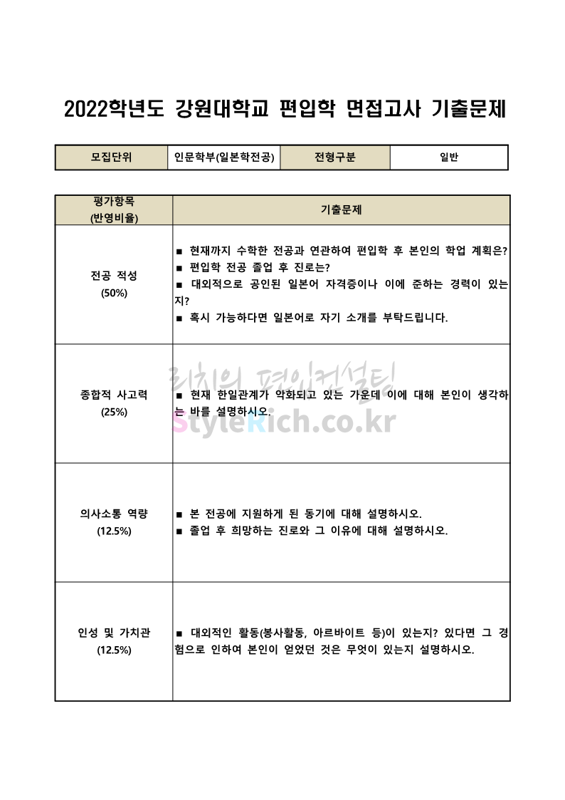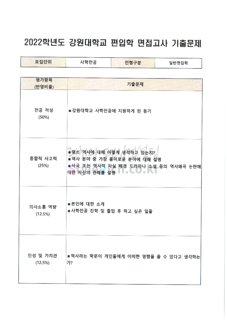 2022학년도 강원대 편입 면접 기출문제(인문대)