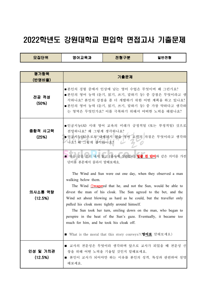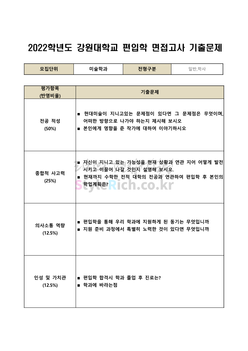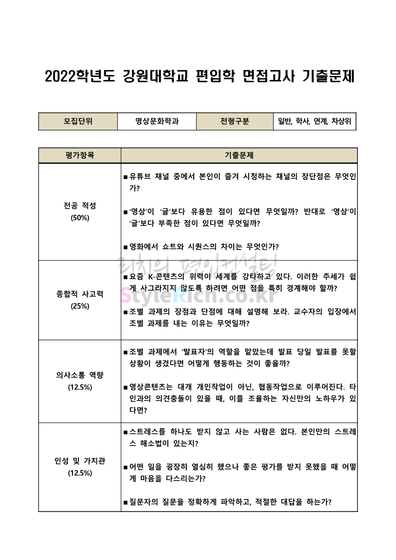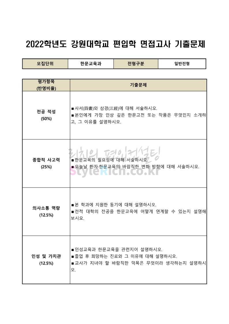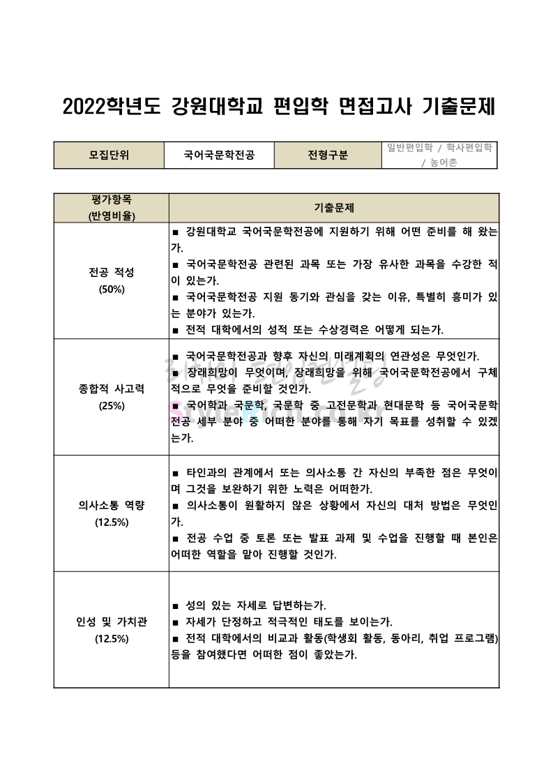 2022학년도 강원대 편입 면접 기출문제(문예공대)