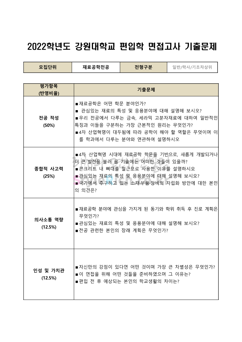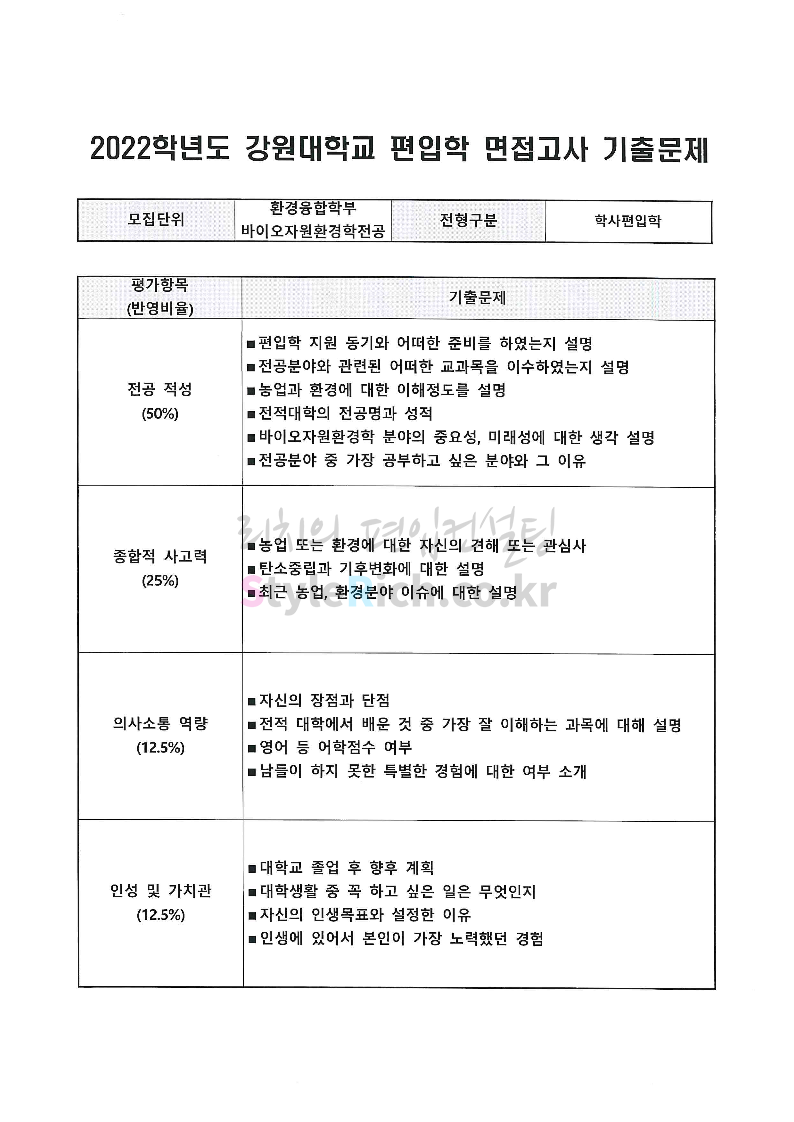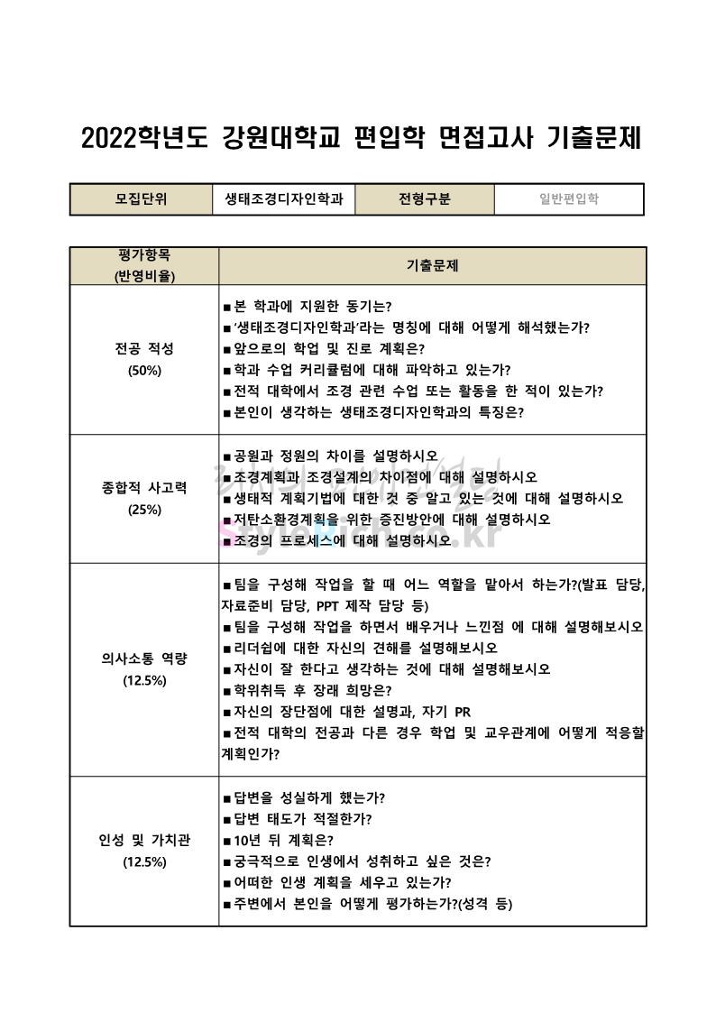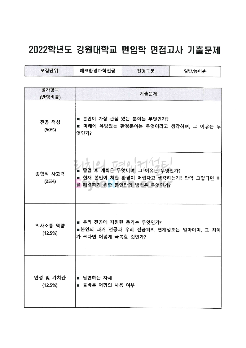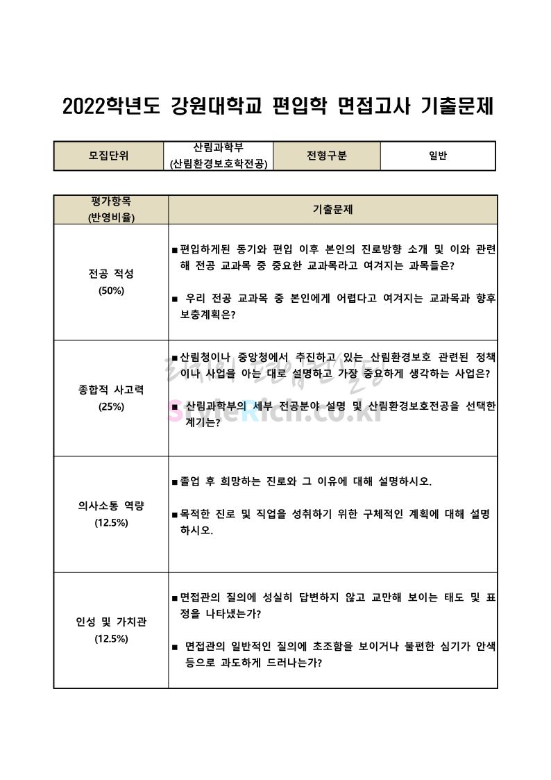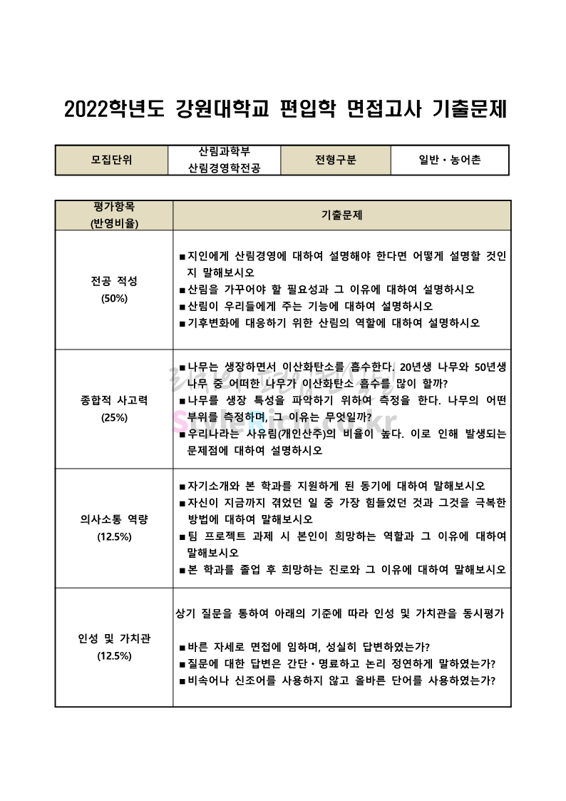 2022학년도 강원대 편입 면접 기출문제(산림대)