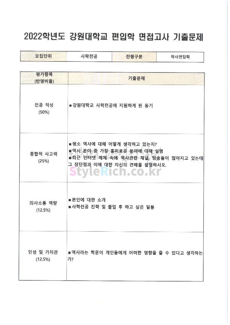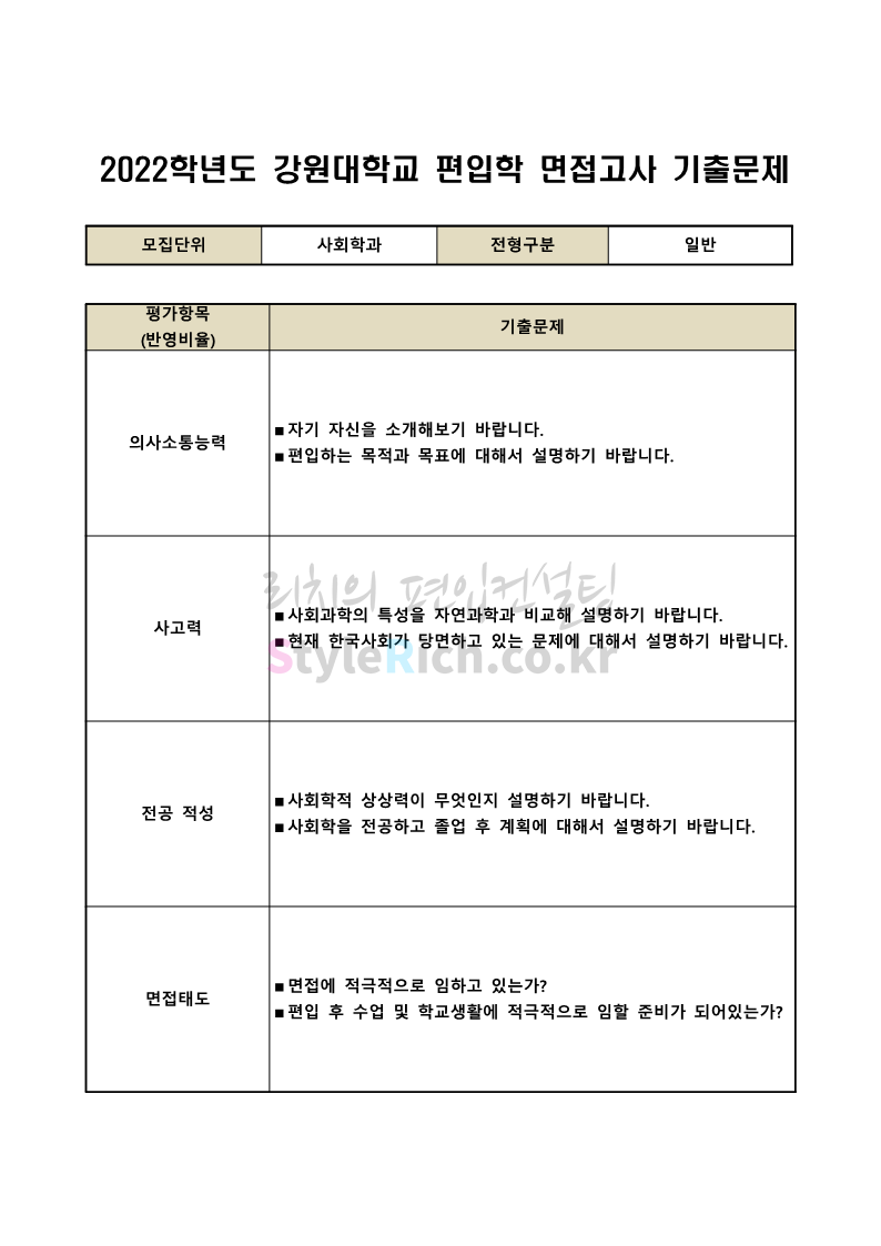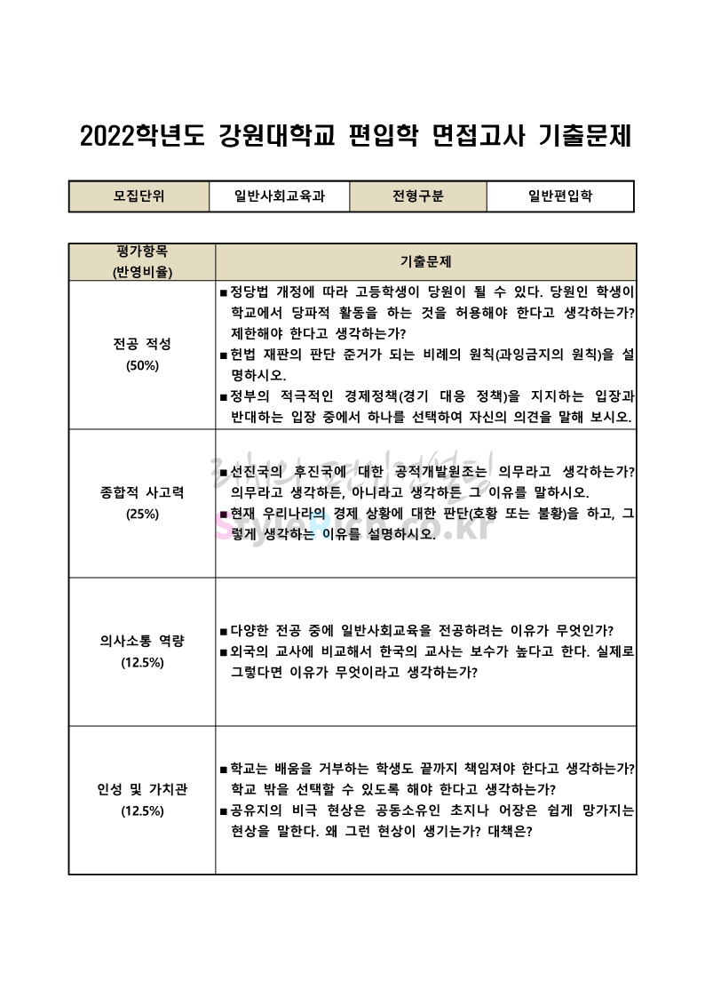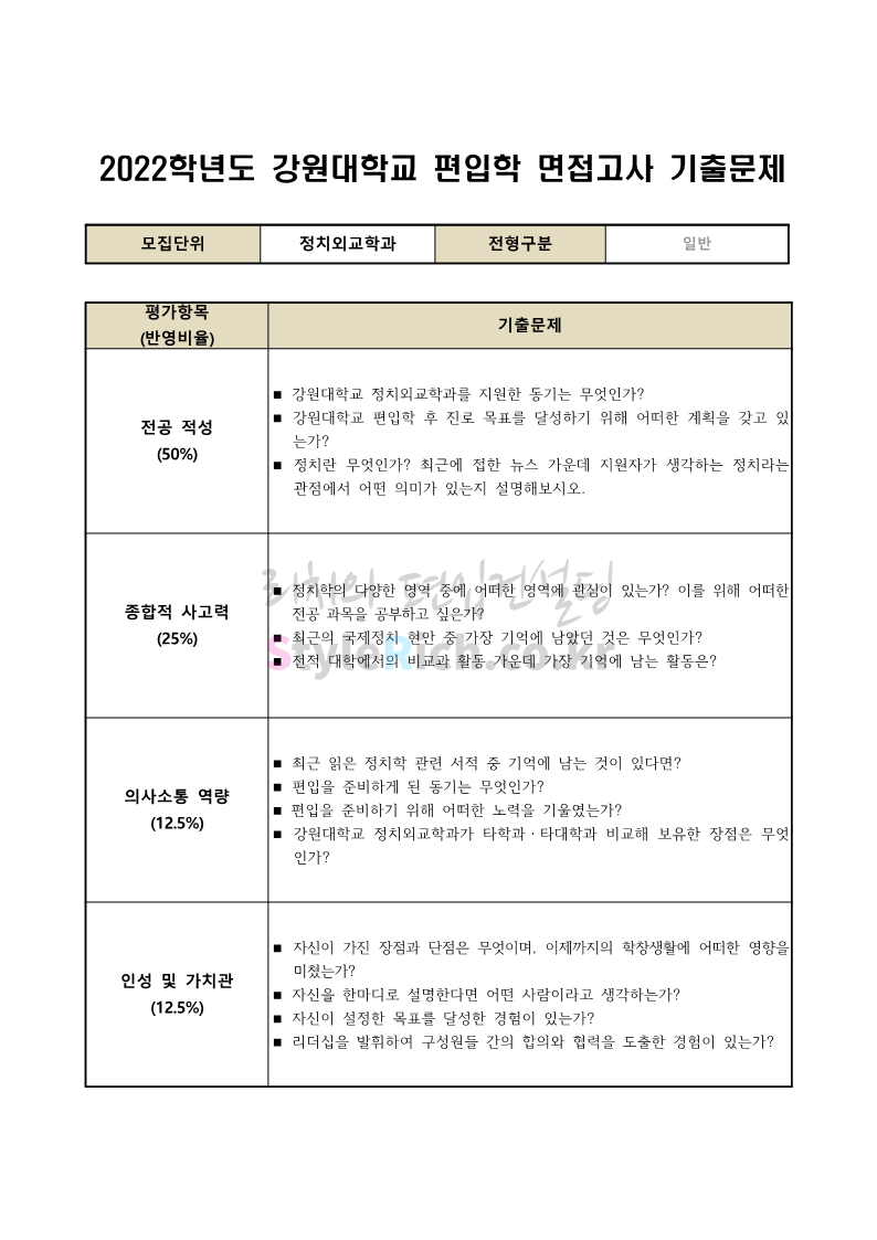2022학년도 강원대 편입 면접 기출문제(사회대)