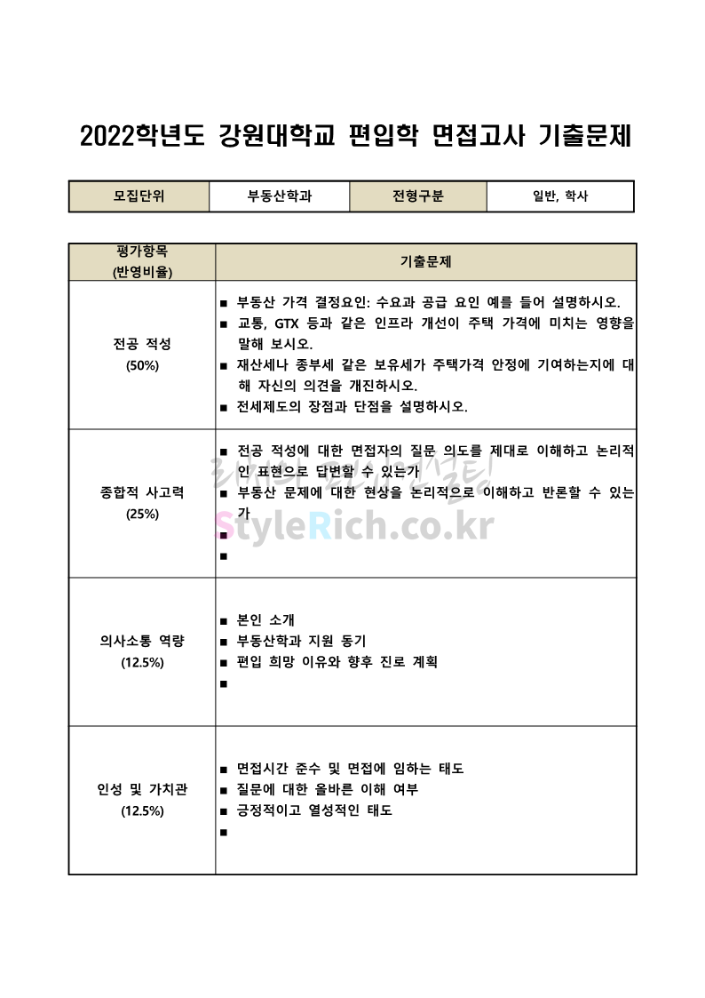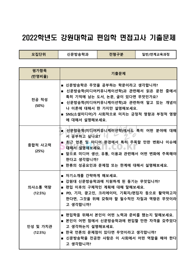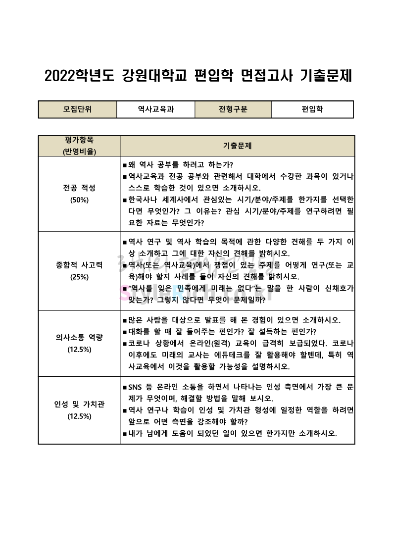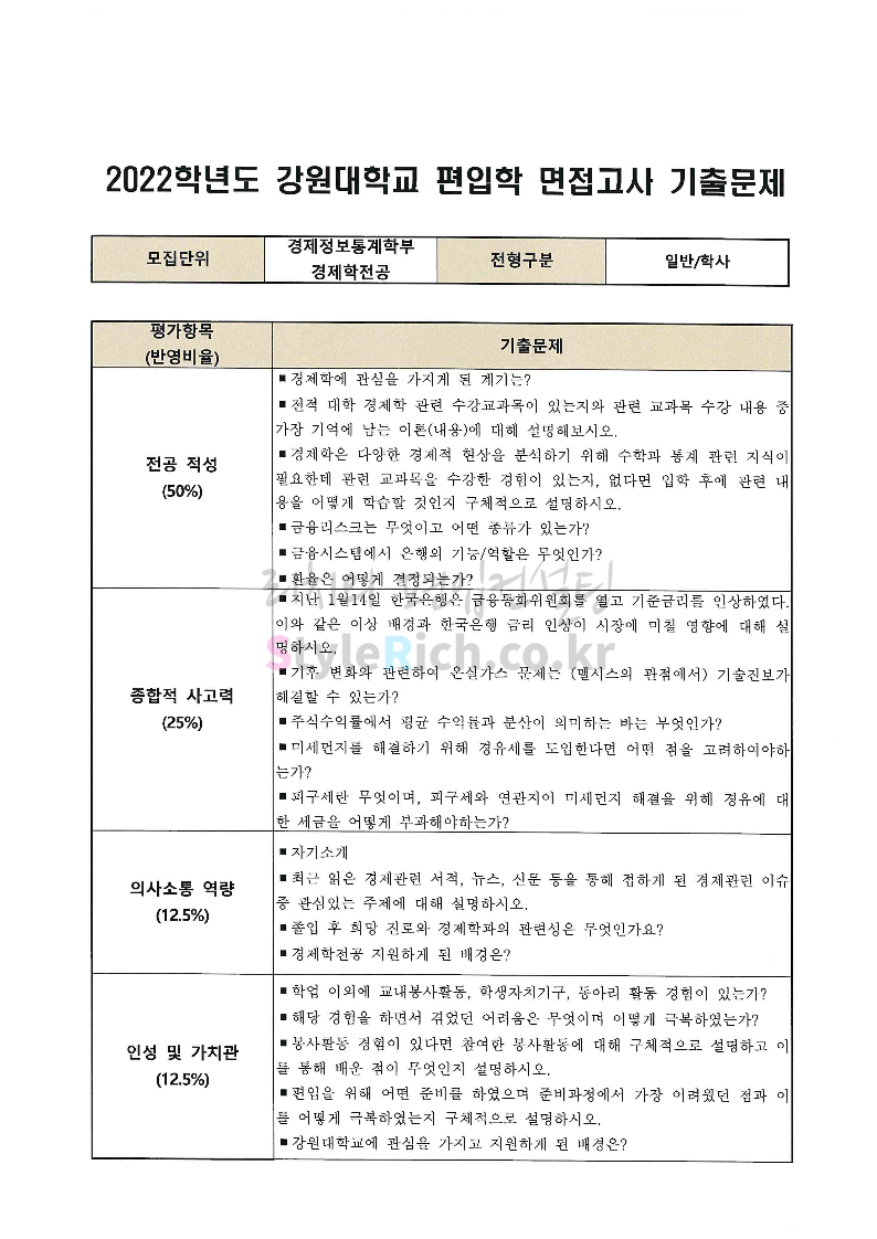 2022학년도 강원대 편입 면접 기출문제(사회대)