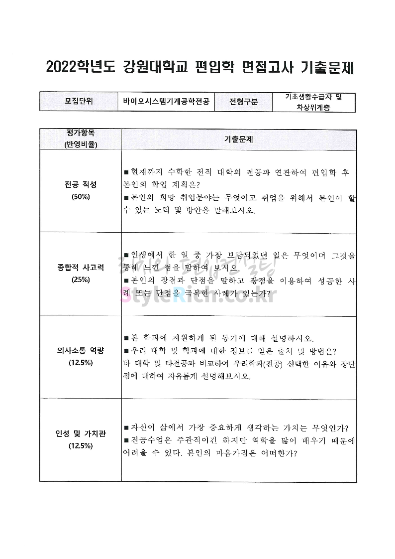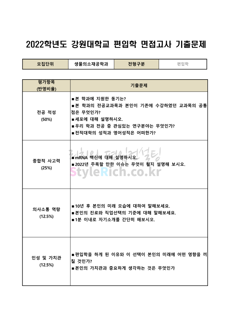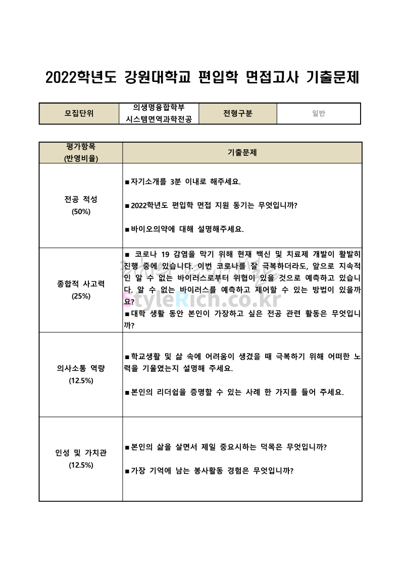 2022학년도 강원대 편입 면접 기출문제(의생대)