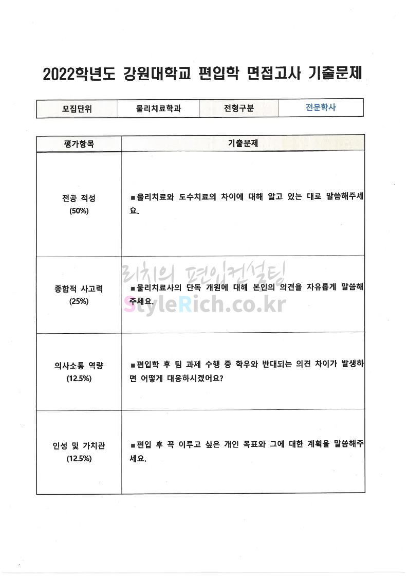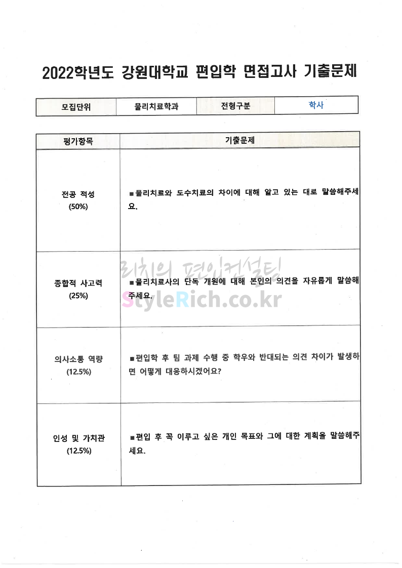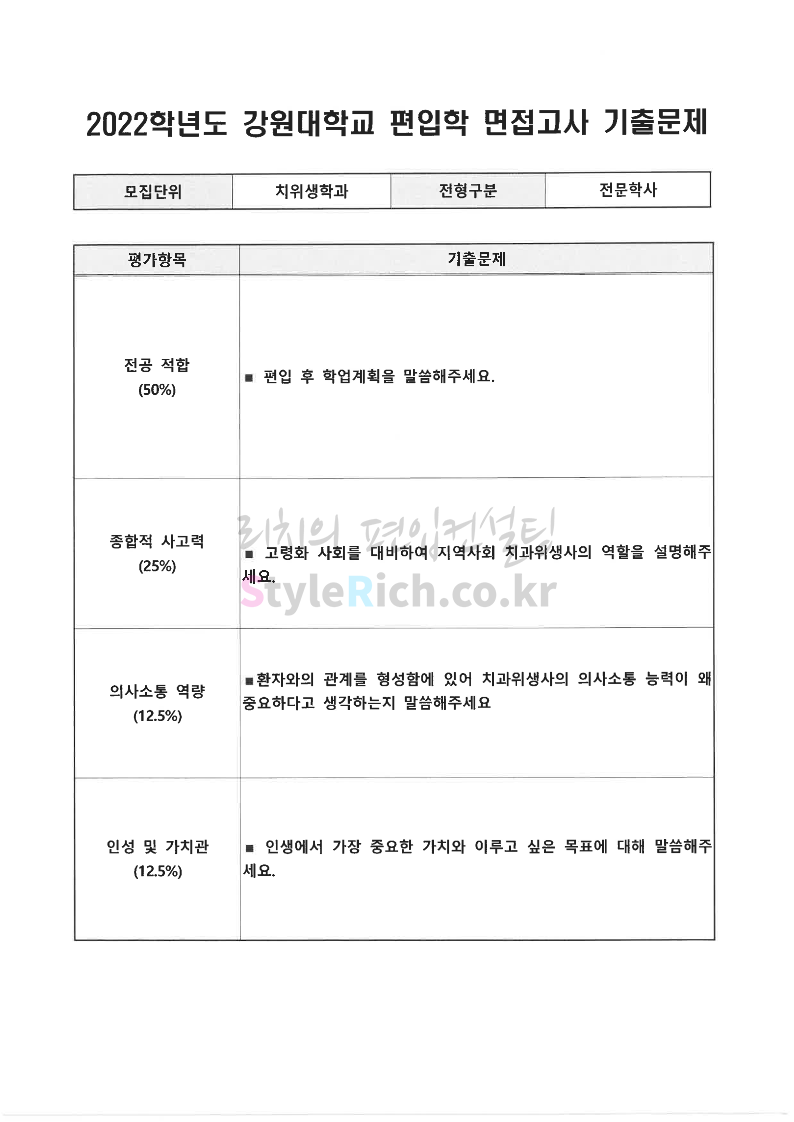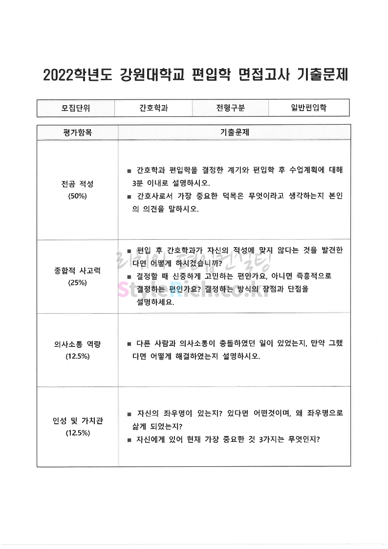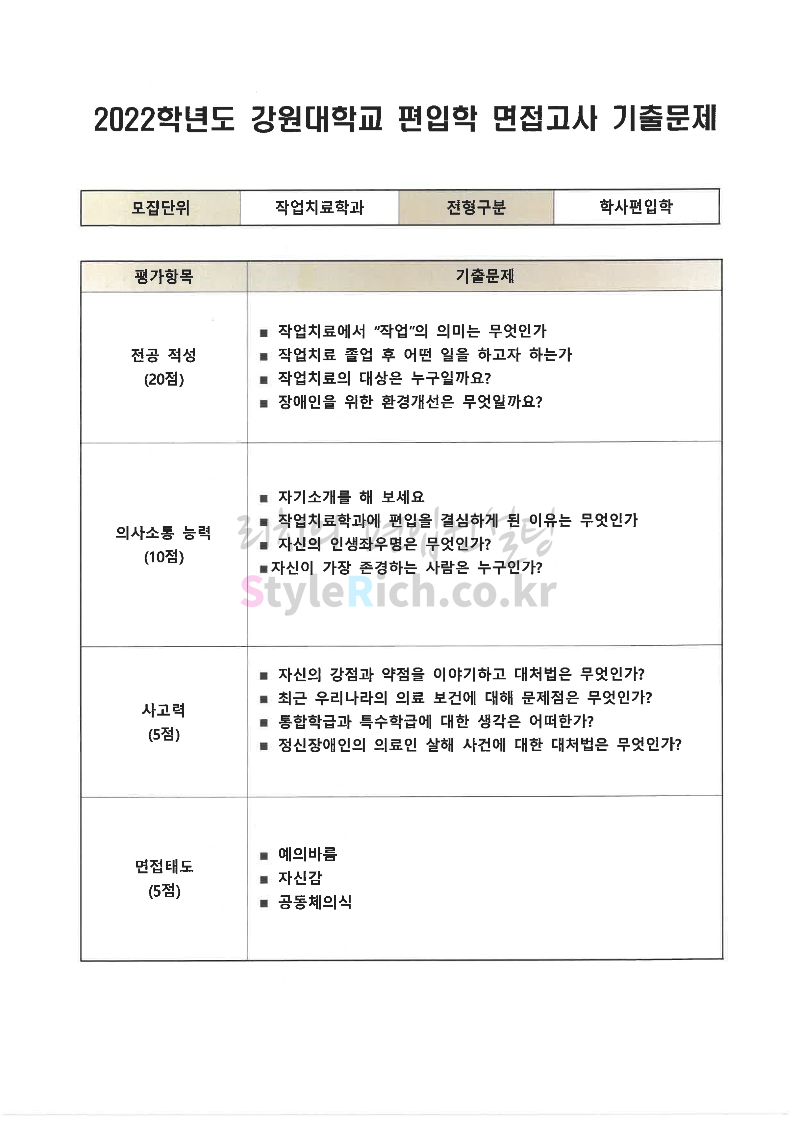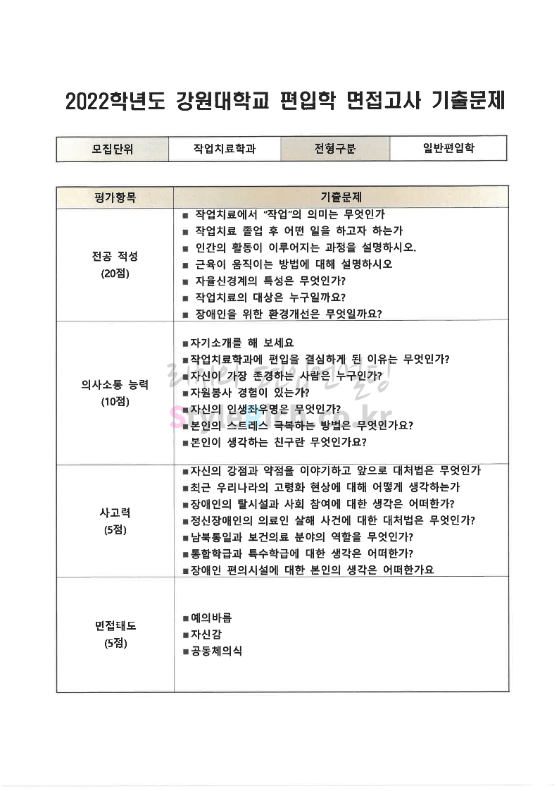 2022학년도 강원대 편입 면접 기출문제(보건과학대)
