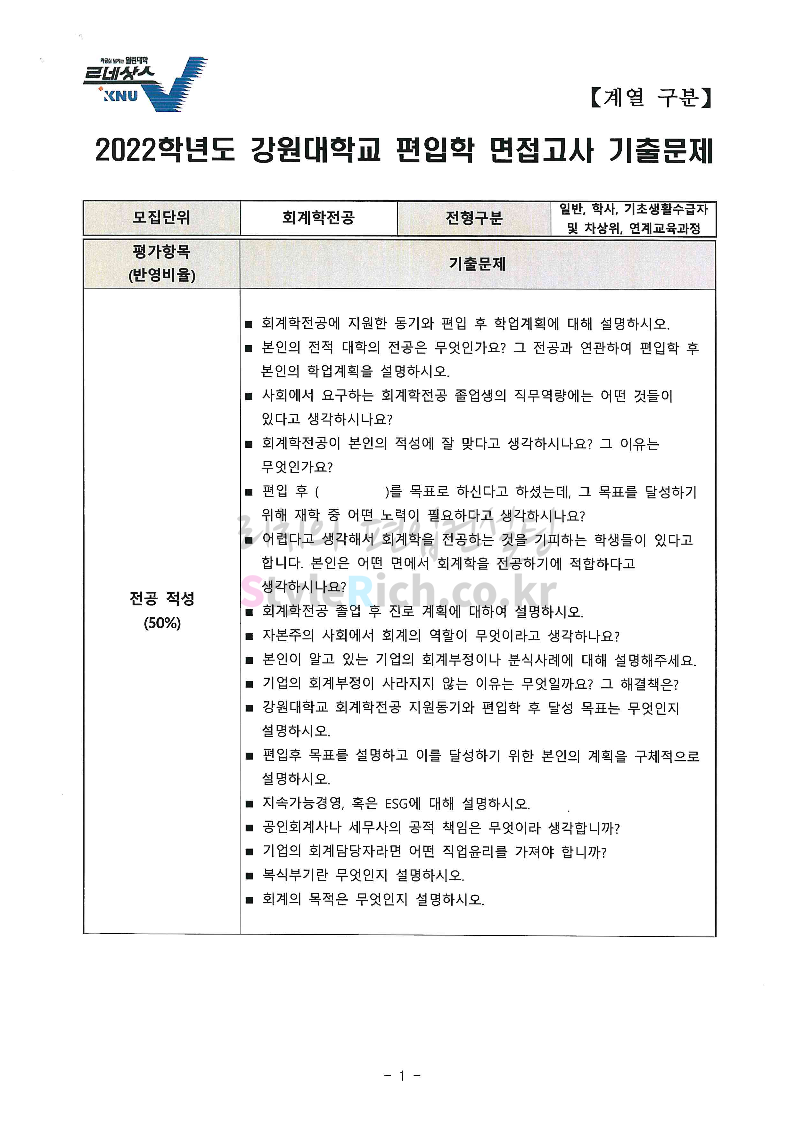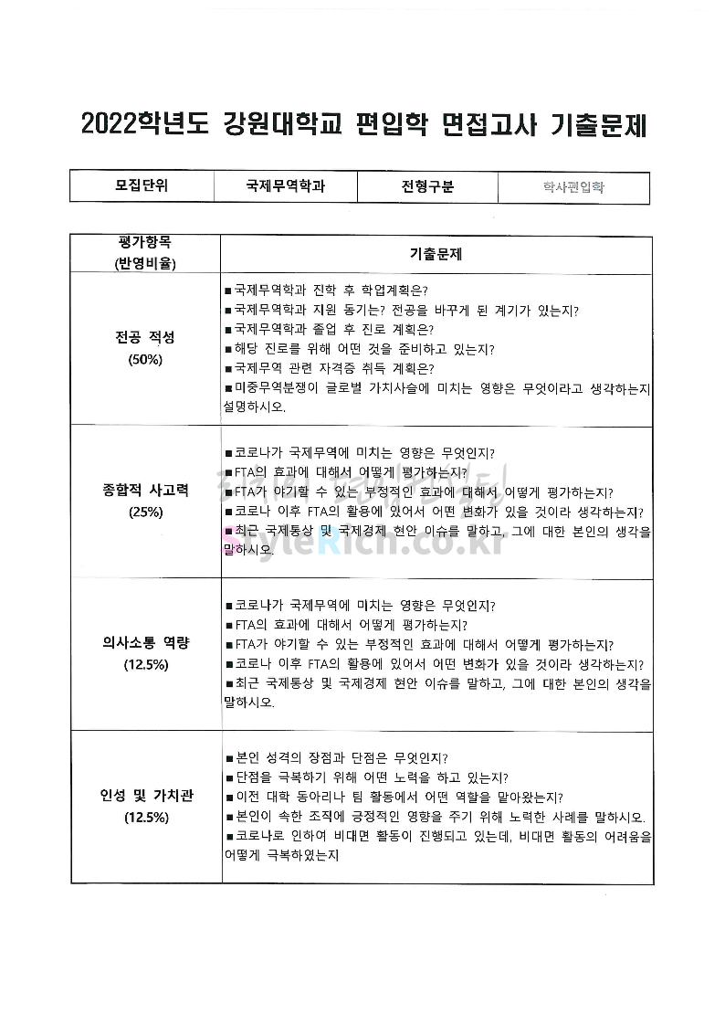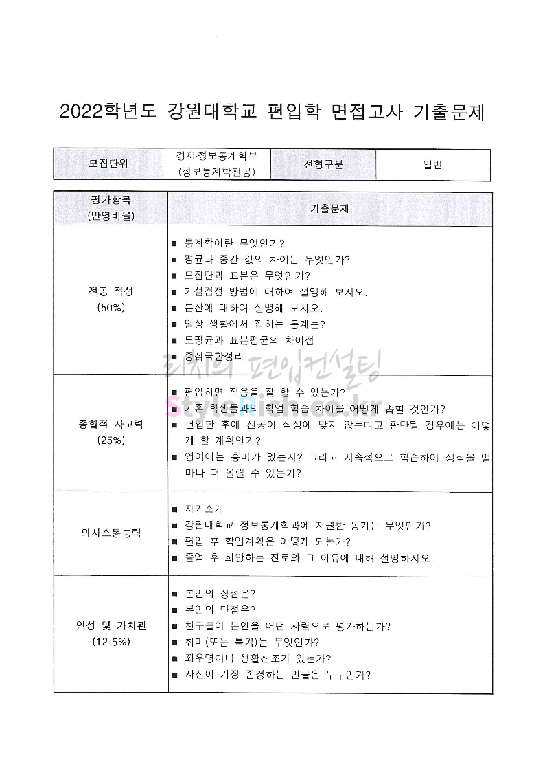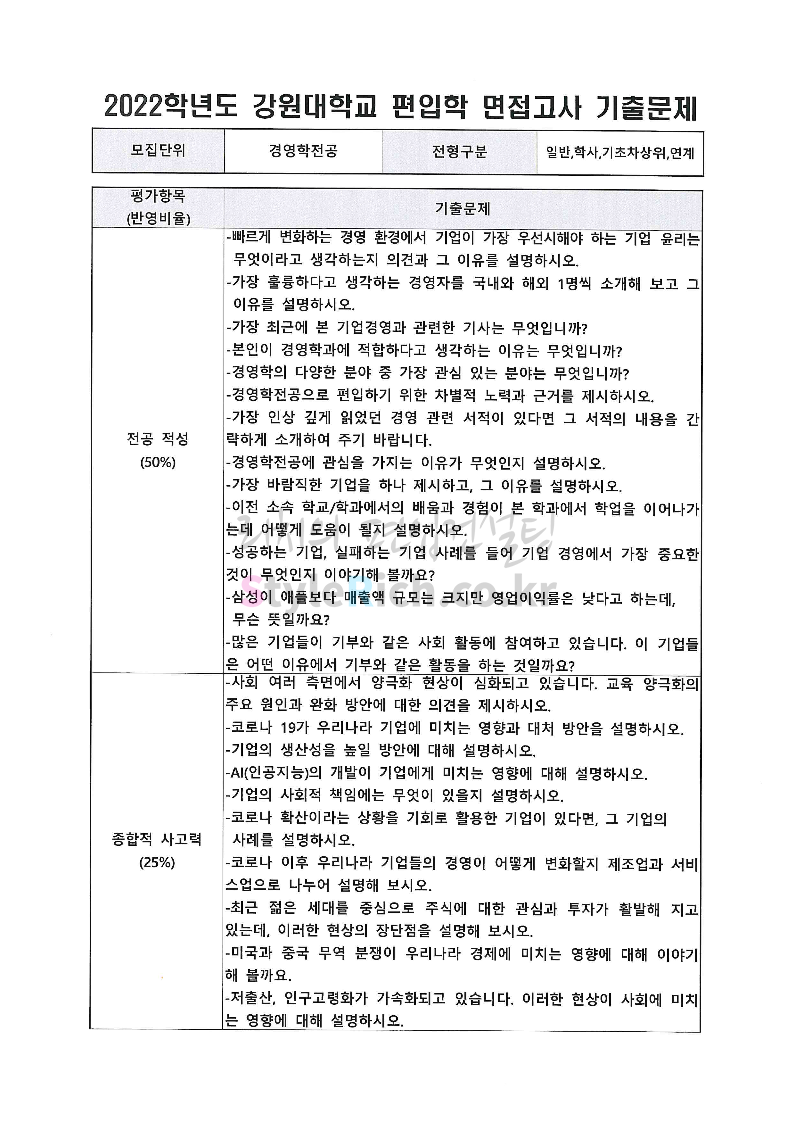 2022학년도 강원대 편입 면접 기출문제(경영대)