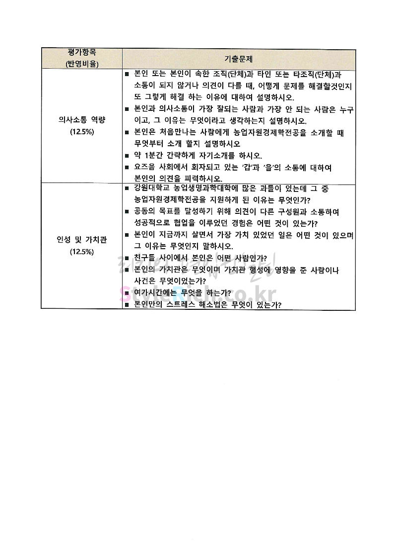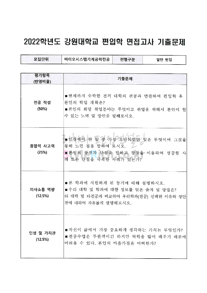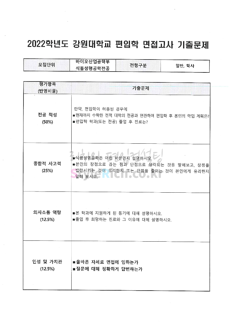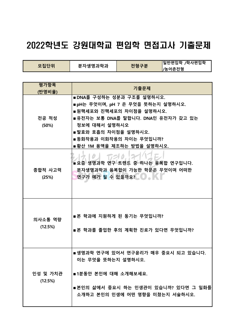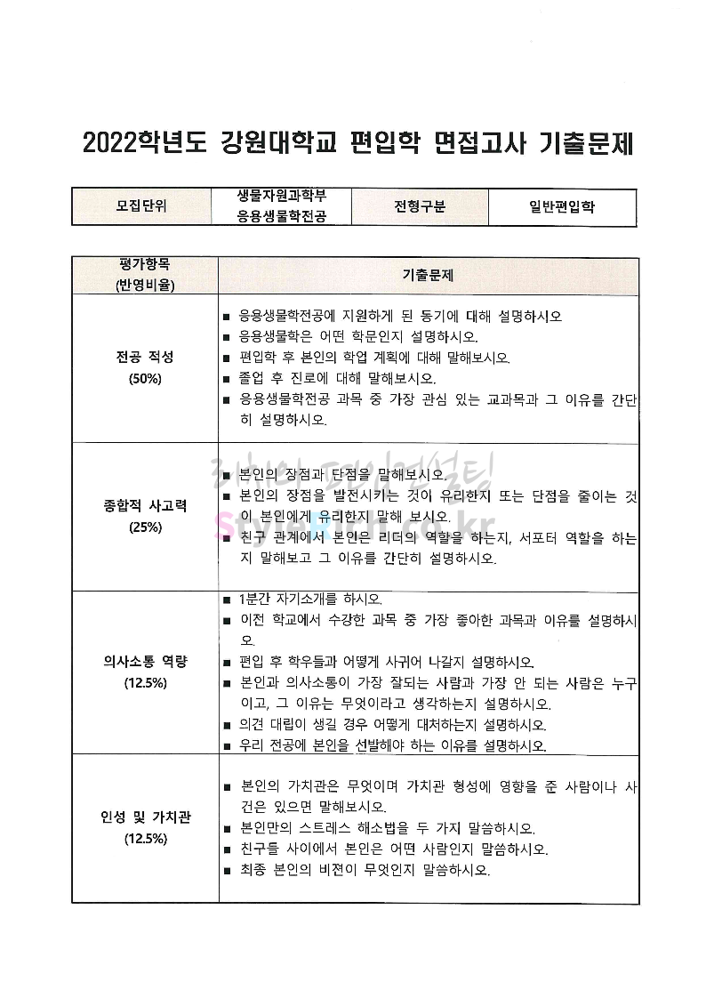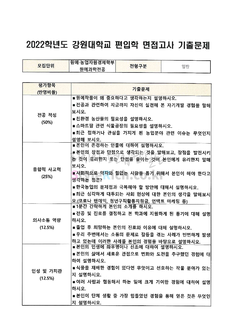 2022학년도 강원대 편입 면접 기출문제(농생대)