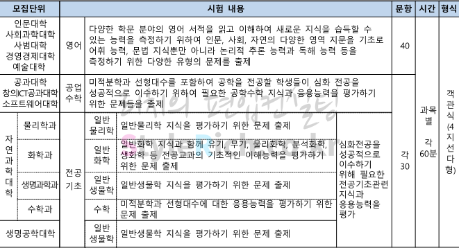 2022학년도 중앙대 편입 영어 필기고사는 40문항/60분, 객관식 4지선다형, 총점 100점 만점에 문항 당 배점이 다르며, 다양한 학문 분야의 영어 서적을 읽고 이해하여, 새로운 지식을 습득할 수 있는 능력을 측정하기 위하여 인문, 사회, 자연의 다양한 영역 지문을 기초로 어휘 능력, 문법 지식뿐만 아니라 논리적 추론 능력과 독해 능력 등을 측정하기 위한 다양한 문제를 출제합니다. 공업수학 필기고사는 30문항/60분, 객관식 4지선다형, 총점 100점 만점에 문항 당 배점은 다르며, 미적분학과 선형대수를 포함하여 공학을 전공할 학생들이 심화 전공을 성공적으로 이수하기 위하여 필요한 공학수학 지식과 응용능력을 평가하기 위한 문제들을 출제합니다. 일반물리학은 30문항/60분, 객관식 4지선다형, 총점 100점 만점에 문항 당 배점은 다르며, 일반물리학 지식을 평가하기 위한 문제를 출제합니다. 일반화학은 30문항/60분, 객관식 4지선다형, 총점 100점 만점에 문항 당 배점은 다르며, 일반화학 지식과 함께 유기, 무기, 물리화학, 분석화학, 생화학 등 전공교과의 기초적인 이해능력을 평가하기 위한 문제를 출제합니다. 수학은 30문항/60분, 객관식 4지선다형, 총점 100점 만점에 문항 당 배점은 다르며, 미적분학과 선형대수에 대한 응용능력을 평가하기 위한 문제를 출제합니다.