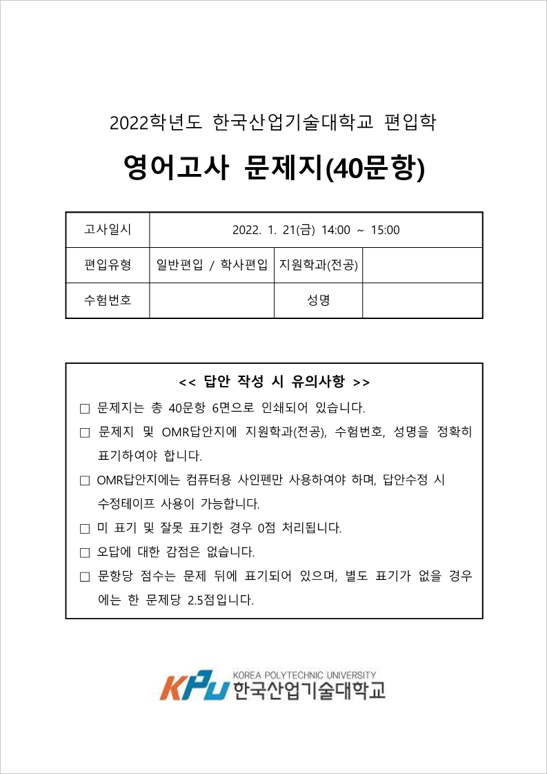 2022학년도 한국공학대(구 한국산업기술대) 편입 영어 필답고사는 40문항/60분, 객관식 4지선다형, 100점 만점에 문항 당