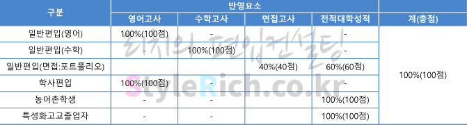 2022학년도 한국공학대(구 한국산업기술대) 편입 전형방법에서 일반편입(영어)은 영어 100%, 일반편입(수학)은 수학 100%, 일반편입(면접·포트폴리오)는 면접고사 40%, 전적대학성적 60%, 학사편입은 영어고사 100%, 농어촌학생은 전적대학성적 100%, 특성화고교졸업자는 전적대학성적 100% 입니다.