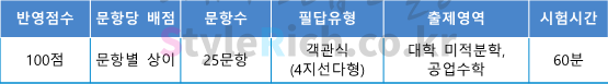2022학년도 한국공학대(구 한국산업기술대) 편입 수학 필답고사는 40문항/60분, 객관식 4지선다형, 100점 만점에 문항 당 배점은 3, 4, 5점으로 문항 당 배점은 다르며, 대학 미적분학, 공업수학을 출제합니다.