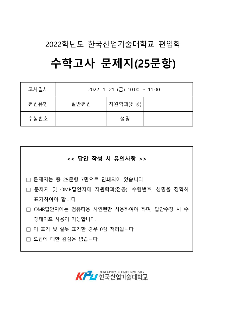 2022학년도 한국공학대(구 한국산업기술대 편입 필답고사 수학