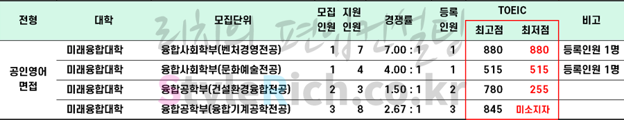 * 특성화고졸 재직자전형에서 융합사회학부(헬스피트니스전공)은 공인영어(토익) 점수가 없는 것으로 보아 등록인원이 없는 것으로 추정