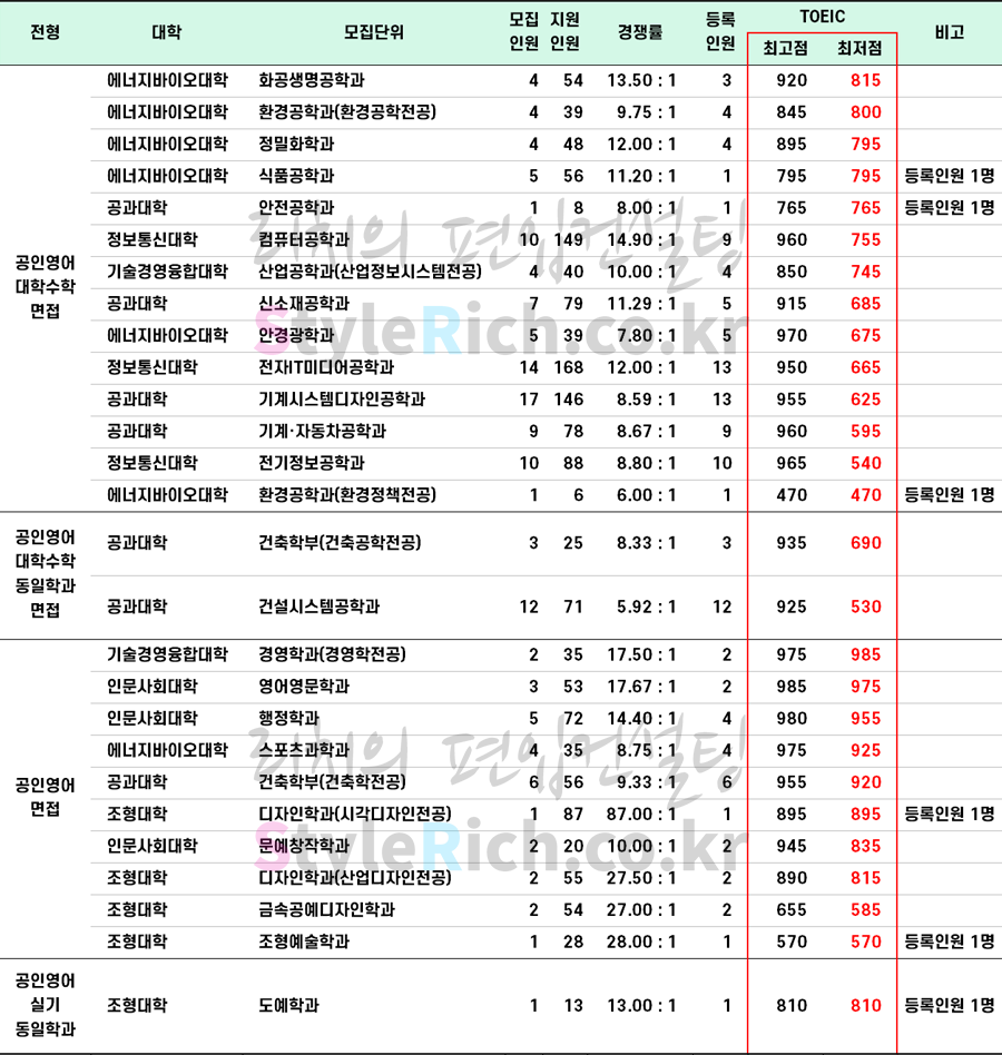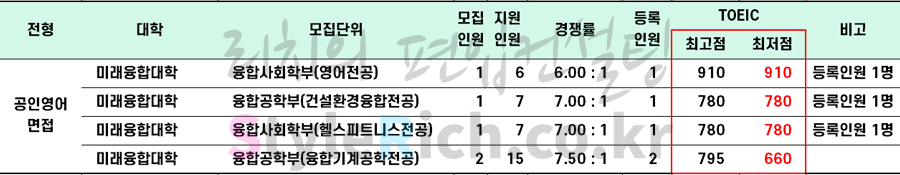 * 특성화고졸 재직자전형에서 융합사회학부(헬스피트니스전공)은 공인영어(토익) 점수가 없는 것으로 보아 등록인원이 없는 것으로 추정