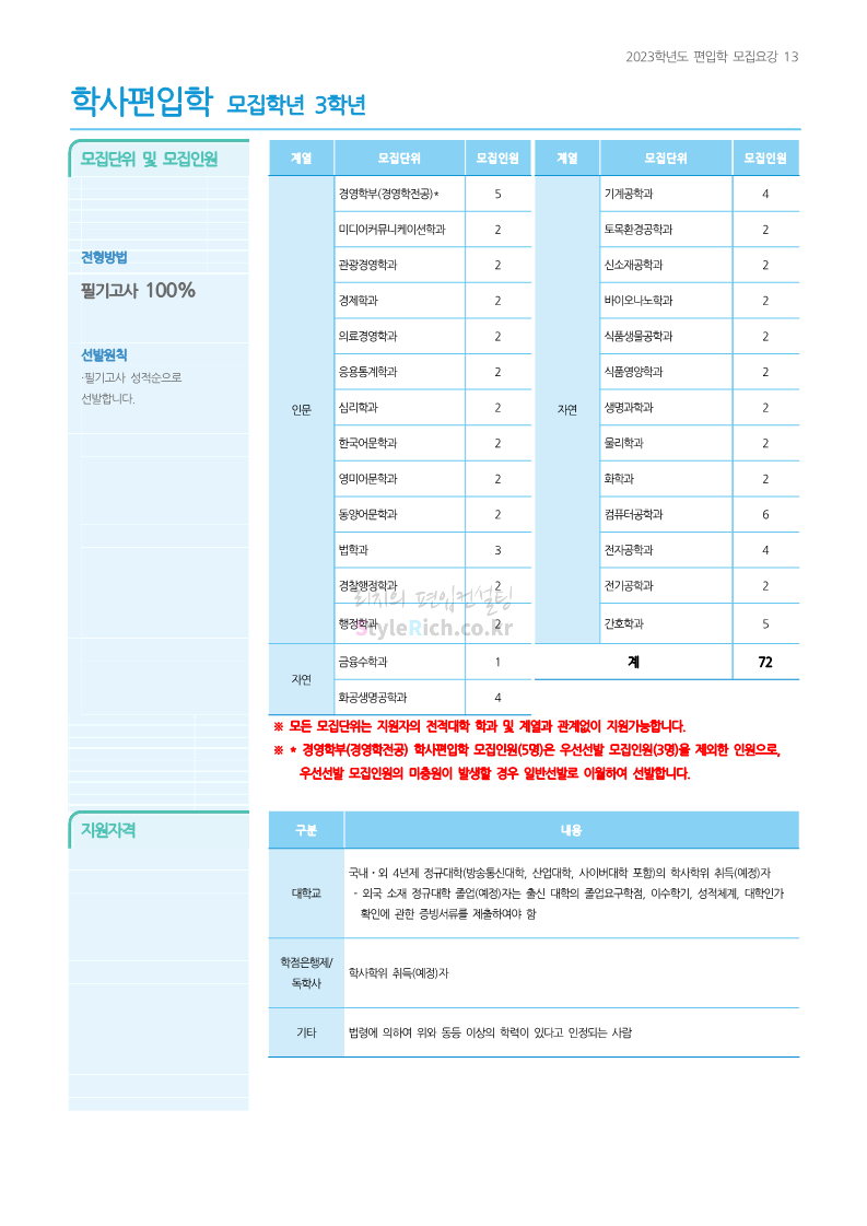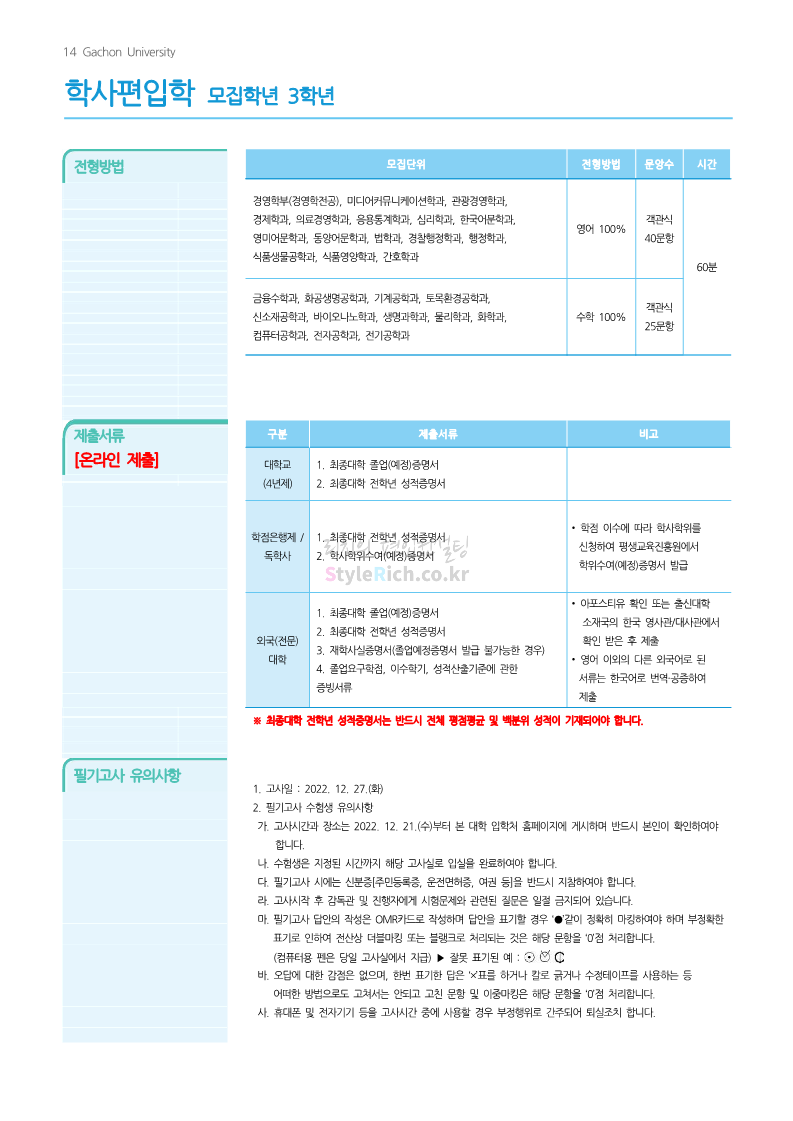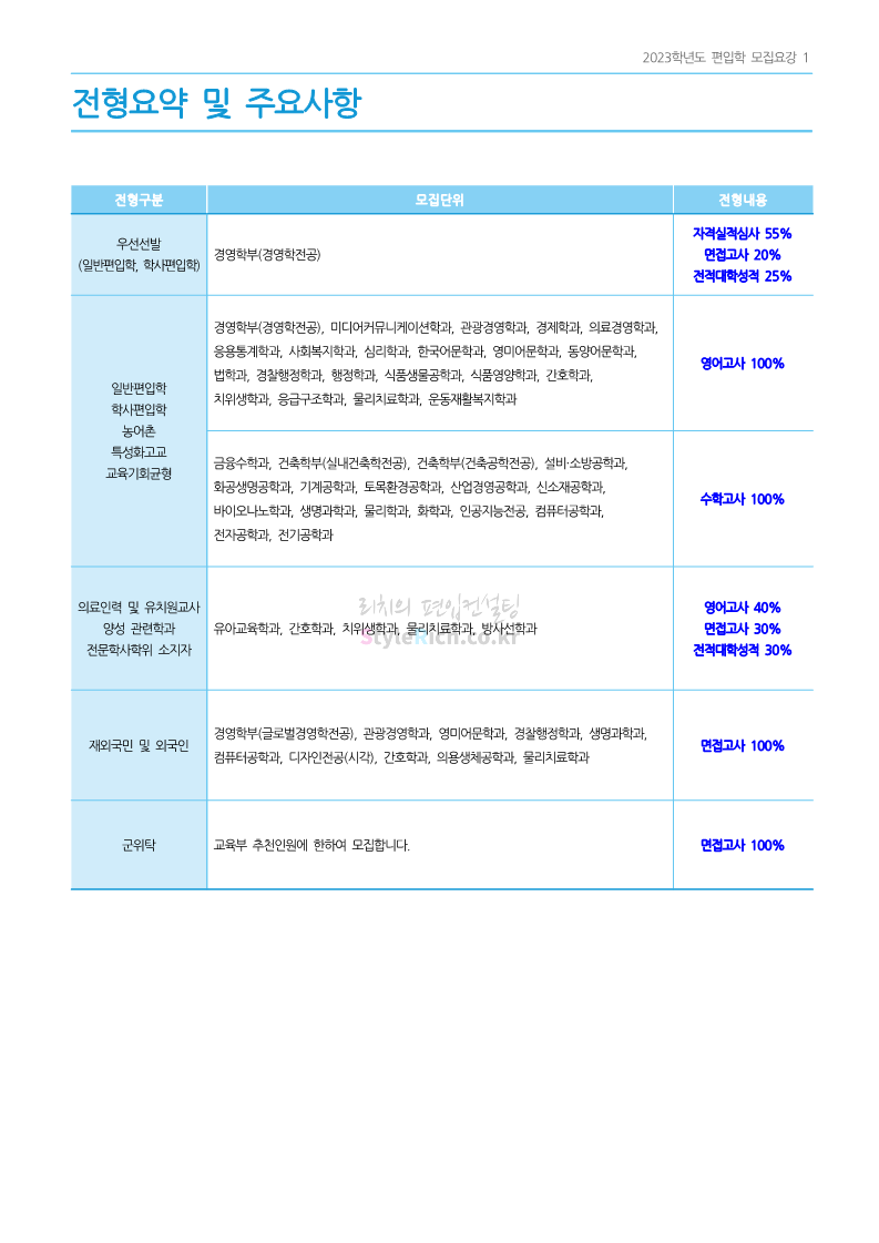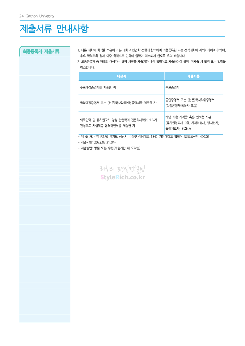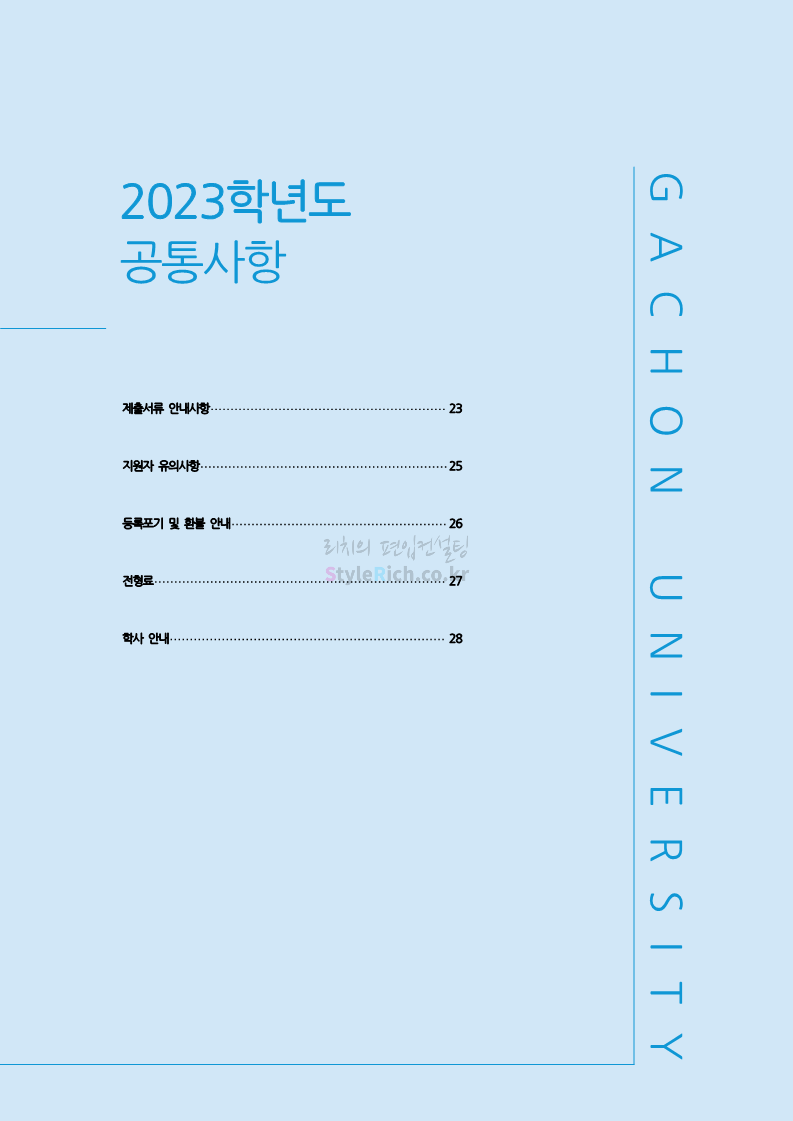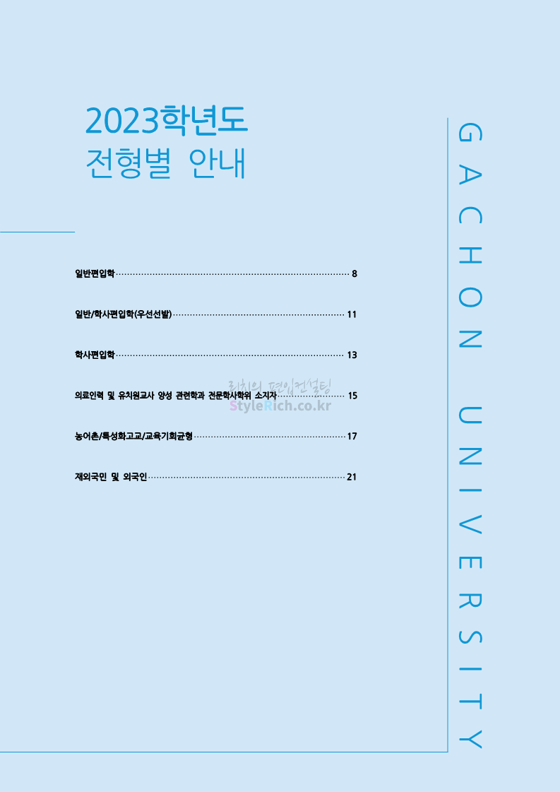 가천대 편입 2023학년도 모집요강 간편하게 보자! 2022.11.20 15:25 편입 모집요강/2023학년도 모집요강 2023학년도 가천대 편입 모집요강(2022.11.22 기준)을 간편하게 확인하세요. * 최종 모집요강 발표 이후에도 내용의 일부가 변경될 수 있으니 지원 전 반드시 가천대 입학처의 모집요강을 확인 바랍니다. 가천대 편입 최신 모집요강 확인하기 <출처: 가천대> 공유하기 게시글 관리 리치의 편입컨설팅 저작자표시 비영리 변경금지 (새창열림) '편입 모집요강 > 2023학년도 모집요강' 카테고리의 다른 글 광운대 편입 2023학년도 모집요강 간편하게 보자! (0) 2022.11.29 한국항공대 편입 2023학년도 모집요강 간편하게 보자! (0) 2022.11.25 단국대(천안) 편입 2023학년도 모집요강 간편하게 보자! (0) 2022.11.24 단국대(죽전) 편입 2023학년도 모집요강 간편하게 보자! (0) 2022.11.24 고려대 편입 2023학년도 자연계 필기고사 출제범위 및 참고도서를 알아보자! (0) 2022.11.20 댓글 공유하기 다른 글 댓글 이 글 공유하기 구독하기 구독하기 카카오톡 카카오톡 라인 라인 트위터 트위터 Facebook Facebook 카카오스토리 카카오스토리 밴드 밴드 네이버 블로그 네이버 블로그 Pocket Pocket Evernote Evernote 다른 글 한국항공대 편입 2023학년도 모집요강 간편하게 보자! 한국항공대 편입 2023학년도 모집요강 간편하게 보자! 2022.11.25 단국대(천안) 편입 2023학년도 모집요강 간편하게 보자! 단국대(천안) 편입 2023학년도 모집요강 간편하게 보자! 2022.11.24 단국대(죽전) 편입 2023학년도 모집요강 간편하게 보자! 단국대(죽전) 편입 2023학년도 모집요강 간편하게 보자! 2022.11.24 고려대 편입 2023학년도 자연계 필기고사 출제범위 및 참고도서를 알아보자! 고려대 편입 2023학년도 자연계 필기고사 출제범위 및 참고도서를 알아보자! 2022.11.20 다른 글 더 둘러보기