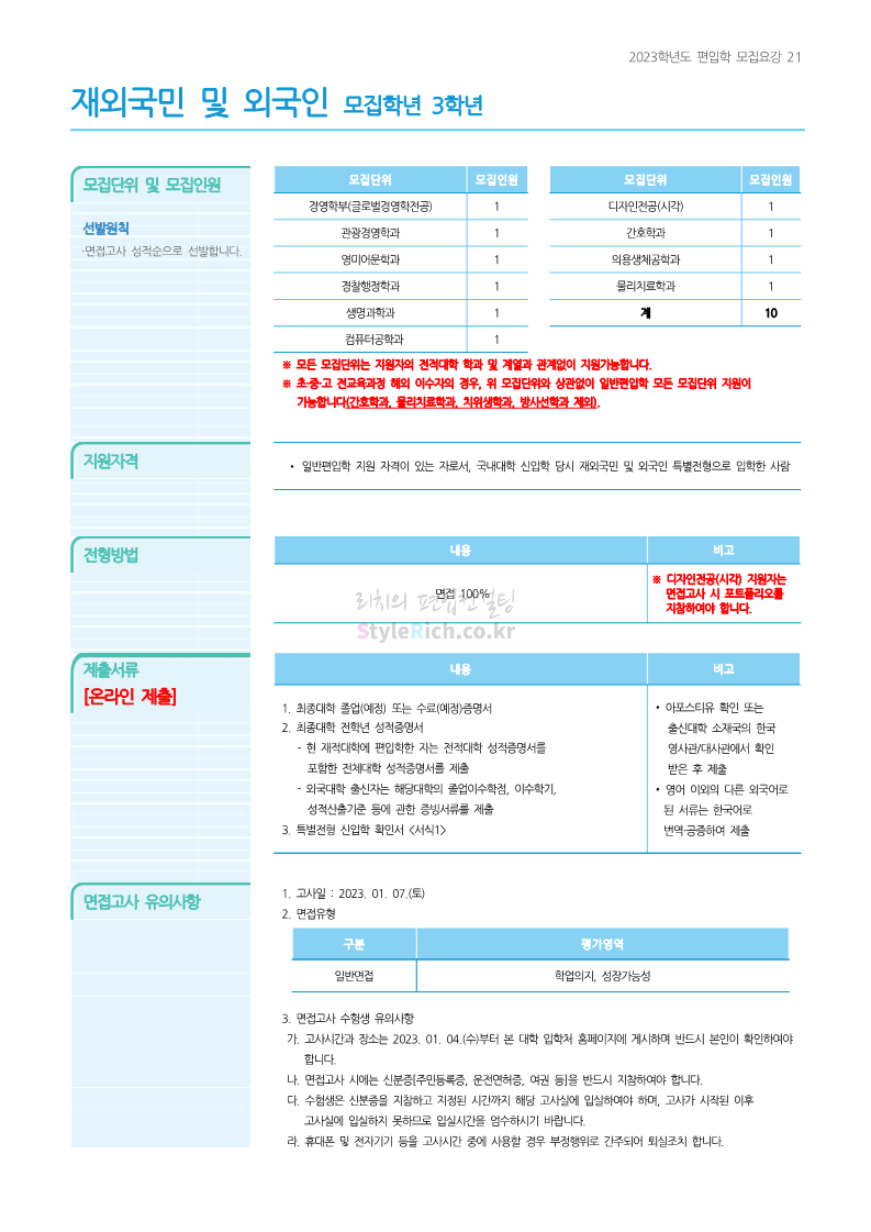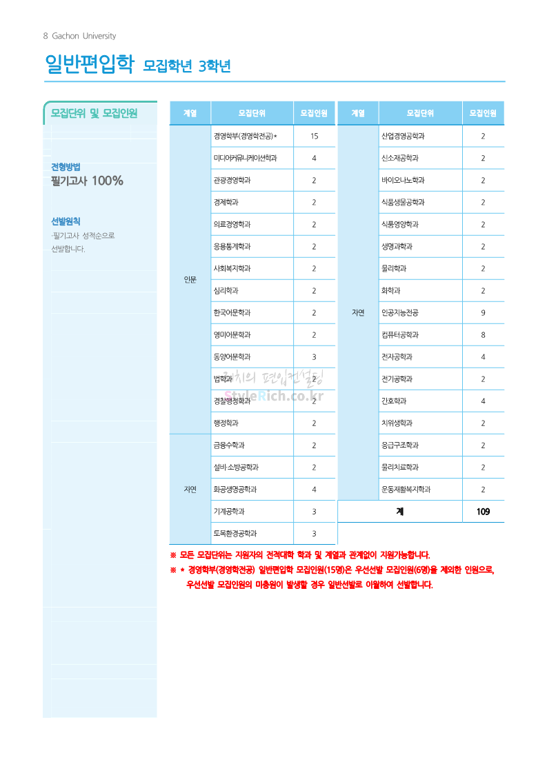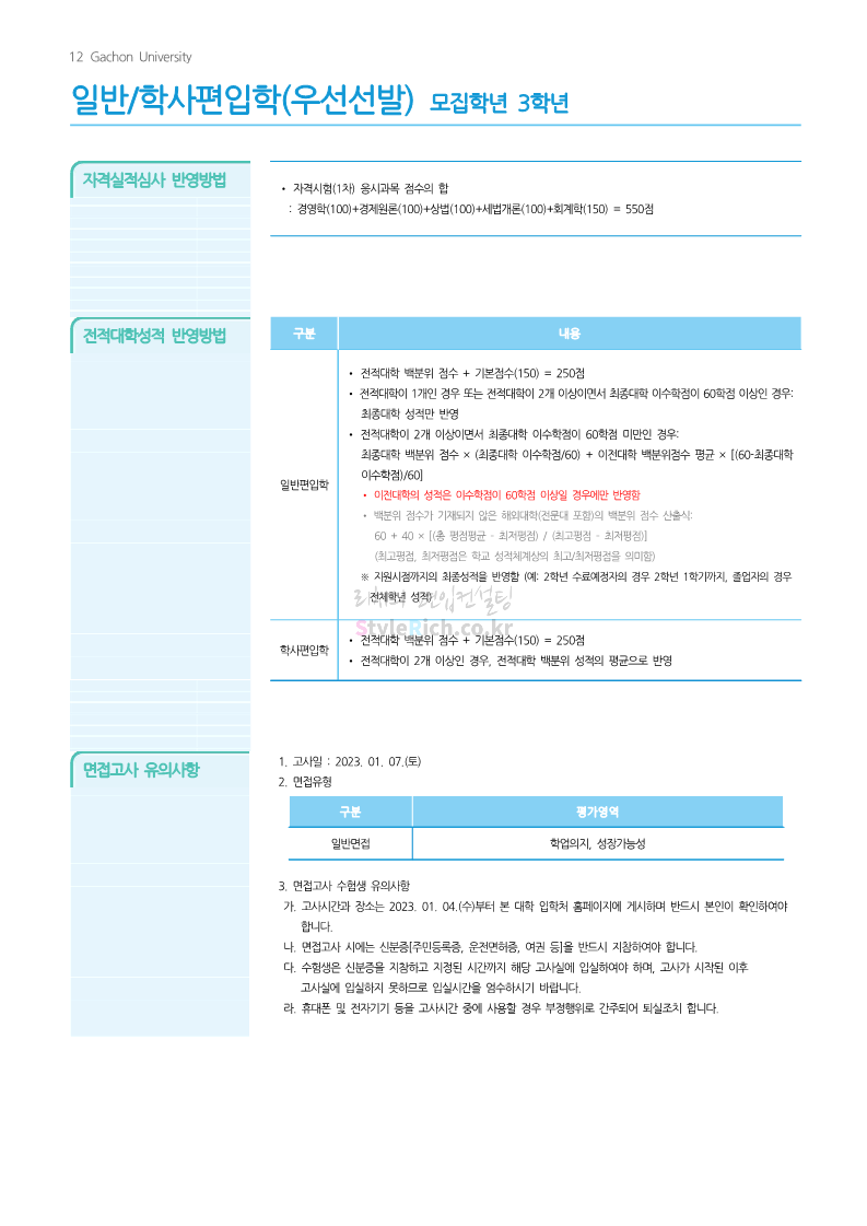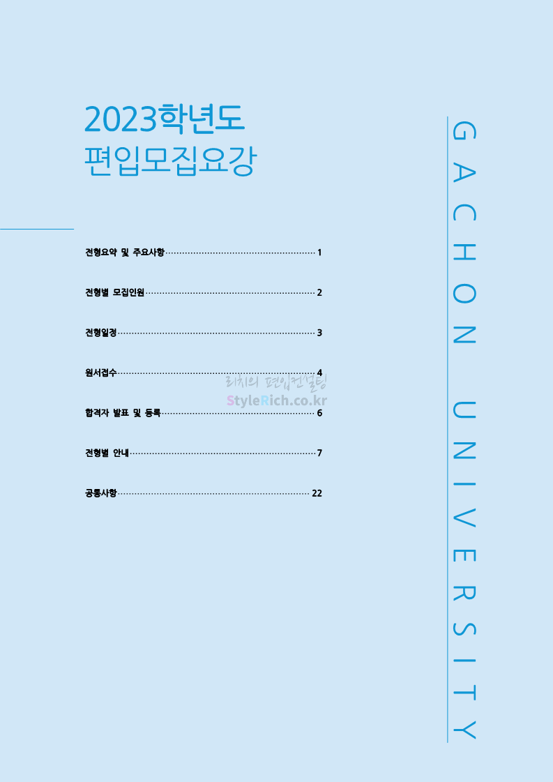 가천대 편입 2023학년도 모집요강 간편하게 보자! 2022.11.20 15:25 편입 모집요강/2023학년도 모집요강 2023학년도 가천대 편입 모집요강(2022.11.22 기준)을 간편하게 확인하세요. * 최종 모집요강 발표 이후에도 내용의 일부가 변경될 수 있으니 지원 전 반드시 가천대 입학처의 모집요강을 확인 바랍니다. 가천대 편입 최신 모집요강 확인하기 <출처: 가천대> 공유하기 게시글 관리 리치의 편입컨설팅 저작자표시 비영리 변경금지 (새창열림) '편입 모집요강 > 2023학년도 모집요강' 카테고리의 다른 글 광운대 편입 2023학년도 모집요강 간편하게 보자! (0) 2022.11.29 한국항공대 편입 2023학년도 모집요강 간편하게 보자! (0) 2022.11.25 단국대(천안) 편입 2023학년도 모집요강 간편하게 보자! (0) 2022.11.24 단국대(죽전) 편입 2023학년도 모집요강 간편하게 보자! (0) 2022.11.24 고려대 편입 2023학년도 자연계 필기고사 출제범위 및 참고도서를 알아보자! (0) 2022.11.20 댓글 공유하기 다른 글 댓글 이 글 공유하기 구독하기 구독하기 카카오톡 카카오톡 라인 라인 트위터 트위터 Facebook Facebook 카카오스토리 카카오스토리 밴드 밴드 네이버 블로그 네이버 블로그 Pocket Pocket Evernote Evernote 다른 글 한국항공대 편입 2023학년도 모집요강 간편하게 보자! 한국항공대 편입 2023학년도 모집요강 간편하게 보자! 2022.11.25 단국대(천안) 편입 2023학년도 모집요강 간편하게 보자! 단국대(천안) 편입 2023학년도 모집요강 간편하게 보자! 2022.11.24 단국대(죽전) 편입 2023학년도 모집요강 간편하게 보자! 단국대(죽전) 편입 2023학년도 모집요강 간편하게 보자! 2022.11.24 고려대 편입 2023학년도 자연계 필기고사 출제범위 및 참고도서를 알아보자! 고려대 편입 2023학년도 자연계 필기고사 출제범위 및 참고도서를 알아보자! 2022.11.20 다른 글 더 둘러보기