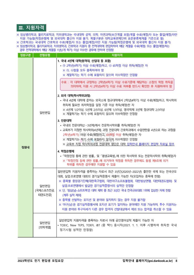 단국대(천안) 편입 2023학년도 모집요강 간편하게 보자! 2022.11.24 01:02 편입 모집요강/2023학년도 모집요강 2023학년도 단국대(천안) 편입 모집요강(2022.11.23 기준)을 간편하게 확인하세요. * 최종 모집요강 발표 이후에도 내용의 일부가 변경될 수 있으니 지원 전 반드시 단국대 입학처의 모집요강을 확인 바랍니다. 2023학년도 단국대(천안) 편입 최신 모집요강 확인하기 <출처: 단국대> 공유하기 게시글 관리 리치의 편입컨설팅 저작자표시 비영리 변경금지 (새창열림) '편입 모집요강 > 2023학년도 모집요강' 카테고리의 다른 글 광운대 편입 2023학년도 모집요강 간편하게 보자! (0) 2022.11.29 한국항공대 편입 2023학년도 모집요강 간편하게 보자! (0) 2022.11.25 단국대(죽전) 편입 2023학년도 모집요강 간편하게 보자! (0) 2022.11.24 고려대 편입 2023학년도 자연계 필기고사 출제범위 및 참고도서를 알아보자! (0) 2022.11.20 가천대 편입 2023학년도 모집요강 간편하게 보자! (0) 2022.11.20 댓글 공유하기 다른 글 댓글 이 글 공유하기 구독하기 구독하기 카카오톡 카카오톡 라인 라인 트위터 트위터 Facebook Facebook 카카오스토리 카카오스토리 밴드 밴드 네이버 블로그 네이버 블로그 Pocket Pocket Evernote Evernote 다른 글 광운대 편입 2023학년도 모집요강 간편하게 보자! 광운대 편입 2023학년도 모집요강 간편하게 보자! 2022.11.29 한국항공대 편입 2023학년도 모집요강 간편하게 보자! 한국항공대 편입 2023학년도 모집요강 간편하게 보자! 2022.11.25 단국대(죽전) 편입 2023학년도 모집요강 간편하게 보자! 단국대(죽전) 편입 2023학년도 모집요강 간편하게 보자! 2022.11.24 고려대 편입 2023학년도 자연계 필기고사 출제범위 및 참고도서를 알아보자! 고려대 편입 2023학년도 자연계 필기고사 출제범위 및 참고도서를 알아보자! 2022.11.20 다른 글 더 둘러보기