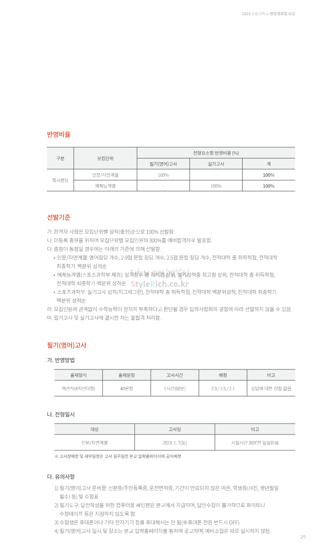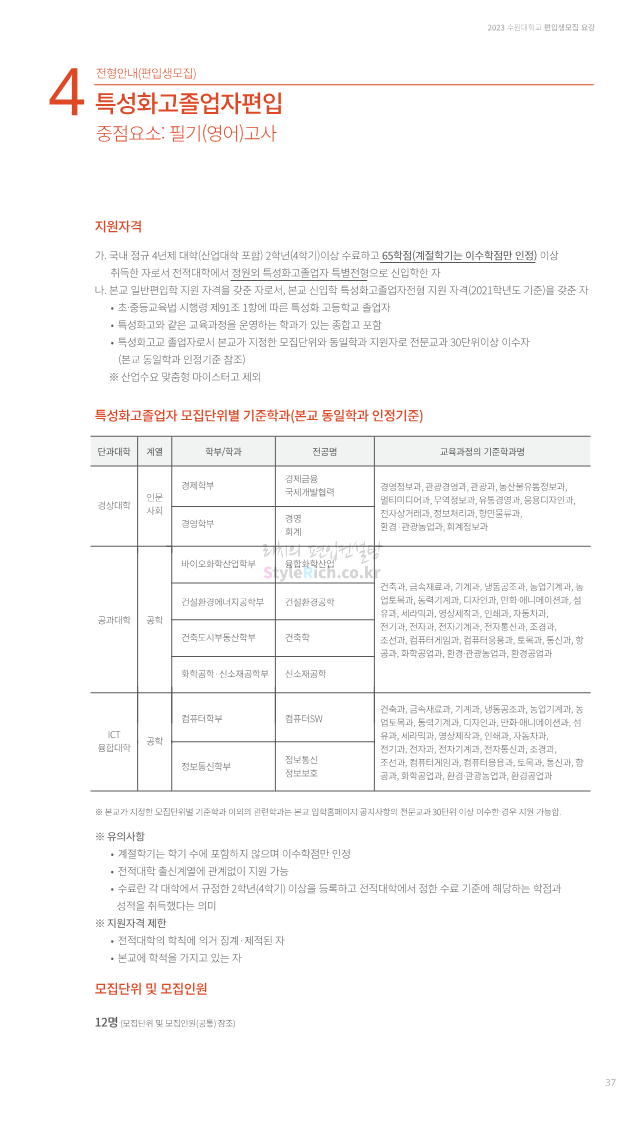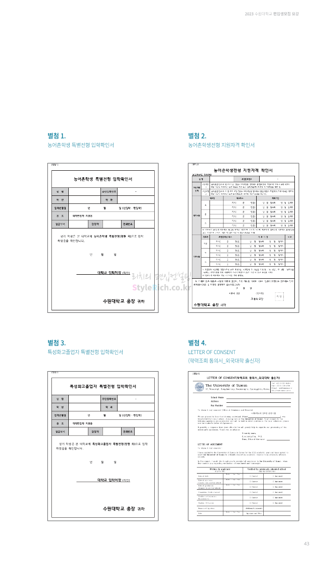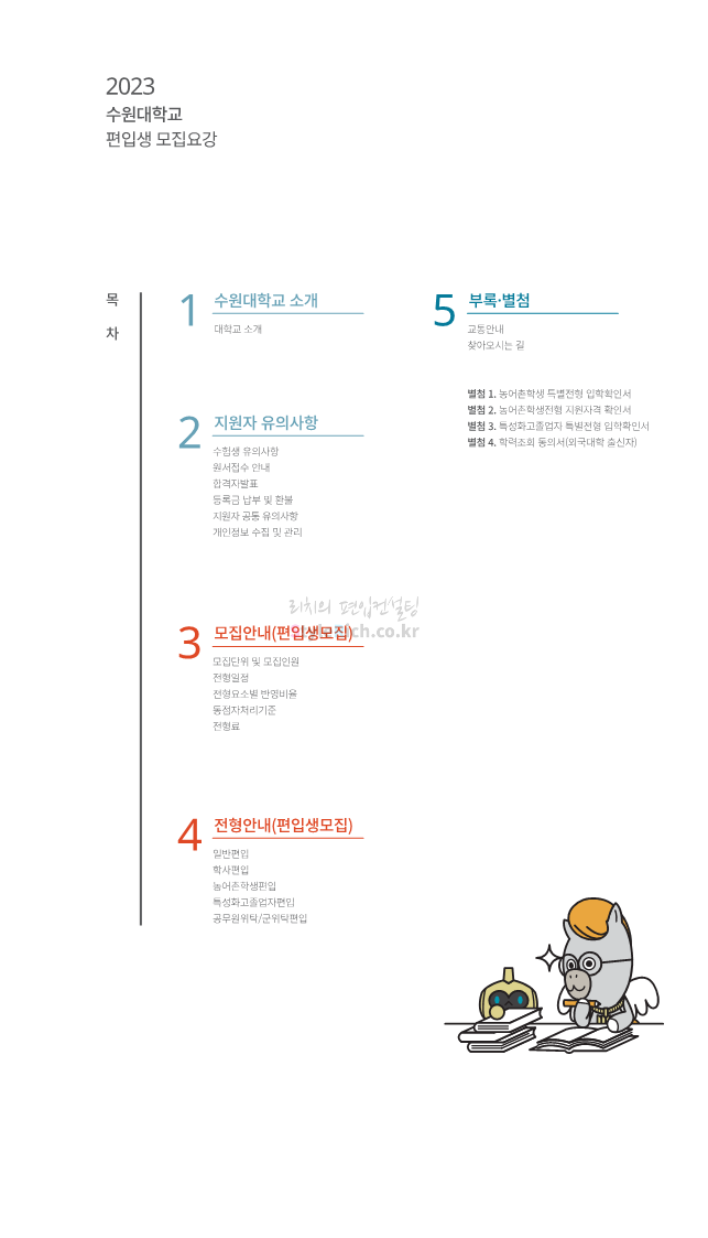 수원대 편입 2023학년도 모집요강 간편하게 보자! 2022.11.29 01:40 편입 모집요강/2023학년도 모집요강 2023학년도 수원대 편입 모집요강(2022.11.28 기준)을 간편하게 확인하세요. * 최종 모집요강 발표 이후에도 내용의 일부가 변경될 수 있으니 지원 전 반드시 수원대 입학처의 모집요강을 확인 바랍니다. 수원대 편입 최신 모집요강 확인하기 <출처: 수원대> 공유하기 게시글 관리 리치의 편입컨설팅 저작자표시 비영리 변경금지 (새창열림) '편입 모집요강 > 2023학년도 모집요강' 카테고리의 다른 글 건국대 편입 2023학년도 모집요강 간편하게 보자! (0) 2022.11.30 강남대 편입 2023학년도 모집요강 간편하게 보자! (0) 2022.11.29 광운대 편입 2023학년도 모집요강 간편하게 보자! (0) 2022.11.29 한국항공대 편입 2023학년도 모집요강 간편하게 보자! (0) 2022.11.25 단국대(천안) 편입 2023학년도 모집요강 간편하게 보자! (0) 2022.11.24 댓글 공유하기 다른 글 댓글 이 글 공유하기 구독하기 구독하기 카카오톡 카카오톡 라인 라인 트위터 트위터 Facebook Facebook 카카오스토리 카카오스토리 밴드 밴드 네이버 블로그 네이버 블로그 Pocket Pocket Evernote Evernote 다른 글 건국대 편입 2023학년도 모집요강 간편하게 보자! 건국대 편입 2023학년도 모집요강 간편하게 보자! 2022.11.30 강남대 편입 2023학년도 모집요강 간편하게 보자! 강남대 편입 2023학년도 모집요강 간편하게 보자! 2022.11.29 광운대 편입 2023학년도 모집요강 간편하게 보자! 광운대 편입 2023학년도 모집요강 간편하게 보자! 2022.11.29 한국항공대 편입 2023학년도 모집요강 간편하게 보자! 한국항공대 편입 2023학년도 모집요강 간편하게 보자! 2022.11.25 다른 글 더 둘러보기