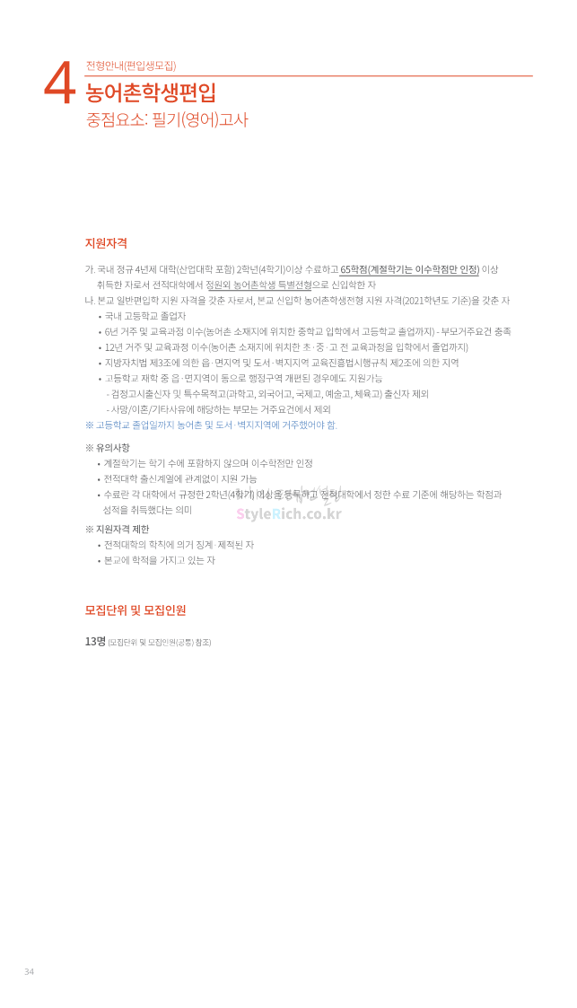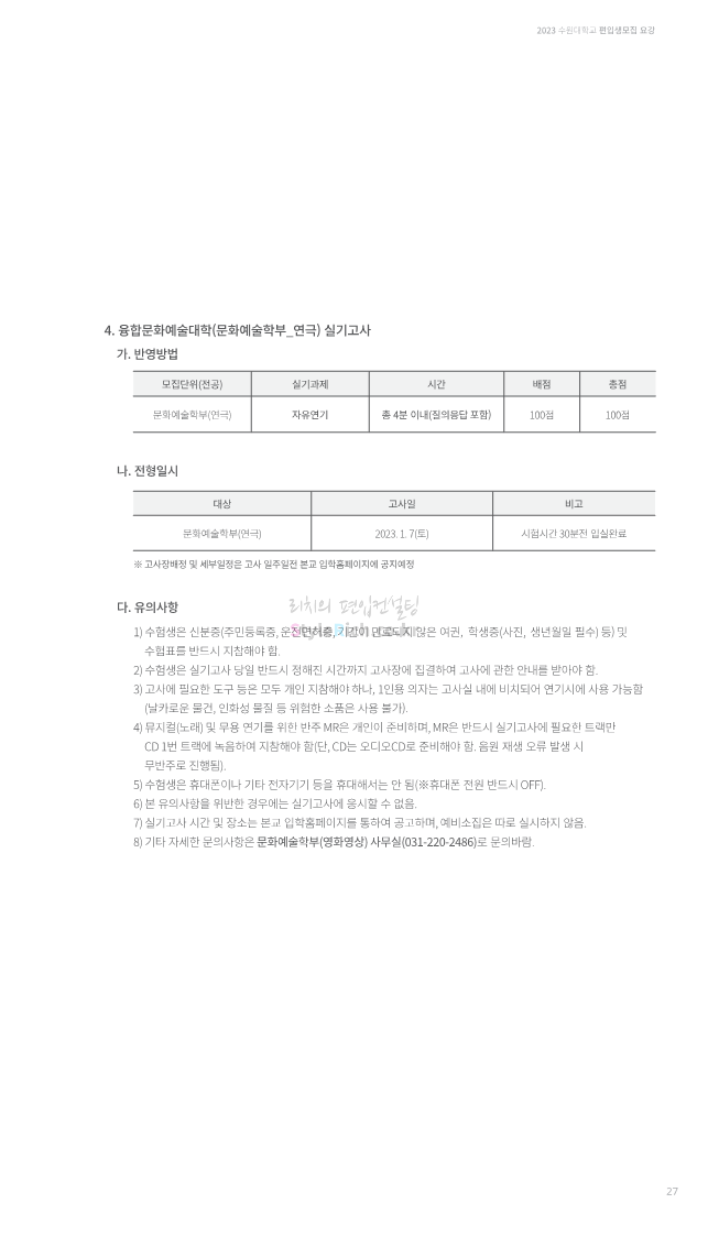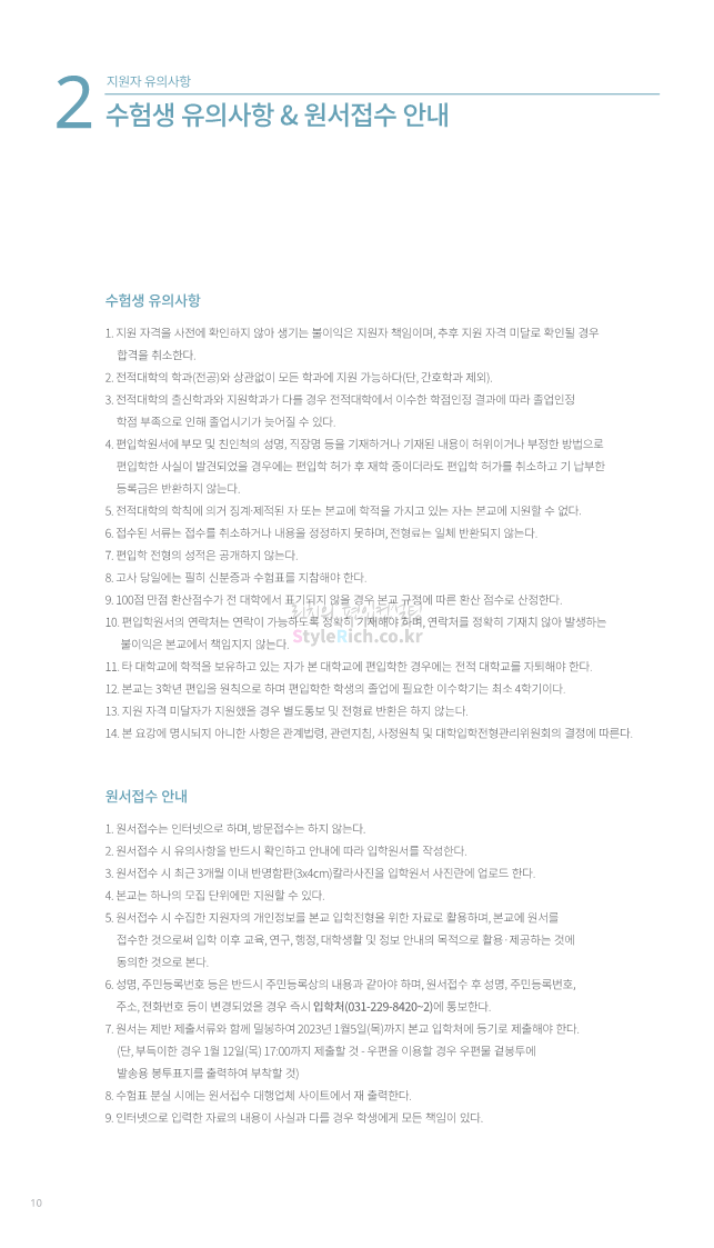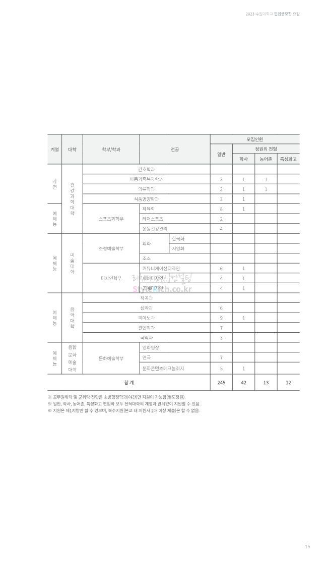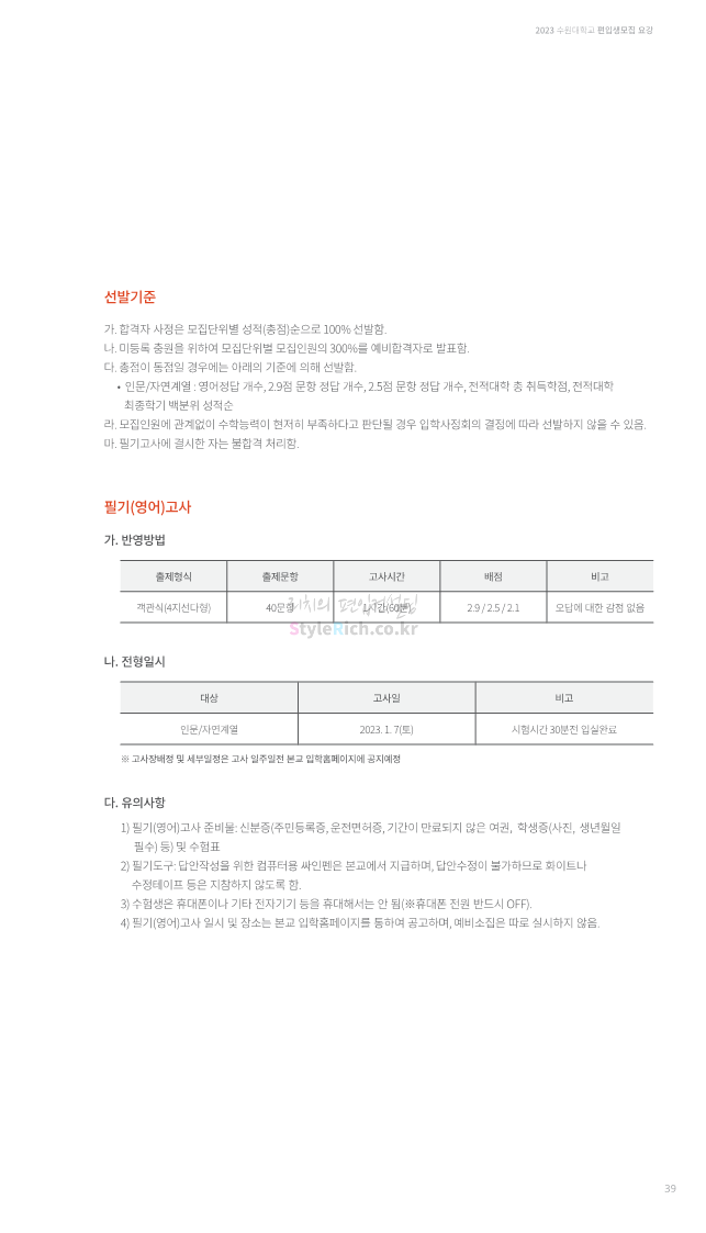수원대 편입 2023학년도 모집요강 간편하게 보자! 2022.11.29 01:40 편입 모집요강/2023학년도 모집요강 2023학년도 수원대 편입 모집요강(2022.11.28 기준)을 간편하게 확인하세요. * 최종 모집요강 발표 이후에도 내용의 일부가 변경될 수 있으니 지원 전 반드시 수원대 입학처의 모집요강을 확인 바랍니다. 수원대 편입 최신 모집요강 확인하기 <출처: 수원대> 공유하기 게시글 관리 리치의 편입컨설팅 저작자표시 비영리 변경금지 (새창열림) '편입 모집요강 > 2023학년도 모집요강' 카테고리의 다른 글 건국대 편입 2023학년도 모집요강 간편하게 보자! (0) 2022.11.30 강남대 편입 2023학년도 모집요강 간편하게 보자! (0) 2022.11.29 광운대 편입 2023학년도 모집요강 간편하게 보자! (0) 2022.11.29 한국항공대 편입 2023학년도 모집요강 간편하게 보자! (0) 2022.11.25 단국대(천안) 편입 2023학년도 모집요강 간편하게 보자! (0) 2022.11.24 댓글 공유하기 다른 글 댓글 이 글 공유하기 구독하기 구독하기 카카오톡 카카오톡 라인 라인 트위터 트위터 Facebook Facebook 카카오스토리 카카오스토리 밴드 밴드 네이버 블로그 네이버 블로그 Pocket Pocket Evernote Evernote 다른 글 건국대 편입 2023학년도 모집요강 간편하게 보자! 건국대 편입 2023학년도 모집요강 간편하게 보자! 2022.11.30 강남대 편입 2023학년도 모집요강 간편하게 보자! 강남대 편입 2023학년도 모집요강 간편하게 보자! 2022.11.29 광운대 편입 2023학년도 모집요강 간편하게 보자! 광운대 편입 2023학년도 모집요강 간편하게 보자! 2022.11.29 한국항공대 편입 2023학년도 모집요강 간편하게 보자! 한국항공대 편입 2023학년도 모집요강 간편하게 보자! 2022.11.25 다른 글 더 둘러보기