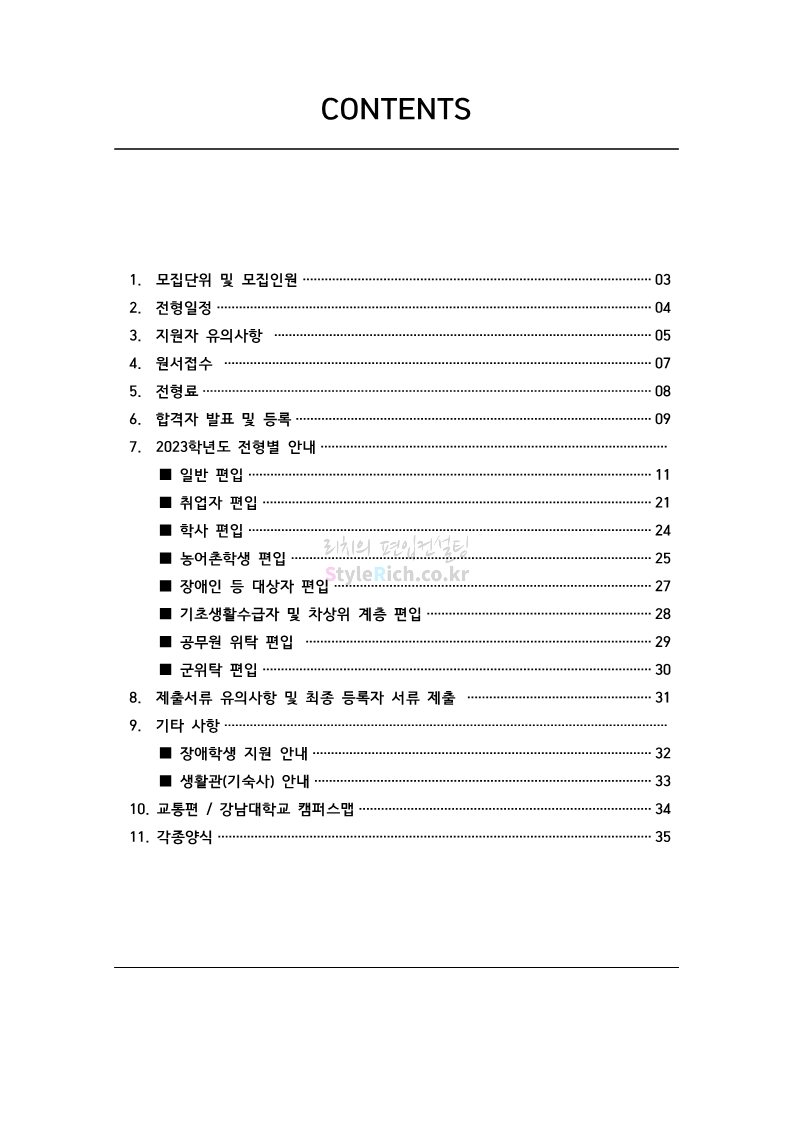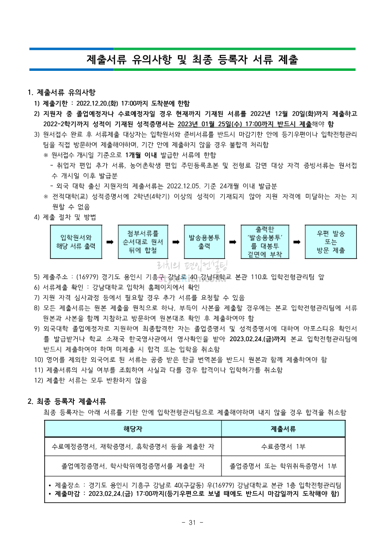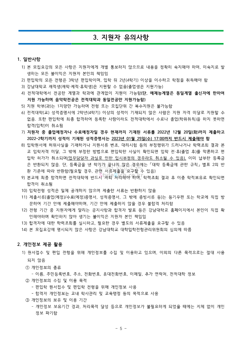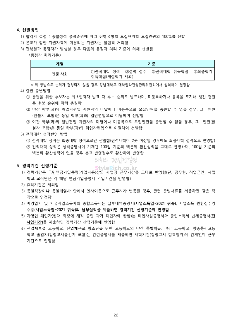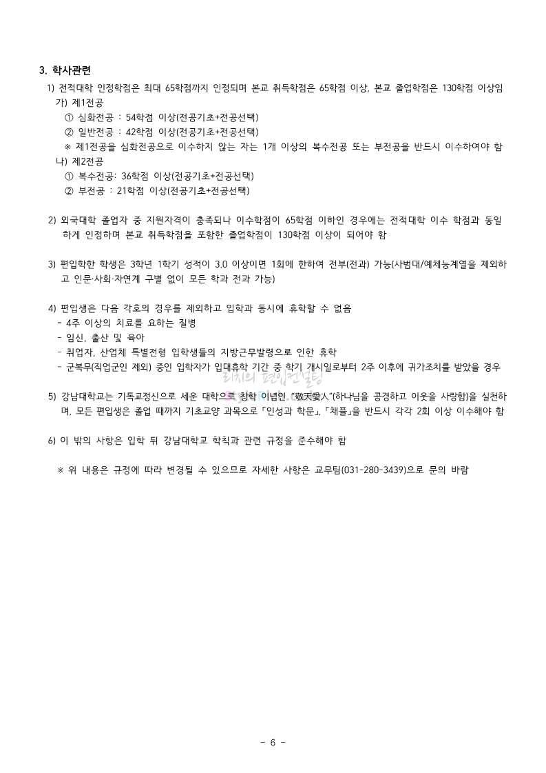강남대 편입 2023학년도 모집요강 간편하게 보자! 2022.11.29 23:45 편입 모집요강/2023학년도 모집요강 2023학년도 강남대 편입 모집요강(2022.11.29 기준)을 간편하게 확인하세요. * 최종 모집요강 발표 이후에도 내용의 일부가 변경될 수 있으니 지원 전 반드시 강남대 입학처의 모집요강을 확인 바랍니다. 강남대 편입 최신 모집요강 확인하기 <출처: 강남대> 공유하기 게시글 관리 리치의 편입컨설팅 저작자표시 비영리 변경금지 (새창열림) '편입 모집요강 > 2023학년도 모집요강' 카테고리의 다른 글 국민대 편입 2023학년도 모집요강 간편하게 보자! (0) 2022.11.30 건국대 편입 2023학년도 모집요강 간편하게 보자! (0) 2022.11.30 수원대 편입 2023학년도 모집요강 간편하게 보자! (0) 2022.11.29 광운대 편입 2023학년도 모집요강 간편하게 보자! (0) 2022.11.29 한국항공대 편입 2023학년도 모집요강 간편하게 보자! (0) 2022.11.25 댓글 공유하기 다른 글 댓글 이 글 공유하기 구독하기 구독하기 카카오톡 카카오톡 라인 라인 트위터 트위터 Facebook Facebook 카카오스토리 카카오스토리 밴드 밴드 네이버 블로그 네이버 블로그 Pocket Pocket Evernote Evernote 다른 글 국민대 편입 2023학년도 모집요강 간편하게 보자! 국민대 편입 2023학년도 모집요강 간편하게 보자! 2022.11.30 건국대 편입 2023학년도 모집요강 간편하게 보자! 건국대 편입 2023학년도 모집요강 간편하게 보자! 2022.11.30 수원대 편입 2023학년도 모집요강 간편하게 보자! 수원대 편입 2023학년도 모집요강 간편하게 보자! 2022.11.29 광운대 편입 2023학년도 모집요강 간편하게 보자! 광운대 편입 2023학년도 모집요강 간편하게 보자! 2022.11.29 다른 글 더 둘러보기