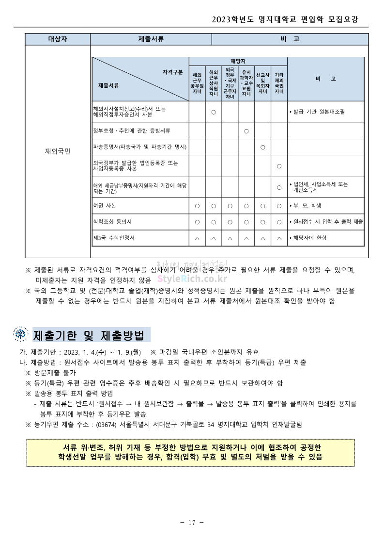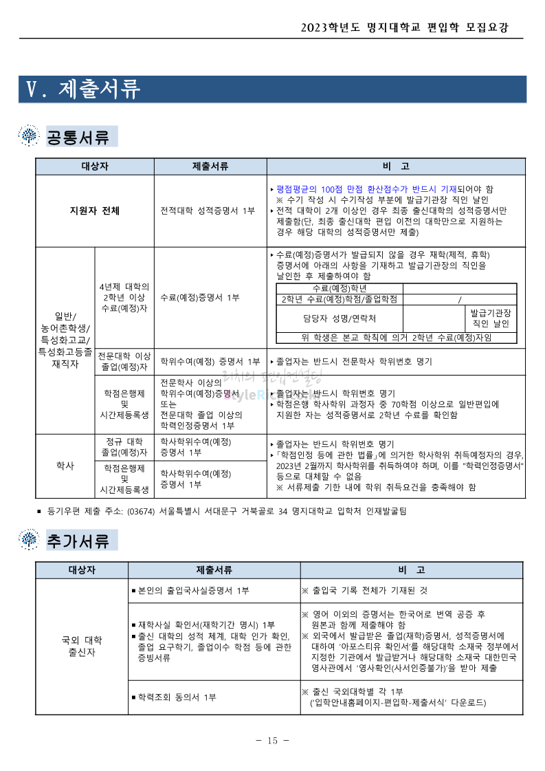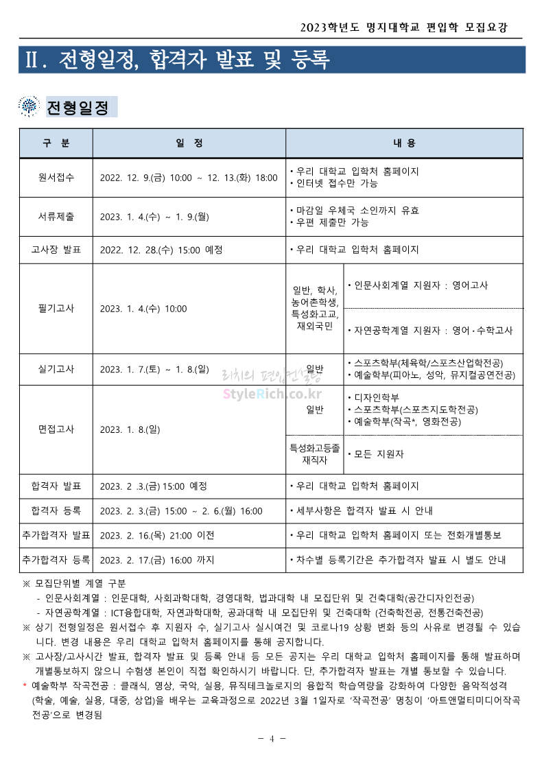 명지대 편입 2023학년도 모집요강 간편하게 보자! 2022.11.30 00:53 편입 모집요강/2023학년도 모집요강 2023학년도 명지대 편입 모집요강(2022.11.29 기준)을 간편하게 확인하세요. * 최종 모집요강 발표 이후에도 내용의 일부가 변경될 수 있으니 지원 전 반드시 명지대 입학처를 확인 바랍니다. 명지대 편입 최신 모집요강 확인하기 <출처: 명지대> 공유하기 게시글 관리 리치의 편입컨설팅 저작자표시 비영리 변경금지 (새창열림) '편입 모집요강 > 2023학년도 모집요강' 카테고리의 다른 글 연세대(미래) 편입 2023학년도 모집요강 간편하게 보자! (0) 2022.11.30 연세대 편입 2023학년도 모집요강 간편하게 보자! (0) 2022.11.30 국민대 편입 2023학년도 모집요강 간편하게 보자! (0) 2022.11.30 건국대 편입 2023학년도 모집요강 간편하게 보자! (0) 2022.11.30 강남대 편입 2023학년도 모집요강 간편하게 보자! (0) 2022.11.29 댓글 공유하기 다른 글 댓글 이 글 공유하기 구독하기 구독하기 카카오톡 카카오톡 라인 라인 트위터 트위터 Facebook Facebook 카카오스토리 카카오스토리 밴드 밴드 네이버 블로그 네이버 블로그 Pocket Pocket Evernote Evernote 다른 글 연세대(미래) 편입 2023학년도 모집요강 간편하게 보자! 연세대(미래) 편입 2023학년도 모집요강 간편하게 보자! 2022.11.30 연세대 편입 2023학년도 모집요강 간편하게 보자! 연세대 편입 2023학년도 모집요강 간편하게 보자! 2022.11.30 국민대 편입 2023학년도 모집요강 간편하게 보자! 국민대 편입 2023학년도 모집요강 간편하게 보자! 2022.11.30 건국대 편입 2023학년도 모집요강 간편하게 보자! 건국대 편입 2023학년도 모집요강 간편하게 보자! 2022.11.30 다른 글 더 둘러보기